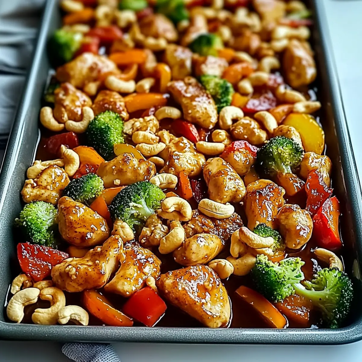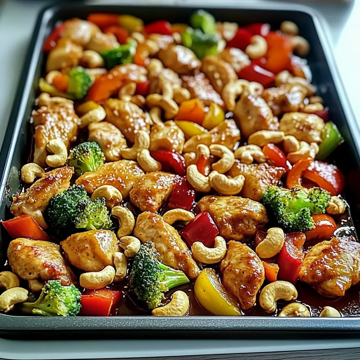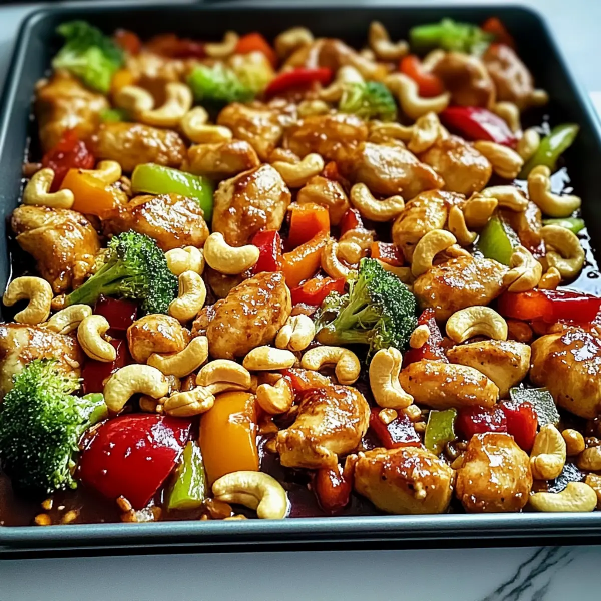 Jump to Recipe Print RecipeThe aroma of sweet, savory chicken mingling with the crunch of roasted cashews takes me back to those bustling weeknight dinner moments when time felt tight but good food was still a priority. My Easy Sheet Pan Cashew Chicken is here to rescue your evenings too! With just 25 minutes of cook time and minimal cleanup, this quick and flavorful meal transforms fresh bell peppers and succulent chicken into a vibrant dinner that’s both satisfying and stress-free. Plus, it’s gluten-free and perfect for meal prep, making it a versatile dish you can adapt to fit your pantry or dietary needs. Are you ready to bring some excitement back to your weeknight meals? Let’s dive into this deliciously easy recipe! Why is Sheet Pan Cashew Chicken Amazing? Simplicity: This recipe is a breeze to make, perfect for those busy weeknights when you need dinner on the table fast. Flavor Explosion: The combination of sweet honey, nutty cashews, and tender chicken creates a dish packed with deliciousness. Versatile Variations: Switch up the veggies or try different nuts for a unique twist every time! Meal Prep-Friendly: Make it ahead and enjoy leftovers for easy lunches—just reheat and relish! Gluten-Free Options: Easily adapt with tamari for a flavorful, gluten-free meal that everyone can enjoy. Crowd-Pleaser: It’s a dish that appeals to both kids and adults, ensuring happy faces around the table. Sheet Pan Cashew Chicken Ingredients For the Chicken • Boneless Chicken Breasts or Thighs – These cuts are preferred for their tenderness and quick cooking time. For the Vegetables • Bell Peppers – A mix of red and green adds sweetness and color; feel free to use yellow or orange too! • Red Onion – Adds a layer of sweetness and depth; yellow onion works as a substitute if needed. For the Marinade • Soy Sauce – Forms the savory base; use tamari for a gluten-free option! • Honey – Balances flavors and encourages caramelization; maple syrup works for a vegan alternative. • Rice Vinegar – Adds acidity for balance; can substitute with white wine vinegar or apple cider vinegar. • Toasted Sesame Oil – Brings a nutty flavor; omit if unavailable. Aromatics • Garlic – Fresh gives the best flavor; powdered may substitute in a pinch. • Ginger – Fresh ginger offers the most aromatic depth; dried can be used if necessary. For Topping • Unsalted Cashews – The star nut giving crunch; almonds or peanuts can be great substitutes! • Cilantro – A fresh, flavorful garnish that brightens the dish; optional but recommended! Seasoning • Salt & Pepper – Essential for perfect seasoning; adjust according to your taste! Step‑by‑Step Instructions for Sheet Pan Cashew Chicken Step 1: Preheat the Oven Begin by preheating your oven to 400°F (200°C). This ensures a hot cooking environment that will help your chicken and vegetables achieve that delightful golden-brown color. While the oven heats up, gather your ingredients and get ready for the flavorful fun ahead! Step 2: Prepare the Marinade In a medium bowl, whisk together the soy sauce, honey, rice vinegar, toasted sesame oil, minced garlic, and grated ginger until well combined. This savory marinade is the heart of your Sheet Pan Cashew Chicken, adding depth and flavor as it melds into the chicken. Set aside a small portion for drizzling later! Step 3: Marinate the Chicken Add your chunks of boneless chicken to the marinade, ensuring each piece is thoroughly coated in this flavorful mixture. Cover the bowl and let the chicken marinate for at least 15 minutes. For an even richer taste, allow it to soak for up to 4 hours in the fridge—that way, every bite bursts with flavor. Step 4: Assemble the Sheet Pan Line a large sheet pan with parchment paper for easy cleanup. Spread the marinated chicken across the sheet pan in a single layer, creating room for the vegetables. Then, scatter your colorful bell pepper slices and red onion around the chicken, ensuring a vibrant mix. Drizzle the reserved marinade over everything and sprinkle generously with salt and pepper. Step 5: Bake the Chicken and Vegetables Carefully place the sheet pan in your preheated oven, baking for 20 minutes. During this time, the chicken will begin to cook and the vegetables will soften, filling your kitchen with mouth-watering aromas. Keep an eye out for the chicken to turn a golden hue and the vegetables to become tender. Step 6: Add the Cashews Once the initial baking time is up, remove the pan from the oven and give the chicken and veggies a gentle stir. Sprinkle the unsalted cashews over the top, letting their crunch complement the tender chicken and vegetables. This extra step adds a delightful texture that will elevate your Sheet Pan Cashew Chicken. Step 7: Finish Baking Return the pan to the oven and bake for an additional 10–15 minutes, or until the chicken reaches an internal temperature of 165°F (74°C) and the vegetables are tender. During this time, the cashews will toast slightly, enhancing their flavor and crunch. Step 8: Rest and Serve After baking, let the sheet pan sit for about 5 minutes to allow the juices to redistribute. This resting period enhances the overall taste of your dish. When ready, serve your vibrant Sheet Pan Cashew Chicken with freshly garished cilantro for that extra pop of flavor and color! What to Serve with Sheet Pan Cashew Chicken Set the stage for a delightful family dinner with vibrant sides that elevate your flavorful main dish. Fluffy Jasmine Rice: The perfect medium to soak up the savory sauce, jasmine rice adds a fragrant touch to your meal. Cauliflower Rice: A low-carb alternative that provides a subtle base without overpowering the lovely flavors of the chicken. Zucchini Noodles: For a fresh, gluten-free twist, spiralized zucchini adds a light, crunchy texture that complements the dish beautifully. Steamed Broccoli: Crisp-tender broccoli adds a pop of color and nutrition while its mild flavor ba