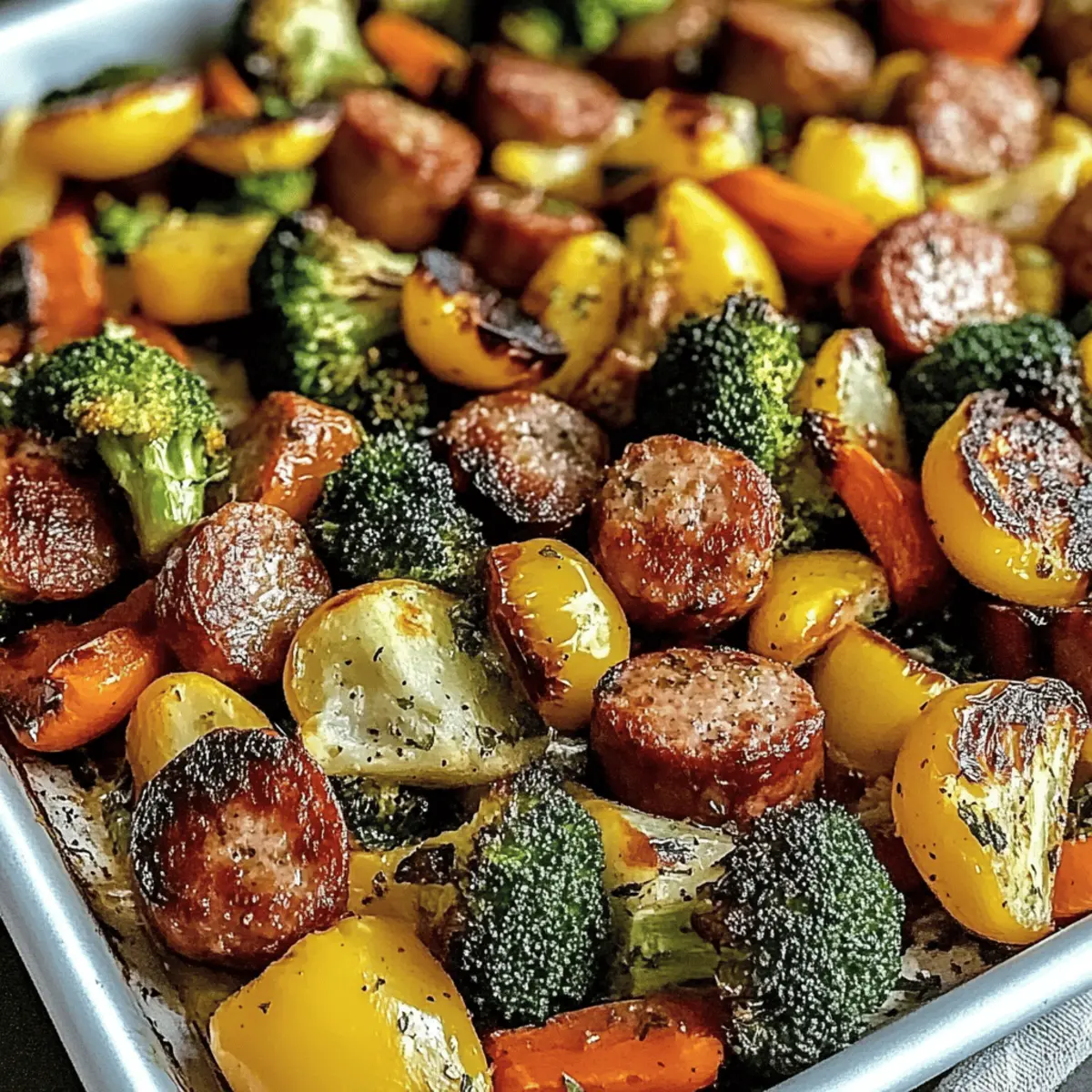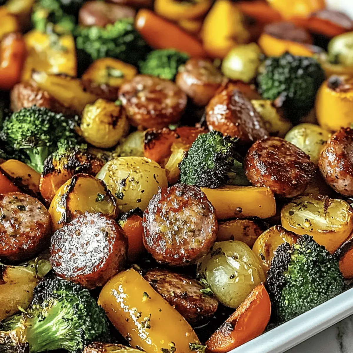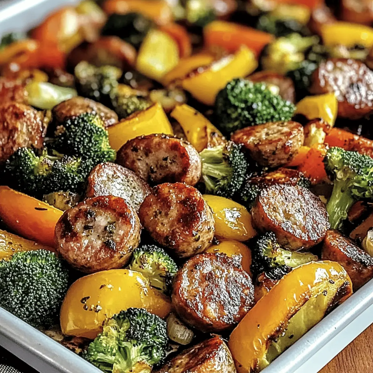 Jump to Recipe Print RecipeAs the scent of savory Italian sausage wafts through the air, I can’t help but feel a wave of comfort wash over me. This Sheet Pan Sausage & Veggies recipe has become my go-to for those hectic weeknights when time is tight but I still crave a satisfying home-cooked meal. The beauty of this dish lies in its versatility—you can customize it with whatever fresh vegetables are tickling your fancy or are in season. Plus, it’s a one-pan meal, making cleanup a breeze! Not only does it taste delicious, but it also brings my family together around the dinner table, all with minimal effort. Curious how to whip up this vibrant Italian delight in no time? Let’s dive into the recipe! Why Choose Sheet Pan Sausage & Veggies? Simplicity at Its Best: This one-pan meal makes cooking so easy, requiring minimal prep time and cleanup. Customizable Delight: Use any combination of seasonal veggies; it’s a canvas for your creativity! Flavor Explosion: The savory sausage and roasted vegetables create a mouthwatering medley that your family will adore. Quick and Satisfying: Perfect for busy weeknights, you’ll have a delicious dinner ready in just 30-35 minutes. Family-Friendly Appeal: Kids and adults alike will love it, making it an instant favorite at the dinner table. Don’t forget to pair it with some crusty bread or a refreshing salad for a complete meal experience! Sheet Pan Sausage & Veggies Ingredients • Here’s what you’ll need for this delicious meal. For the Sausage Italian Sausage – Provides the core savory flavor; chicken sausage can be used for a lighter option. For the Vegetables Bell Peppers – Add sweetness and vibrant color; any color works beautifully, or substitute zucchini for a different texture. Red Onion – Offers aromatic flavor; yellow onion can be substituted for a milder taste. Broccoli Florets – Contributes crunch and nutrition; cauliflower is a great low-carb substitute. Zucchini – Provides freshness and moist texture; swap with summer squash for similar results. Baby Potatoes – Adds hearty substance; use small, even-sized potatoes for consistent cooking. For the Seasoning Olive Oil – Essential for roasting and flavor; avocado oil can be used for a higher smoke point. Garlic Powder – Enhances flavor depth; fresh minced garlic can replace it for a more potent taste. Onion Powder – Boosts the overall flavor; feel free to increase this if using fresh onions. Paprika – Adds warmth and color; smoked paprika can deepen the flavor experience. Salt and Pepper – Essential seasonings for taste; adjust according to preference. For Garnish Fresh Parsley – Optional garnish for a pop of color and freshness; it adds that final touch to your vibrant dish! Ready to create a mouthwatering Sheet Pan Sausage & Veggies? Let’s keep this cooking adventure going! Step‑by‑Step Instructions for Sheet Pan Sausage & Veggies Step 1: Preheat Oven Begin by preheating your oven to 400°F (200°C). This temperature ensures the perfect roasting environment for your Sheet Pan Sausage & Veggies, allowing the flavors to meld beautifully and the vegetables to caramelize. While the oven heats up, you’ll have time to prepare your fresh vegetables! Step 2: Prepare Vegetables Wash and chop your bell peppers, red onion, broccoli, and zucchini into bite-sized pieces. For even cooking, halve the baby potatoes so they roast uniformly alongside the vibrant array of veggies. Arrange your chopped vegetables on a cutting board, and take a moment to admire their colors as you prepare for the next step. Step 3: Add Sausage Once your veggies are prepped, slice the Italian sausage into bite-sized pieces. Mix the sausage pieces gently into your bowl of prepared vegetables, allowing the savory flavors to begin mingling. The goal is to distribute the sausage evenly for a delightful bite in each forkful of the Sheet Pan Sausage & Veggies. Step 4: Season Drizzle a generous amount of olive oil over the sausage and vegetable mixture, ensuring everything gets a lovely coating. Sprinkle garlic powder, onion powder, paprika, salt, and pepper on top. Toss everything together thoroughly, making sure every piece is well-coated in the seasonings to maximize flavor as they roast. Step 5: Arrange on Pan Transfer the seasoned mixture onto a large sheet pan, spreading it out in a single layer. This step is crucial for achieving that crispy, roasted texture, allowing heat to circulate evenly. Take a moment to appreciate how colorful this Sheet Pan Sausage & Veggies dish is before heading to the oven! Step 6: Bake Place the sheet pan in the preheated oven and let it roast for 30-35 minutes. Stir the mixture halfway through to ensure even cooking. You’re looking for golden-brown sausage and tender, slightly caramelized vegetables, which will create a delightful aroma in your kitchen as they roast. Step 7: Garnish & Serve Once the roasting time is completed, remove the pan from the oven and let it cool for a few minutes. To finish your Sheet Pan Sausage & Veggies, sprinkle fresh parsley over the dish for a pop of color and freshness. Serve this vibrant meal warm, and enjoy a delightful dinner with your loved ones! Make Ahead Options These Sheet Pan Sausage & Veggies are perfect for busy home cooks who appreciate the gift of meal prep! You can chop your vegetables and slice the sausage up to 24 hours in advance—just store them in an airtight container in the refrigerator. This will save you precious time during your weeknight cooking! For even greater convenience, you can prep the entire mixture and keep it stored for up to 3 days; when you’re ready to serve, simply spread it onto a sheet pan and roast as directed. To ensure everything stays fresh and tasty, toss your ingredients in olive oil and seasonings right before baking. Embrace the ease of make-ahead cooking with this delightful Sheet Pan Sausage & Veggies! Sheet Pan Sausage & Veggies Variations Feel free to get creative a