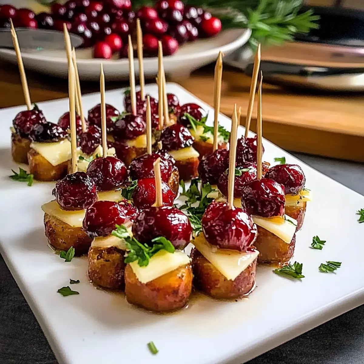 Insert a skewer through each assembled bite, ensuring a nice presentation and making them easy to pick up. Transfer the skewers to a serving platter for an inviting display. Garnish with snipped parsley for a pop of color, and serve with any remaining cranberry sauce on the side for those who love an extra dip.