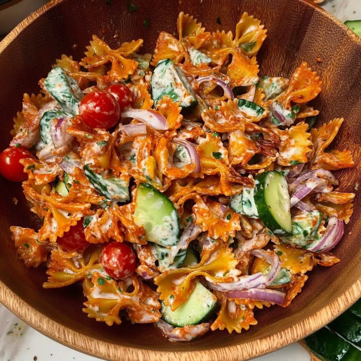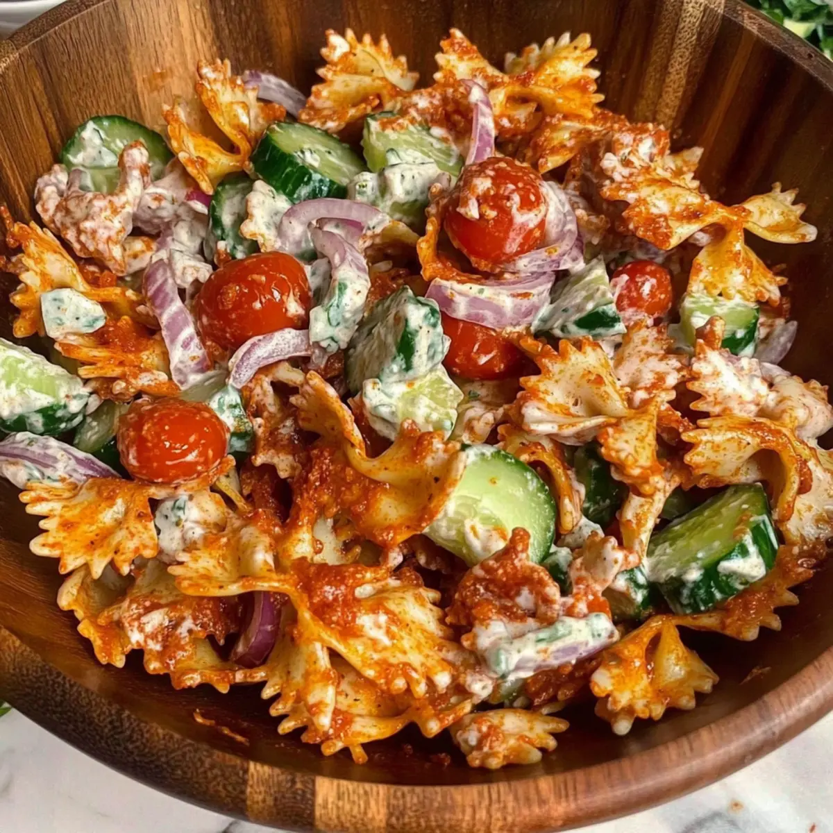 Jump to Recipe Print RecipeThe lively crunch of baked pasta redefines the classic summer salad—welcome to my Spicy Crispy Pasta Salad with Chili Crisp Yogurt Dressing! As I began experimenting with farfalle, the idea hit me: why not create a dish that combines both comforting pasta and refreshing garden veggies? The result is a perfect party pleaser that’s not only quick to prepare but also a fantastic way to showcase your skills in the kitchen. Picture crispy, golden pasta pieces mingling with juicy cucumbers and sweet cherry tomatoes, all tied together with a creamy, spicy dressing. This salad is your go-to recipe for cookouts and potlucks, leaving onlookers curious about your delicious secret! Ready to impress your friends with a unique twist on a beloved favorite? Let’s dive in! Why is this salad a game-changer? Unique Crunch: The crispy baked farfalle transforms traditional pasta salad into a texture sensation unlike any other. Flavor Explosion: A creamy chili crisp yogurt dressing elevates the dish with a delightful spice, giving it that extra kick everyone craves. Perfect for Gatherings: Ideal for summer cookouts or potlucks, this salad is sure to wow your guests and keep everyone coming back for more. Easy Prep: With simple steps, it’s a quick recipe that allows anyone to shine in the kitchen—perfect for those who love the homemade touch! Versatile Options: Customize it with your favorite veggies or proteins like baked tofu for an extra health boost, just like in a vibrant Rainbow Chicken Salad or a hearty Bowl Tahini Yogurt. Enjoy this refreshing dish that marries comfort and innovation—you’re going to love it! Spicy Crispy Pasta Salad Ingredients For the Pasta • Farfalle Pasta – Provides the base of the salad with a unique crunch; you can substitute with rotini or penne for a similar texture. • Olive Oil – Adds moisture and helps season the pasta; feel free to use avocado oil if preferred. • Smoked Paprika – Enhances flavor with a smoky undertone; regular paprika works well as a substitute. • Garlic Powder – Offers a savory depth; fresh minced garlic can be used for a sharper taste. • Dried Oregano – Adds herbaceous notes; Italian seasoning can serve as an alternative. • Salt and Black Pepper – Essential for seasoning; adjust according to your taste preference. For the Vegetables • Red Onion – Provides sharpness; use half if you prefer more sweetness or substitute with green onions for a milder flavor. • Spring Onions – Adds freshness and crunch; can be replaced with scallions. • Cucumber – Contributes coolness and has a refreshing crunch; zucchini is a good substitute if desired. • Cherry Tomatoes – Adds sweetness and color; grape tomatoes can be a suitable replacement. • Parsley and Dill – Fresh herbs for brightness; switch with basil for a different flavor profile. For the Dressing • Vegan Yogurt – Serves as a creamy base for the dressing; regular yogurt can be used if not vegan. • Vegan Mayo – Enhances creaminess; can be omitted or replaced with cashew cream for a nut-based option. • Chili Crisp – Adds spice and umami; your favorite hot sauce or sriracha blended with oil makes a great alternative. • Garlic Clove – Fresh garlic for added flavor; omit if allergic. • Lemon Juice – Provides acidity; can be replaced with vinegar for a different sour note. • Red Pepper Flakes – For heat; adjust the quantity based on your spice preference. • Pinch of Salt – Enhances overall flavors in the dressing. Now you’re ready to whip up the ultimate Spicy Crispy Pasta Salad with Chili Crisp Yogurt Dressing! Enjoy the adventure! Step‑by‑Step Instructions for Spicy Crispy Pasta Salad with Chili Crisp Yogurt Dressing Step 1: Cook the Pasta Preheat your oven to 400°F (200°C). In a large pot, boil water and cook farfalle pasta until al dente, about 8-10 minutes. Drain the pasta thoroughly and return it to the pot. Drizzle with olive oil, then sprinkle in smoked paprika, garlic powder, dried oregano, salt, and black pepper. Toss until the pasta is evenly coated in the seasonings. Step 2: Bake the Pasta Spread the seasoned farfalle in a single layer on a parchment-lined baking tray. Bake in the preheated oven for 30 minutes, tossing the pasta halfway through. You’ll know it’s ready when the edges are golden and crispy, creating that delightful crunch used in your Spicy Crispy Pasta Salad with Chili Crisp Yogurt Dressing. Step 3: Prepare the Salad While the pasta bakes, take a mixing bowl and combine chopped red onion, sliced spring onions, diced cucumber, halved cherry tomatoes, and freshly chopped parsley and dill. Mix gently to combine all the vibrant colors and fresh flavors, ensuring each ingredient is well-distributed; this mixture will bring freshness to your salad. Step 4: Make the Dressing In a small bowl, whisk together vegan yogurt, vegan mayo, chili crisp, minced garlic, lemon juice, red pepper flakes, and a pinch of salt. Blend until smooth and creamy, adjusting the seasoning to your preference. This dressing will add a spicy kick to your Spicy Crispy Pasta Salad, enhancing everything with its flavor. Step 5: Combine and Serve Once the pasta is perfectly crispy, remove it from the oven and let it cool slightly. Just before serving, add the warm roasted pasta to the salad mixture and toss everything together with the creamy dressing. This will ensure the pasta retains its crunch while mingling delightfully with all the fresh vegetables. Garnish with extra spring onion and crispy pasta pieces for an appealing presentation. Make Ahead Options This Spicy Crispy Pasta Salad with Chili Crisp Yogurt Dressing is perfect for busy home cooks looking to save time during hectic weeks! You can prepare the roasted farfalle pasta up to 3 days in advance; simply store it in an airtight container to maintain its crispiness. The veggies can be chopped and mixed, then refrigerated for up to 24 hours; this kee