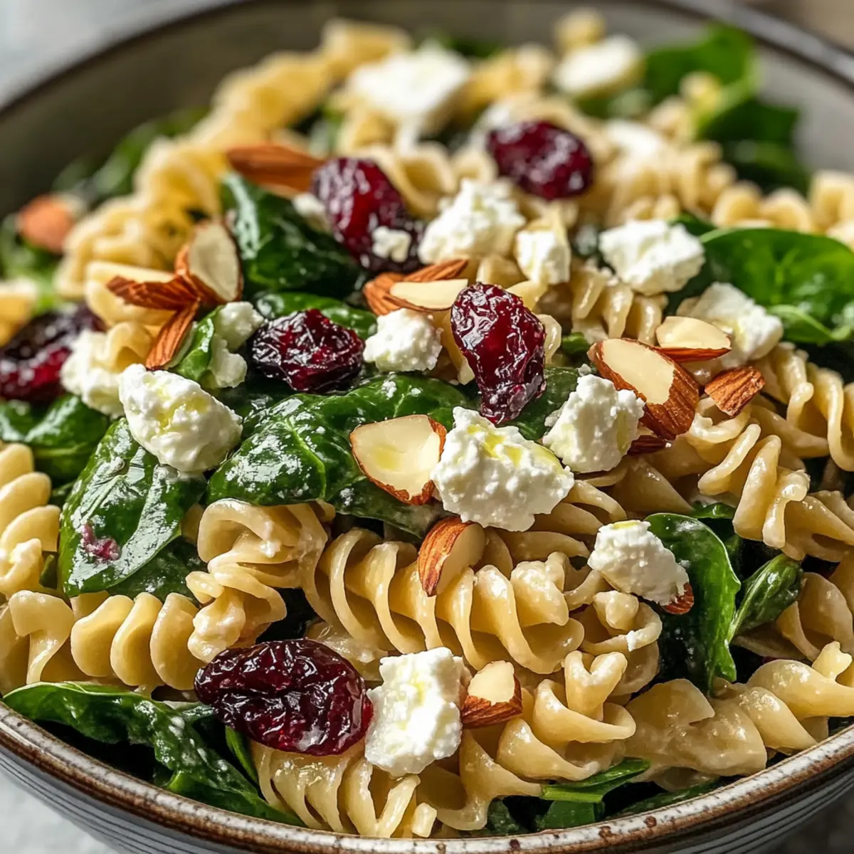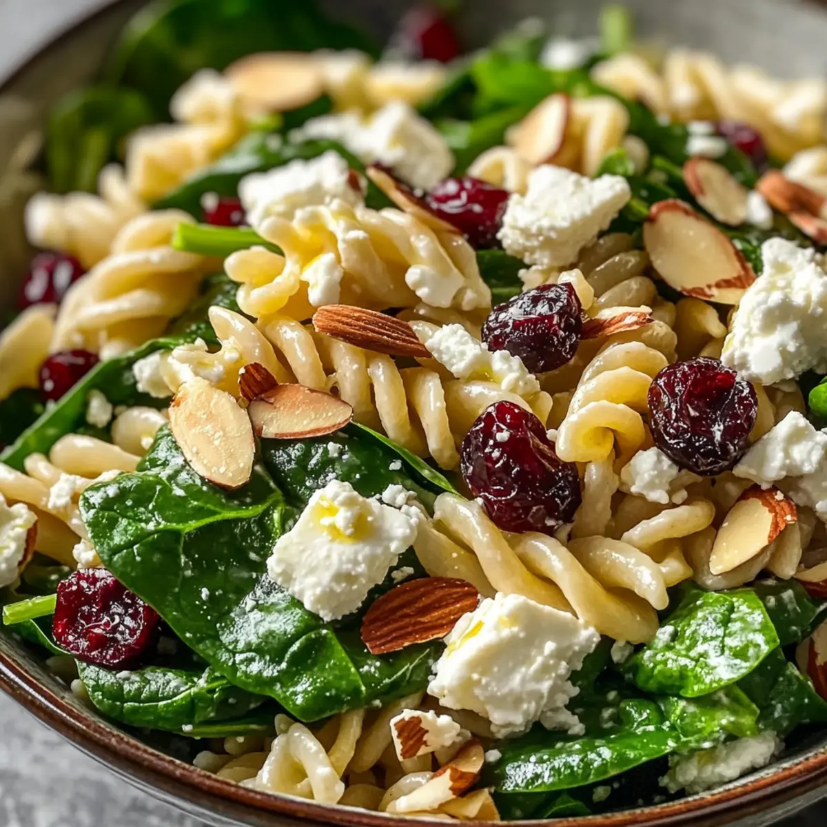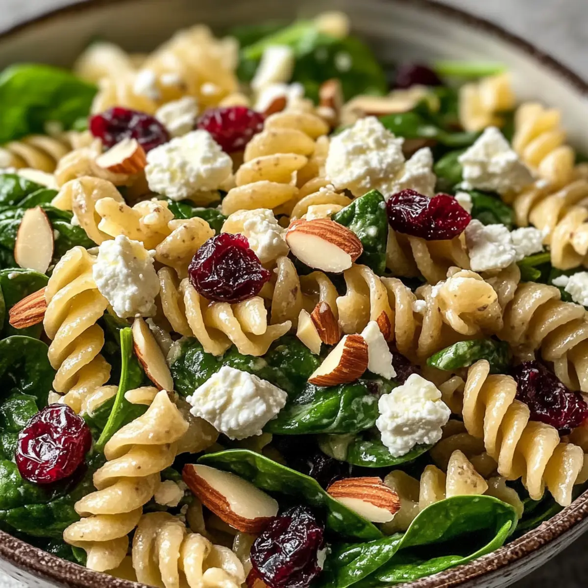 Jump to Recipe Print RecipeAs I stood in my kitchen, the fragrant aroma of zesty lemon and fresh herbs filled the air, transporting me to a sun-drenched Mediterranean marketplace. This Nutritious Spinach Pasta Salad with Feta and Cranberries has quickly become one of my go-to recipes. It’s a delightful blend of vibrant spinach, creamy feta, and sweet cranberries, making it not just a feast for the eyes but a nourishing meal that’s easy to prepare. Not only does this salad come together in a snap, but it also serves as a nourishing, vegetarian crowd-pleaser—perfect for everything from a relaxed lunch to a lively potluck. So, are you ready to whip up a salad that promises to be both refreshing and satisfying? Let’s dive in! What makes this Spinach Pasta Salad special? Vibrant Colors: This salad is a feast for the eyes, boasting fresh greens, creamy whites, and pops of sweet reds. Nutrient-Rich: Packed with vitamins from spinach and healthy fats from almonds, it’s a delicious way to nourish your body. Quick Preparation: With simple steps and minimal cooking time, you can enjoy this healthy dish in no time. Versatile Delight: Perfect as a side or main dish, it pairs wonderfully with grilled meats or as part of a vegetarian spread alongside options like Cucumber Shrimp Salad. Flavor Harmony: The salty feta and sweet cranberries create a perfect balance that’ll impress every palate. Make it ahead for gatherings or a light lunch, and savor the vibrant Mediterranean flavors! Spinach Pasta Salad Ingredients • Here’s everything you need to create this vibrant Spinach Pasta Salad. For the Salad Whole Wheat Pasta – Adds fiber and a nutty flavor to the salad; substitute with gluten-free pasta for a gluten-free option. Fresh Baby Spinach – Provides a fresh, vibrant base; ensure spinach is dry before adding to prevent sogginess. Crumbled Feta Cheese – Offers creamy texture and a salty, tangy flavor; goat cheese or mozzarella can be substituted for a different taste. Dried Cranberries – Contributes sweetness and a chewy texture; can be replaced with dried cherries or raisins. Sliced Almonds – Adds crunch and nuttiness; for a nut-free version, use sunflower seeds. Red Onion – Adds sharpness and color; use green onions for a milder flavor. For the Dressing Olive Oil – Provides healthy fats and a rich base for the dressing; use extra virgin for a bolder flavor. Lemon Juice – Adds brightness and acidity; adjust to taste for a more zesty finish. Honey – Brings subtle sweetness; can be replaced with maple syrup for a vegan option. Dijon Mustard – Adds a tangy depth; for a milder flavor, use yellow mustard. Salt and Pepper – Essential for seasoning; taste and adjust to enhance flavors. Now that you have all the ingredients for this delightful Spinach Pasta Salad, you’re just one step away from creating a dish that not only tantalizes your taste buds but also nourishes your body! Step‑by‑Step Instructions for Nutritious Spinach Pasta Salad with Feta and Cranberries Step 1: Cook the Pasta Begin by bringing a large pot of salted water to a rolling boil. Add the whole wheat pasta and cook according to the package instructions, typically 8-10 minutes, or until al dente. Once cooked, drain the pasta in a colander and rinse it under cold water to stop the cooking process and cool it down completely. Step 2: Whisk the Dressing In a small bowl, combine 1/4 cup olive oil, 2 tablespoons lemon juice, 1 tablespoon honey, and 1 tablespoon Dijon mustard. Add a pinch of salt and pepper to taste. Use a whisk to blend the ingredients thoroughly for about 1-2 minutes, ensuring the honey is fully dissolved and the dressing is emulsified and creamy. Step 3: Prepare the Salad Base In a large mixing bowl, place the cooled pasta, ensuring it’s not clumpy. Add 4 cups of fresh baby spinach, 1 cup of crumbled feta cheese, 1/2 cup of dried cranberries, 1/4 cup of sliced almonds, and 1/4 cup of finely chopped red onion. Gently toss the ingredients together with your hands or a spatula until well mixed, taking care not to crush the feta. Step 4: Dress the Salad Drizzle the prepared dressing over the spinach pasta salad. Using large serving spoons, gently toss the salad until every piece is lightly coated with the dressing. Be careful not to overmix, as you want to maintain the integrity of the feta and cranberries while evenly distributing the flavors. Step 5: Chill and Enhance Flavor Cover the salad and refrigerate for at least 30 minutes before serving. This resting time allows the flavors of the spinach pasta salad to meld beautifully, enhancing the overall taste. The ingredients will continue to soften while remaining fresh, creating a delightful texture. Step 6: Serve and Garnish Before serving, give the salad a final gentle toss, ensuring it’s refreshed and delicious. If desired, adjust the seasoning with a sprinkle of salt and pepper. Garnish with additional feta and sliced almonds on top to add an attractive finishing touch, then serve chilled for a delightful Mediterranean dish. What to Serve with Nutritious Spinach Pasta Salad with Feta and Cranberries Want to create a delightful meal around this refreshing salad? Grilled Chicken Skewers: These juicy skewers add a protein boost that complements the lightness of the salad beautifully. Marinated in herbs and lemon, they’ll bring a satisfying contrast to the fresh flavors. Crusty Garlic Bread: The crispy, buttery warmth of garlic bread acts as the perfect vessel to scoop up the last bits of salad, enhancing your dining experience with every bite. Roasted Vegetable Platter: Colorful seasonal veggies drizzled in olive oil and roasted until tender offer a delightful crunch and richness that pairs well with the salad’s creamy feta. Cucumber and Tomato Salad: This light, refreshing side packs a punch of flavor and adds a cool complement to the spinach pasta salad, making your meal feel vibrant and fresh. Sparkling Lemonade: A fizzy drin