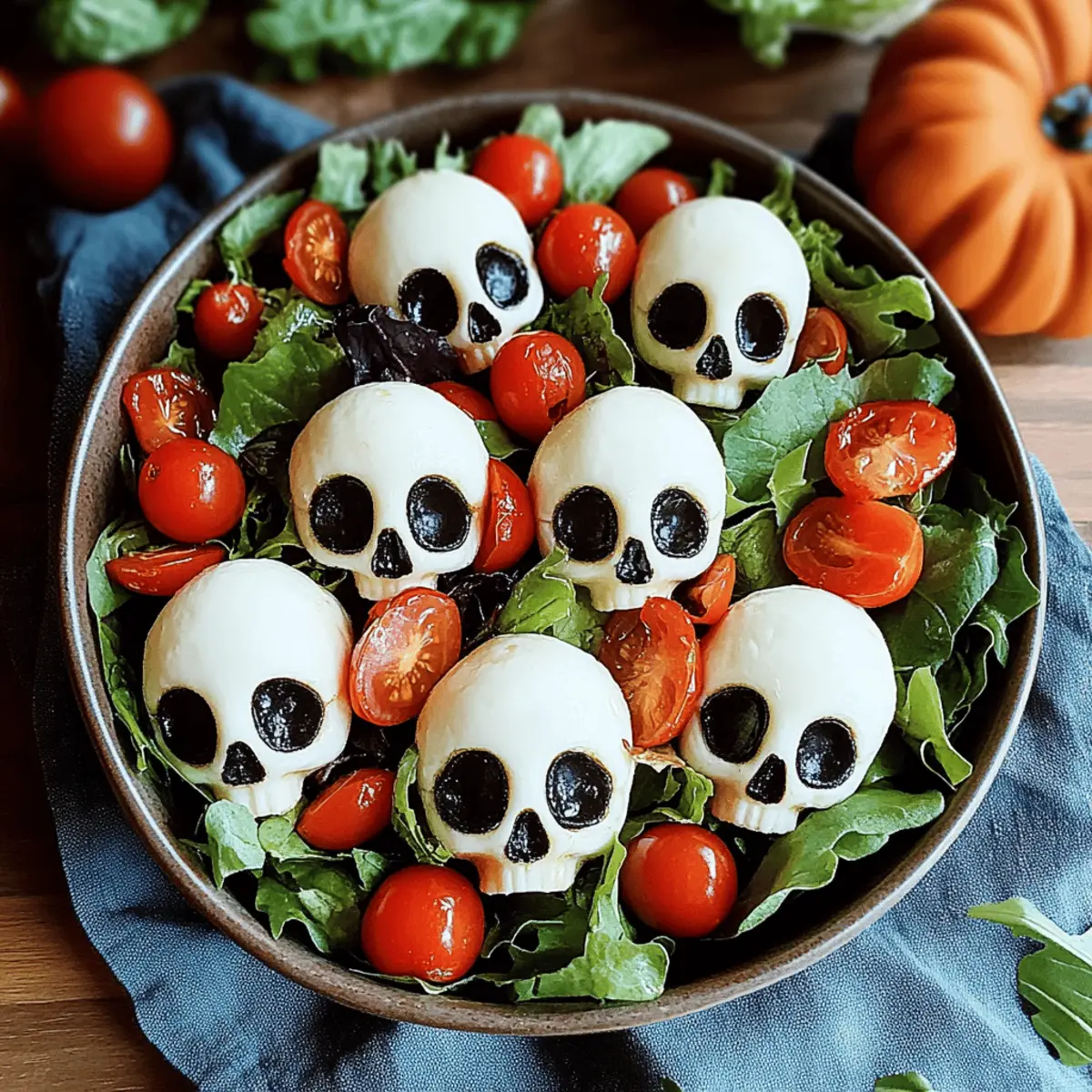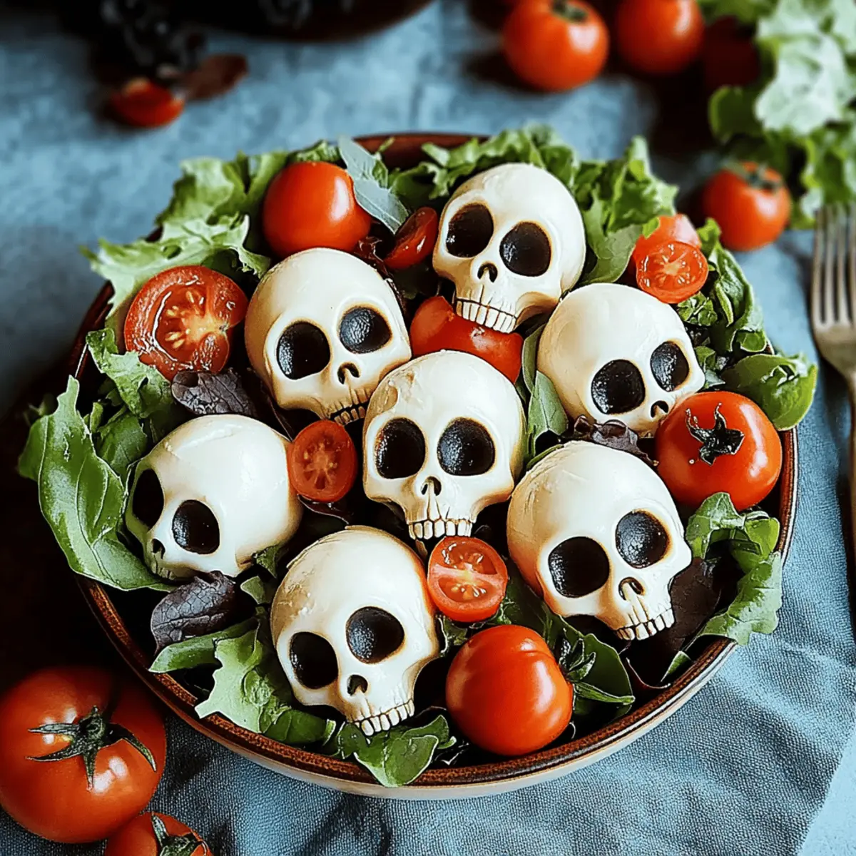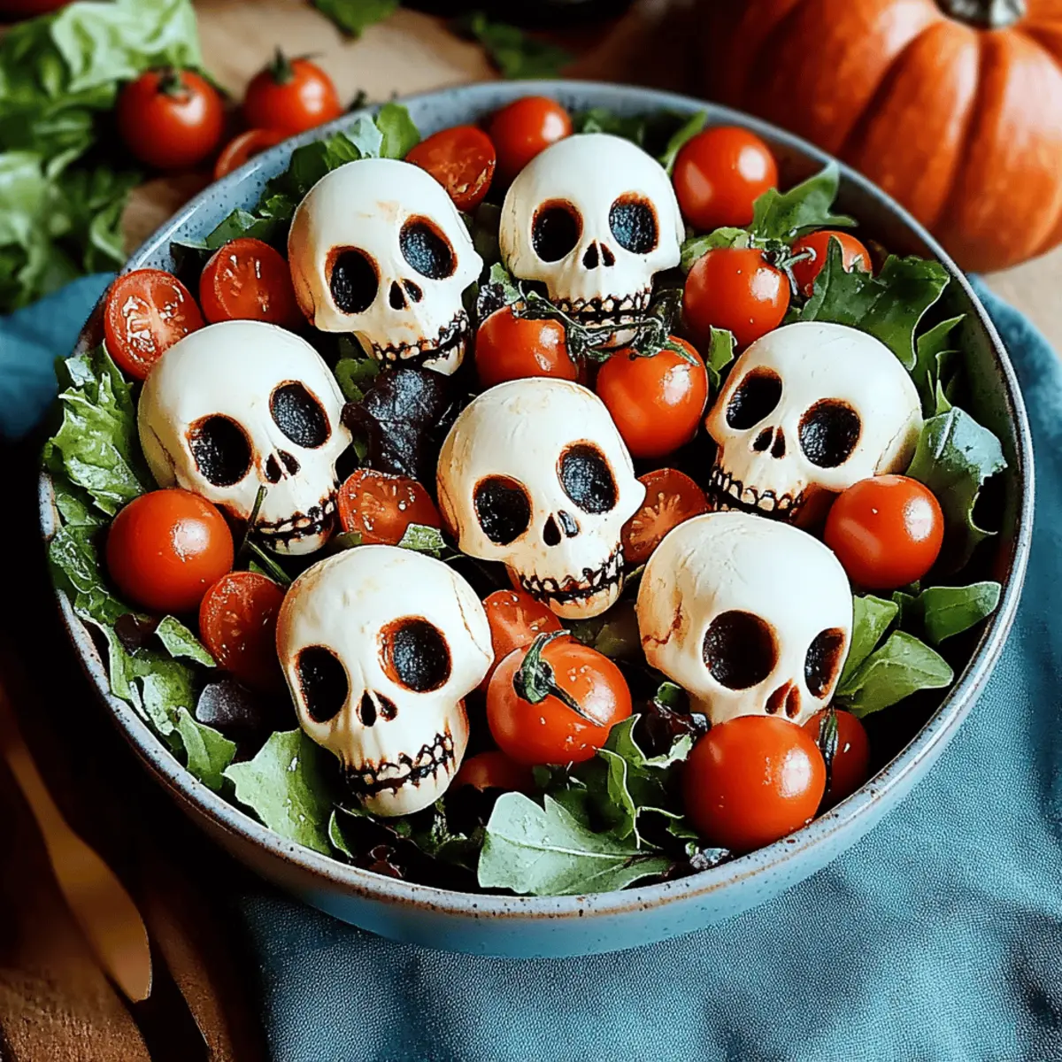 Jump to Recipe Print RecipeAs I rummaged through my pantry in the spirit of Halloween, a creative spark hit me: why not transform traditional salad into a ghoulish delight? This Spooky Halloween Salad with Mozzarella Skulls brings a playful twist to your dinner table, combining fresh, vibrant ingredients with a whimsical theme that’s sure to impress. Not only is it a healthy option, but it also adds an element of fun to your celebrations, making it a perfect dish for both parties and family gatherings. Picture your friends’ faces lighting up as they encounter the amusing mozzarella skulls among crunchy greens and juicy cherry tomatoes. Ready to make your Halloween feast unforgettable? Let’s dive into this spooky yet nutritious culinary adventure! Why Will You Love This Halloween Salad? Creative Twist: This Spooky Halloween Salad takes the classic Caprese to a whole new level with fun mozzarella skulls that captivate all ages. Fresh Ingredients: Featuring vibrant mixed greens and sweet cherry tomatoes, this dish is not only visually stunning but packed with nutrients. Easy to Make: Simply bake the mozzarella and toss together your ingredients for a quick, healthy meal that impresses without the stress. Customizable Fun: Feel free to add your own spin with seasonal ingredients, like toasted pumpkin seeds or spooky-shape cheeses, to keep it exciting. Perfect for Parties: This salad is an eye-catching centerpiece for Halloween gatherings, ready to enchant your guests and spark conversations! Spooky Halloween Salad Ingredients For the Mozzarella Skulls • Mozzarella Balls – Adds creaminess and acts as the centerpiece of the dish; substitute with a large mozzarella ball cut into cubes if desired. For the Salad Base • Mixed Salad Greens – Provides a vibrant base that contributes freshness; any soft greens work well. • Cherry Tomatoes – Adds sweetness and color to the salad; can be substituted with other small heirloom tomatoes. • Fresh Basil – Enhances flavor with its aromatic profile; dried basil can be used but won’t have the same impact. For the Dressing • Olive Oil – Serves as the dressing base for richness; use good quality finishing oil for the best results. • Balsamic Glaze – Adds tangy sweetness which complements the salad; homemade is recommended for superior flavor. • Flaky Sea Salt – Enhances flavors. • Freshly Cracked Black Pepper – Provides a mild spice balance. • Lemon (optional) – Adds bright acidity which enhances overall taste. This Spooky Halloween Salad will not only delight the taste buds but also make your Halloween celebration a memorable one! Step‑by‑Step Instructions for Spooky Halloween Salad Step 1: Preheat the Oven Begin by preheating your oven to 350°F (175°C). This crucial step ensures that the mozzarella balls will soften perfectly. Make sure to give your oven enough time to reach the desired temperature for uniform melting. Step 2: Prepare the Mozzarella Skulls Place one mozzarella ball into each skull mold, creating a playful base for your Spooky Halloween Salad. Bake them in the preheated oven for about 6 minutes, or until the cheese is soft and slightly puffy. Keep your eye on them, aiming for a gentle jiggle but not completely melted. Step 3: Shape the Skulls Once the mozzarella has baked, carefully remove it from the oven and press down gently into the molds with a spatula to carve out the spooky skull shapes. Allow the mozzarella to cool for a few minutes. Then, transfer them to the refrigerator for 10-15 minutes to firm up, ensuring they hold their shape for presentation. Step 4: Toss the Salad Greens In a large mixing bowl, take your fresh mixed salad greens and drizzle them with olive oil, adding lemon juice if you prefer a zesty kick. Use your hands or tongs to toss the greens gently until they are well coated, creating a vibrant base for your Spooky Halloween Salad. Step 5: Assemble Your Salad Now, it’s time to create the masterpiece! Layer the tossed greens on a large serving platter. Next, add the sliced cherry tomatoes and the chilling mozzarella skulls on top. The combination will create a colorful and whimsical display, perfect for this Halloween treat. Step 6: Dress and Season the Salad Drizzle extra olive oil and balsamic glaze over the top of your assembled salad. Sprinkle it with flaky sea salt and freshly cracked black pepper to enhance the flavors. This step brings the whole Spooky Halloween Salad together, balancing creamy, savory, and sweet notes beautifully. Step 7: Serve Immediately For the best experience, serve your Spooky Halloween Salad right after assembling. This ensures the greens maintain their crispness while the flavors stay vibrant. Watching your guests’ faces light up as they discover the mozzarella skulls is the perfect finale to this fun and festive dish! Expert Tips for Spooky Halloween Salad Mold Mastery: Press mozzarella firmly into molds to ensure they take on sharp details. This step makes for impressive skull shapes that will amaze your guests. Quality Counts: Use high-quality balsamic glaze for the best flavor. Homemade glaze can elevate your Spooky Halloween Salad even more with its rich taste. Serve Fresh: For optimal texture and flavor, serve the salad immediately after assembly. If you prepare ahead, keep the dressing separate to maintain crispness. Ingredient Swaps: Experiment with various seasonal ingredients to keep things exciting. Adding toasted pumpkin seeds or spooky-shaped cheese can add delightful surprises. Storage Solutions: Store leftover salad without dressing in an airtight container to maintain the freshness for up to 2 days, and enjoy the whimsical mozzarella skulls for up to 3 days separately. How to Store and Freeze Spooky Halloween Salad Fridge: Store leftover salad without dressing in an airtight container for up to 2 days to maintain crispness and freshness. Mozzarella Skulls: Keep the mozzarella skulls in a separate container in the fridge 
