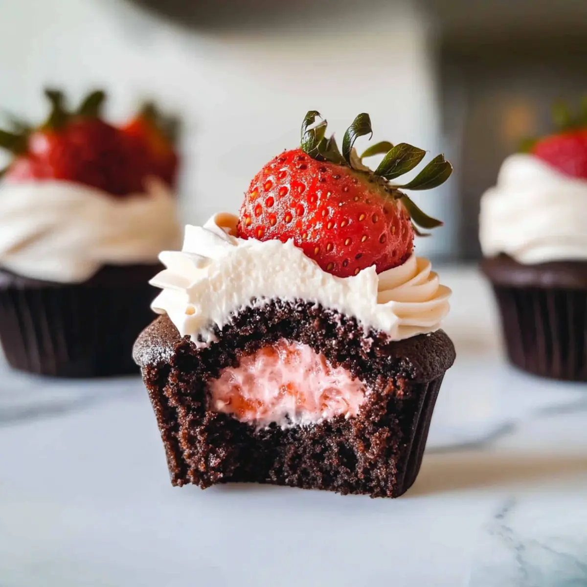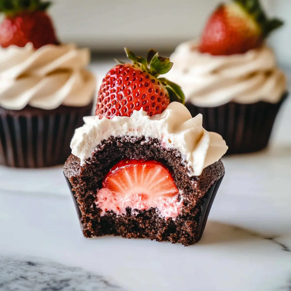 Jump to Recipe Print RecipeThe rich aroma of chocolate wafting through the kitchen instantly transports me to sunny afternoons spent baking with my grandmother. Those memories of making sweet treats have evolved, but the joy of creating something delicious remains as strong as ever. Today, I’m excited to share my Chocolate Strawberry Cupcakes—a perfect blend of indulgent chocolate and fresh strawberries that will brighten up any occasion. Not only are these cupcakes easy to whip up, but they also offer a delightful twist with a luscious strawberry filling and airy whipped cream frosting that’ll have your friends and family raving. Whether you’re celebrating a special milestone or just craving something homemade and comforting, these cupcakes hit all the right notes. Ready to dive into a world where sweetness meets nostalgia? Let’s get baking! Why Are Strawberry Chocolate Cupcakes Irresistible? Decadent and delightful, these cupcakes are a match made in dessert heaven! With a rich chocolate base that’s complemented by a sweet strawberry filling, each bite is a burst of flavor. Easy to make, you’ll find joy in baking and sharing these treats. Perfect for any occasion, they not only satisfy your cravings but also bring smiles to faces—transforming any gathering into a sweet celebration. If you love uplifting flavors, you might also enjoy our Strawberry Mango Cupcakes or for a quick no-bake option, check out our No-Bake Chocolate Peanut Butter Oreo Dessert. Strawberry Chocolate Cupcake Ingredients For the Strawberry Filling • Strawberries (4 oz / 115 g) – Fresh or frozen work beautifully; just remember, no need to thaw them! • Granulated Sugar (1 tbsp / 15 g) – Sweetens the filling; adjust to your preferred sweetness. • Water (2 tbsp / 30 ml) – Aids in creating the strawberry sauce; use less if using frozen berries. • Cornstarch (½ tbsp) – Thickens the strawberry filling for a perfect consistency. • Lemon Juice (½ tbsp) – Brightens the flavor, making the filling truly pop. For the Cupcake Batter • All-Purpose Flour (1 cup / 125 g) – Provides the structure every cupcake needs. • Granulated Sugar (¾ cup / 150 g) – Adds sweetness to the cupcake, enhancing the chocolate flavor. • Cocoa Powder (½ cup / 60 g) – For that rich chocolate essence; opt for natural cocoa for best results. • Baking Powder (1 tsp) – Helps the cupcakes rise beautifully in the oven. • Baking Soda (½ tsp) – Works alongside the baking powder to lift the batter. • Coarse Kosher Salt (½ tsp) – Balances sweetness and elevates flavor. • Eggs (2, large) – Bring moisture and structure; they should be at room temperature for best results. • Milk (½ cup / 120 ml) – Keeps the cupcakes moist; any milk type will suffice. • Vegetable Oil (½ cup / 120 ml) – Adds richness and moisture to the cupcakes. • Vanilla Extract (2 tsp) – Deepens the flavor profile, making it irresistible. • Hot Coffee (¼ cup / 60 ml) – Enhances the chocolate flavor significantly. For the Whipped Cream Frosting • Freeze-Dried Strawberries (1 cup / 15 g) – To infuse your frosting with berry goodness; grind them to a fine powder. • Heavy Whipping Cream (1 cup / 240 ml, cold) – Creates a light and airy frosting that complements the cupcakes perfectly. • Granulated Sugar (2 tbsp / 30 g) – Adds a touch of sweetness to the whipped cream frosting. These Strawberry Chocolate Cupcake ingredients come together to create an enchanting treat that will surely delight your loved ones! Step‑by‑Step Instructions for Strawberry Chocolate Cupcakes Step 1: Make the Strawberry Filling In a small saucepan over medium heat, combine 4 oz of strawberries, 1 tbsp of sugar, and 2 tbsp of water. Bring the mixture to a gentle boil, stirring frequently. Once boiling, mix the cornstarch with ½ tbsp of lemon juice, add it to the saucepan, and simmer for 2-3 minutes until the mixture thickens. Remove from heat and let it cool in the fridge while you prepare the cupcakes. Step 2: Prep the Oven and Muffin Pan Preheat your oven to 350°F (175°C) and prepare a muffin pan by lining it with cupcake liners. This step is crucial to ensure your delicious Strawberry Chocolate Cupcakes cook evenly and don’t stick. Make sure you’re using high-quality liners to enhance the visual appeal of your cupcakes. Step 3: Mix the Dry Ingredients In a large mixing bowl, whisk together 1 cup of flour, ¾ cup of sugar, ½ cup of cocoa powder, 1 tsp of baking powder, ½ tsp of baking soda, and ½ tsp of coarse kosher salt. Blend until fully combined to create a uniform base for your cupcakes, which will give them that perfect chocolatey sweetness that pairs beautifully with the strawberry filling. Step 4: Combine the Wet Ingredients In a separate bowl, whisk together 2 large eggs, ½ cup of milk, ½ cup of vegetable oil, and 2 tsp of vanilla extract until smooth. Adding ¼ cup of hot coffee will enhance the chocolate flavor, making it rich and delightful. Ensure all ingredients are well incorporated before moving to the next step, as this will ensure a moist cupcake. Step 5: Mix and Fill the Cupcake Liners Gently fold the wet ingredients into the dry until just combined, being careful not to overmix. This will keep your Strawberry Chocolate Cupcakes light and fluffy. Using a cookie scoop, fill each lined cupcake mold about two-thirds full with the batter. Bake for 18-20 minutes, or until a toothpick inserted in the center comes out clean. Step 6: Cool Completely Once baked, remove the cupcakes from the oven and allow them to cool in the pan for about 5 minutes. Then transfer them to a wire rack to cool completely. It’s essential to let them cool fully before adding the strawberry filling and frosting to prevent melting and help maintain the cupcake’s structure. Step 7: Make the Whipped Cream Frosting To prepare the frosting, grind 1 cup of freeze-dried strawberries into a fine powder. In a chilled bowl, whip 1 