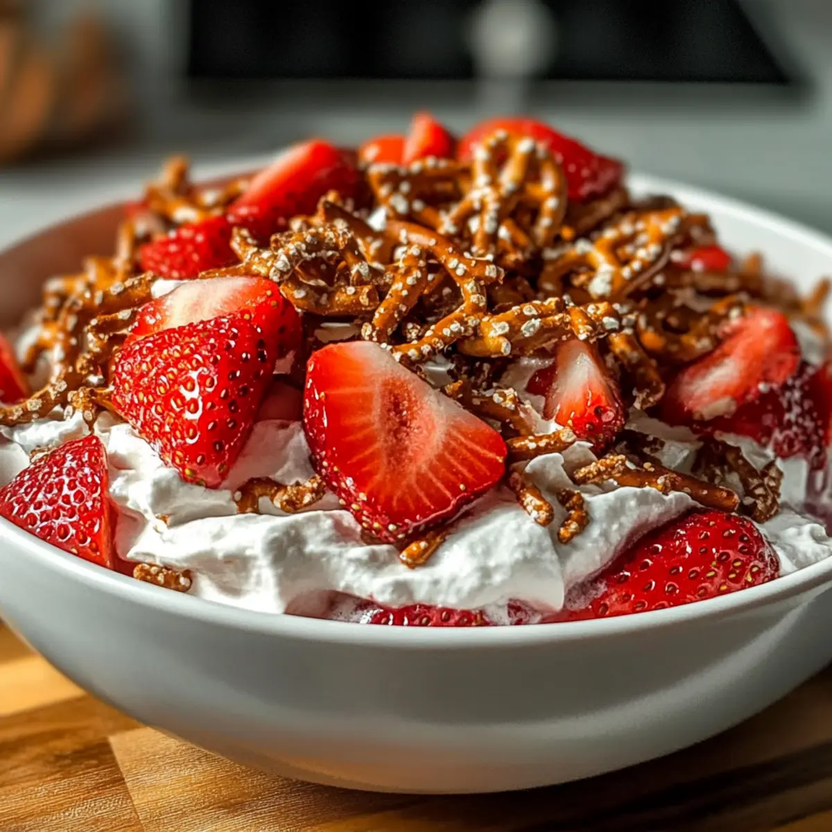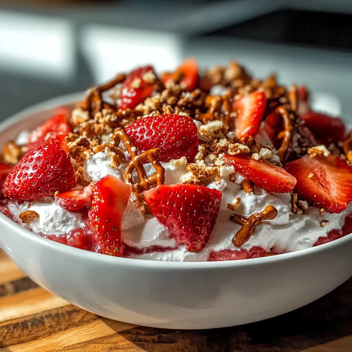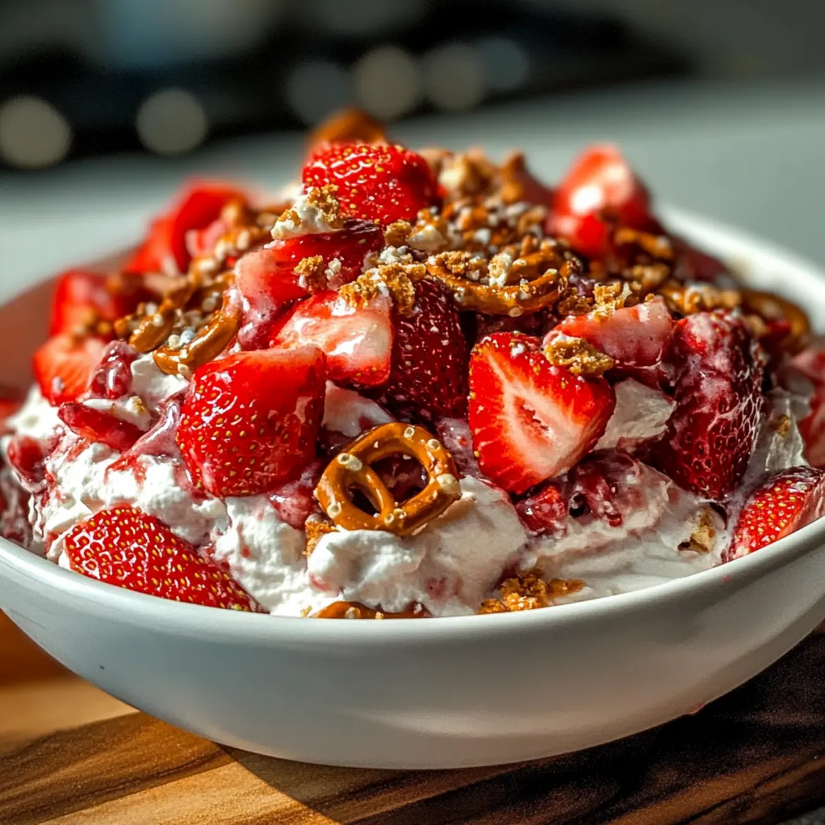 Jump to Recipe Print RecipeAmidst the sun-kissed afternoons of summer, there’s a joy that comes from creating something light and refreshing—like my Refreshing Strawberry Crackle Salad with Creamy Crunch. This delightful dish combines juicy strawberries with a creamy dressing and a crunchy pretzel topping, making it the perfect addition to picnics and gatherings. One of the best perks? It comes together quickly, allowing you to enjoy more time relaxing with friends and family rather than slaving away in the kitchen. Plus, it’s an irresistible crowd-pleaser that offers a fabulous twist on traditional salads. Who can resist that vibrant burst of strawberry goodness? Let’s dive into this festive recipe that promises to elevate your summer culinary adventures! Why is This Salad a Must-Make? Refreshingly Fun: This Strawberry Crackle Salad is a vibrant delight that captures the essence of summer. Its combination of sweet strawberries and creamy textures will make your taste buds dance with joy. Easy to Prepare: You won’t need culinary expertise to whip this up! With just a few steps, including baking the pretzel crunch, it’s a breeze to make. Versatile Variations: Feel free to mix it up! Add in seasonal fruits or swap nuts for a different twist—your choice! Crowd-Pleasing Appeal: Perfect for summer gatherings, this dish will impress friends and family alike. Pair it with refreshing drinks like lemonade or check out my Cucumber Shrimp Salad for a full meal experience. Time-Saving Delight: With quick prep times, you’re free to enjoy a moment of zen beneath the sun while your salad comes together beautifully! Strawberry Crackle Salad Ingredients For the Crunch • Crushed Pretzels – Provides a crunchy texture and salty contrast. Consider gluten-free pretzels for a gluten-free option. • Chopped Pecans – Adds nutty flavor and additional crunch. Walnuts can be used for a different nutty nuance. • Brown Sugar – Sweetens the pretzel mixture and caramelizes during baking. White sugar can be substituted if needed. • Butter (Melted) – Binds the pretzel mix and enhances richness. For a dairy-free variation, use coconut oil. For the Creamy Base • Sliced Strawberries – Imparts natural sweetness and juiciness to the salad. Other berries like raspberries or blueberries can also be included for a mixed berry salad. • Cream Cheese (Softened) – Forms a creamy base for the salad. Neufchâtel cheese or Greek yogurt can be used as lighter alternatives. • Granulated Sugar – Balances the tang of cream cheese. Less sugar or a sugar substitute can be used if desired. • Vanilla Extract – Enhances overall flavor with a sweet aroma. Almond extract could be used for a different taste profile. • Cool Whip – Provides a fluffy, creamy texture. Homemade whipped cream can substitute for Cool Whip if preferred. Step‑by‑Step Instructions for Strawberry Crackle Salad Step 1: Preheat Your Oven Begin by preheating your oven to 400°F (200°C). While the oven heats up, line a baking sheet with parchment paper to prevent the pretzel mixture from sticking. This step is essential for achieving that delightful crunch in the Strawberry Crackle Salad. Step 2: Prepare the Pretzel Mixture In a large mixing bowl, combine the crushed pretzels, chopped pecans, and brown sugar. Pour in the melted butter and mix until all the ingredients are evenly coated. This mixture will form the crunchy topping of your salad, adding a perfect salty-sweet contrast to the strawberries. Step 3: Bake the Pretzel Crunch Spread the pretzel mixture evenly on the prepared baking sheet. Bake in the preheated oven for about 8-10 minutes, or until you see bubbles forming and the edges turning golden. Remove from the oven and allow it to cool completely before breaking it into pieces; this ensures a wonderfully crunchy texture for your Strawberry Crackle Salad. Step 4: Create the Creamy Base In a large mixing bowl, beat the softened cream cheese with granulated sugar and vanilla extract until smooth and creamy. This step is crucial for building the luscious base of your Strawberry Crackle Salad. Once combined, gently fold in the Cool Whip until the mixture is light and airy, then refrigerate to chill while you prepare the rest. Step 5: Combine Fresh Ingredients Just before serving the Strawberry Crackle Salad, fold in the sliced strawberries and half of the prepared pretzel crunch into the creamy mixture. This blend of flavors and textures creates the bright and festive profile that defines this refreshing dish. Be sure to mix gently to keep the strawberries intact. Step 6: Serve with Style Transfer the combined salad to a serving dish and top it with the remaining pretzel crunch for added texture. The final presentation should reflect vibrant strawberries against a creamy backdrop, enticing everyone to dig in. Serve chilled and enjoy the delightful contrast of flavors and textures in your Strawberry Crackle Salad. Make Ahead Options These Strawberry Crackle Salad preparations are perfect for busy home cooks looking to save time! You can prepare the crunchy pretzel mixture up to 3 days in advance, just be sure to store it in an airtight container to maintain its crispness. Meanwhile, the creamy base can be made up to 24 hours ahead—simply chill it in the refrigerator to allow the flavors to meld beautifully. When you’re ready to serve, just fold in the sliced strawberries and half of the pretzel crunch, topping it with the remaining crunch for that delightful texture. This way, you can enjoy a vibrant and delicious salad without the last-minute rush! Storage Tips for Strawberry Crackle Salad Fridge: Store leftovers in an airtight container and enjoy within 2-3 days. This ensures your Strawberry Crackle Salad stays fresh and maintains its delightful texture. Freezer: While freezing is not recommended due to the nature of fresh strawberries and creamy ingredients, the pretzel mixture can be stored in a sealed bag fo