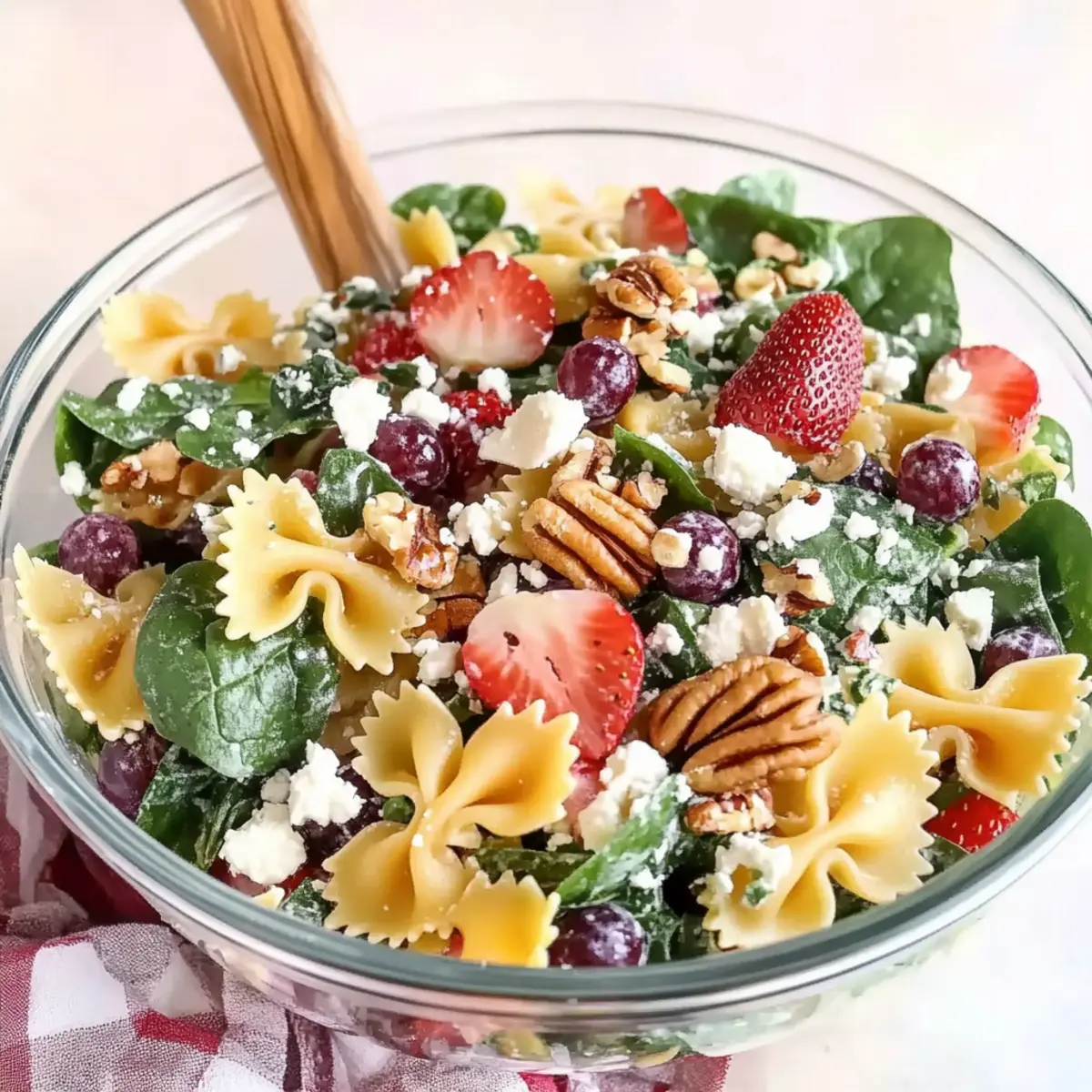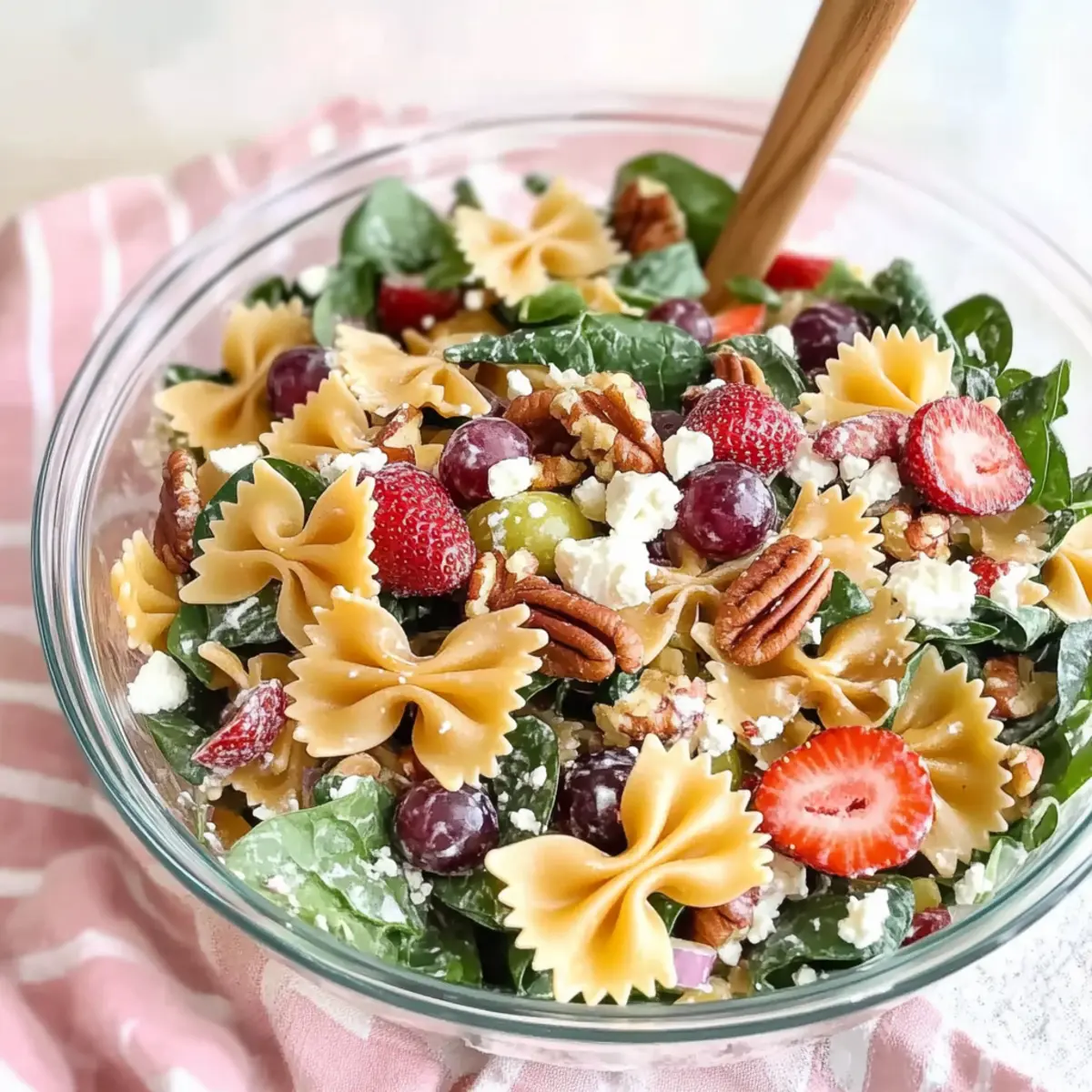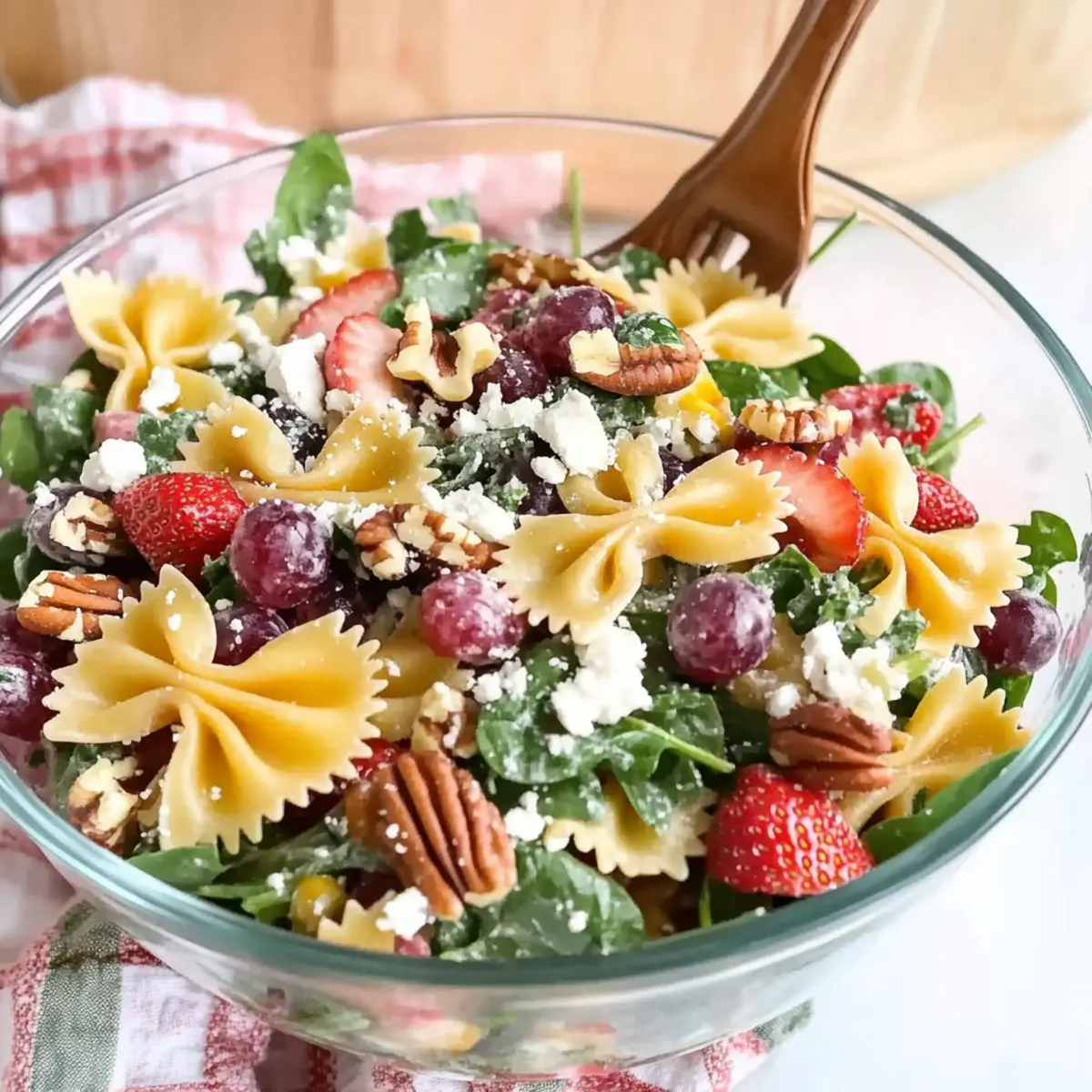 Jump to Recipe Print RecipeAs I tossed the vibrant ingredients together, I could already envision the laughter and sunny smiles that my Strawberry Fields Pasta Salad would bring to our summer gathering. This delightful dish, bursting with sweet strawberries, juicy grapes, and tender bow tie pasta, is a breeze to whip up and truly shines with flavors that get even better after a night in the fridge. Perfect for those warm afternoons when you crave something refreshing yet satisfying, this summer salad not only impresses your guests but also makes meal prep a breeze. With minimal effort and a mix of fresh ingredients, you can create a stunning centerpiece for your potluck or picnic that everyone will adore. Who’s ready to dive into this delicious summer adventure? Why is This Salad So Irresistible? Vibrant Ingredients: The combination of sweet strawberries, juicy grapes, and tender pasta creates a refreshing explosion of flavor that dances on your taste buds. Quick and Easy: With minimal prep time, this salad is a perfect solution for busy weekdays or last-minute gatherings, leaving you more time to enjoy the company of loved ones. Versatile Dish: This recipe allows for easy substitutions, making it a canvas for your creativity. Swap in chicken or other seasonal fruits like peaches to cater to your personal taste or dietary needs. Crowd-Pleasing Delight: Perfect for summer picnics, BBQs, or family reunions, this salad will leave your guests raving and asking for the recipe. Serve it alongside your favorite barbecue dishes or even a light Egg Pasta Salad to create a delightful spread. Meal Prep Marvel: You can make this dish a day in advance for enhanced flavor, making it a fantastic option for stress-free entertaining. Trust me, letting the flavors meld overnight will take this salad’s taste to the next level! Strawberry Fields Pasta Salad Ingredients For the Pasta • Bow Tie Pasta – Provides structure and a visually appealing shape; can also use rotini, mini shells, or penne. For the Fresh Fruit • Strawberries – Adds sweetness and a burst of freshness; use hulled and sliced for best results. • Red Grapes – Offers sweetness and crunchy texture; green grapes can be used as an alternative based on preference. • Mandarin Oranges – Adds sweetness and juiciness; canned varieties work well for this salad. For the Greens and Crunch • Baby Spinach – Contributes color, nutrients, and a tender texture; can substitute with arugula for a peppery flavor. • Red Onion – Provides a crunchy and savory contrast; slice thin for even distribution. • Pecans – Introduce a crunch and earthy flavor; walnuts or slivered almonds can be used as alternatives. For the Cheese and Dressing • Feta Cheese – Delivers a salty and creamy element that complements the sweet ingredients; goat cheese or cheddar cubes can be substituted if preferred. • Poppy Seed Dressing – Ties the salad together with its tangy and sweet profile; specific brand used: Bitten Lemon Poppy Seed dressing. Seasoning • Salt and Pepper – Enhances overall flavor; use to taste. This Strawberry Fields Pasta Salad is set to impress your guests with its delightful medley of fresh ingredients! Step‑by‑Step Instructions for Strawberry Fields Pasta Salad Step 1: Boil the Pasta Begin by bringing a large pot of salted water to a rolling boil over high heat. Once boiling, add the bow tie pasta and cook according to the package instructions, usually about 8-10 minutes, until al dente. When finished, drain the pasta in a colander, then rinse it under cold water to stop the cooking process and cool it off, ensuring it retains a firm texture. Step 2: Combine the Ingredients In a spacious mixing bowl, combine the cooled bow tie pasta with sliced strawberries, red grapes, thinly sliced red onion, baby spinach, and mandarin oranges. Add in the chopped pecans and crumbled feta cheese for delightful crunch and flavor. Gently mix these vibrant ingredients together, taking care not to break the fruit or pasta as you create an enticing assembly of textures. Step 3: Dress the Salad Pour the poppy seed dressing over the combined salad ingredients. Season to taste with salt and freshly cracked black pepper to enhance the flavors. With a large spoon, gently toss everything, making sure the dressing coats all of the ingredients evenly. This step ensures every bite of your Strawberry Fields Pasta Salad is bursting with that tangy, sweet flavor profile. Step 4: Chill the Salad Cover the bowl with plastic wrap or transfer the pasta salad to an airtight container. Then, refrigerate for at least 30 minutes, allowing the flavors to meld beautifully. This chilling period not only enhances the taste but also ensures the salad is refreshingly cool when served, making it perfect for those warm summer gatherings. Step 5: Serve and Enjoy After chilling, give the salad a quick toss to redistribute the dressing and flavors. Serve the Strawberry Fields Pasta Salad in bowls or on a large platter, garnishing with additional feta or pecans as desired. This vibrant dish is best enjoyed cold, making it a delightful addition to any picnic, potluck, or BBQ, ready to please your gathering! What to Serve with Strawberry Fields Pasta Salad Complete your summer gathering with delightful sides that elevate your meal experience to new heights. Grilled Chicken Skewers: Juicy, herb-marinated chicken provides a hearty contrast to the lightness of the pasta salad. Garlic Breadsticks: Soft, buttery breadsticks amplify the comforting vibes of your meal and are perfect for mopping up any leftovers. Caprese Salad: A fresh and vibrant salad, featuring ripe tomatoes and mozzarella, lends a classic Italian twist that complements the sweetness of the pasta salad. Watermelon Feta Salad: This refreshing side, blending sweet watermelon and salty feta, enhances the fruity notes of the pasta dish, creating a lovely flavor balance. Chilled White Wine: A crisp Sauvignon Blanc or P