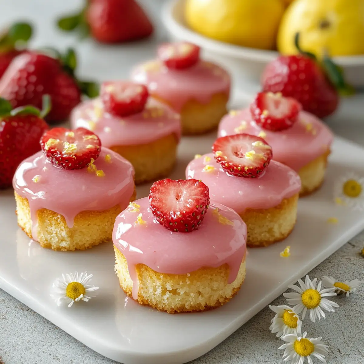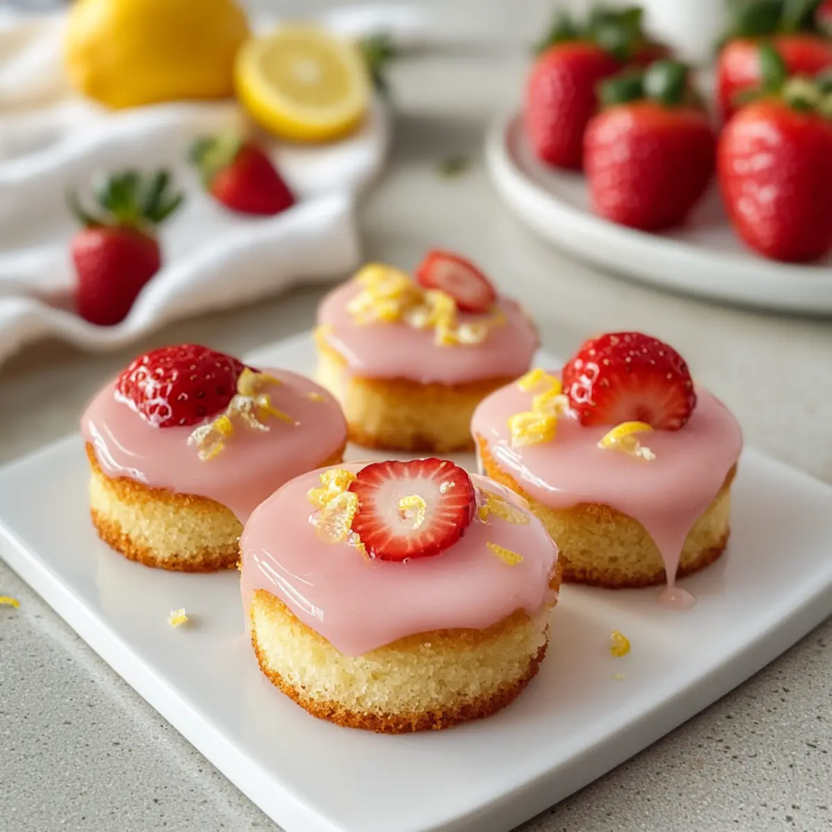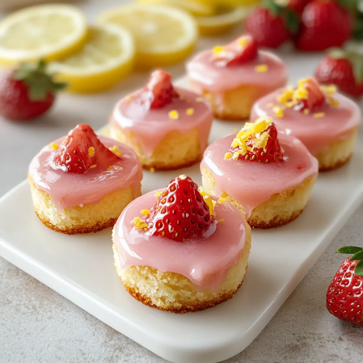 Jump to Recipe Print RecipeAs I gazed out at the bright summer sun streaming through my kitchen window, the thought of a delightful treat danced in my mind. That’s when I concocted the idea for these Zesty Strawberry Lemonade Cake Bites—a perfect blend of fresh strawberries and zesty lemon. Each bite is like a mini celebration of summer, soft and tender yet tantalizingly tangy. They are not just quick and easy to make; they’re also kid-friendly and an absolute hit for any gathering. Whether you’re hosting a picnic or simply enjoying a quiet afternoon tea, these cake bites will elevate your snack game. Curious to see how easy they are to whip up? Let’s dive in! Why Are These Cake Bites a Must-Try? Irresistible Flavors: These Strawberry Lemonade Cake Bites combine fresh strawberries and zesty lemon, creating a vibrant flavor explosion that embodies summer. Easy to Make: With just a few simple ingredients and easy steps, you’ll have a delicious treat ready in no time—perfect for those busy summer days. Kid-Friendly Delight: Kids will love these bite-sized goodies—a fun way to enjoy fruit while satisfying their sweet tooth! Versatile Treat: Great for picnics, parties, or afternoon snacks, pair them with iced tea or even a refreshing glass of lemonade for the ultimate summer experience. Store and Share: These cake bites are easy to store and can be prepped ahead, allowing you to share this delightful recipe with friends and family without the stress. If you’re looking for more delicious summer ideas, check out our Strawberry Mango Cupcakes or Strawberry Cheesecake Sandwiches. Strawberry Lemonade Cake Bites Ingredients For the Cake Bites Flour – Provides structure to these delightful cake bites. Sugar – Adds sweetness and helps to retain moisture, ensuring a tender texture. Baking Powder – Acts as a leavening agent, giving the bites their fluffy quality. Salt – Enhances the overall flavor profile of the cake bites. Vanilla Extract – Infuses sweetness and moisture, balancing the citrus notes. Lemon Zest – Delivers bright citrus flavor that elevates the cake. Eggs – Bind the ingredients together and contribute to texture. Chopped Strawberries – Adds fruitiness and moisture, making these cake bites extra special. For the Glaze Powdered Sugar – Creates a sweet and thick glaze that coats the bites. Fresh Lemon Juice – Introduces tanginess, providing a refreshing contrast to the sweetness. Chopped Strawberries – Enhances the berry flavor and adds a beautiful finish to the glaze. Whip up these Strawberry Lemonade Cake Bites and prepare to delight your family and friends with a vibrant summer treat! Step‑by‑Step Instructions for Strawberry Lemonade Cake Bites Step 1: Prepare the Batter Begin by preheating your oven to 350°F (175°C) and lining a mini muffin tin or cake pop mold with paper liners. In a mixing bowl, whisk together flour, sugar, baking powder, and salt until well combined. In a separate bowl, mix eggs, vanilla extract, lemon zest, and melted butter until smooth. Gradually mix the wet ingredients into the dry ingredients, stirring gently before folding in the chopped strawberries until just combined. Step 2: Bake Spoon the batter into the prepared molds, filling them about three-quarters full to allow for rising. Bake in the preheated oven for approximately 12-15 minutes, or until the tops are golden and a toothpick inserted into the center comes out clean. Once baked, remove from the oven and let the Strawberry Lemonade Cake Bites cool in the pan for about 5 minutes before transferring them to a wire rack to cool completely. Step 3: Make the Glaze While the cake bites cool, prepare the glaze by whisking together powdered sugar, fresh lemon juice, and additional chopped strawberries in a bowl until smooth and glossy. Adjust the consistency by adding more lemon juice for a thinner glaze or more powdered sugar for a thicker finish. Once ready, set it aside so the flavors meld together. Step 4: Glaze the Bites Once the cake bites have completely cooled, dip each one into the glaze, ensuring an even coat, then lift and let the excess drip off. Place the glazed Strawberry Lemonade Cake Bites on a wire rack or parchment paper to set. Allow them to sit at room temperature for about 15 minutes so the glaze can firm up before serving. Storage Tips for Strawberry Lemonade Cake Bites Room Temperature: Store the cake bites in an airtight container at room temperature for up to 5 days, keeping them fresh and flavorful for your summer gatherings. Fridge: If you prefer a colder treat, these bites can be stored in the fridge for up to 1 week, just bring them back to room temperature before serving for the best taste. Freezer: For longer storage, freeze the unglazed cake bites in a single layer on a baking sheet, then transfer to a sealed freezer bag for up to 3 months. Dip them in glaze just before serving. Reheating: If frozen, allow the cake bites to thaw in the fridge overnight or at room temperature for a couple of hours before glazing or enjoying. What to Serve with Zesty Strawberry Lemonade Cake Bites These cake bites are the perfect centerpiece for a summer gathering, beckoning you to curate a delightful full meal around them. Iced Tea: A refreshing glass of sweetened iced tea provides a lovely contrast to the tangy cake, making each bite sing. Lemonade: Pairing these bites with a chilled glass of lemonade enhances the zesty flavors while keeping the summer vibes alive. Berry Salad: A fresh salad bursting with mixed berries adds a light, fruity texture that perfectly complements the cake bites’ sweetness. Whipped Cream: Serve a dollop of whipped cream on the side for extra creaminess that balances the tart notes of the lemon. Chocolate Dipping Sauce: For a decadent twist, offer a side of rich chocolate sauce for dipping, creating a delightful contrast. Fruit Skewers: Colorful fruit skewers with strawberries, blueberries, and pineapple add a fun touch 