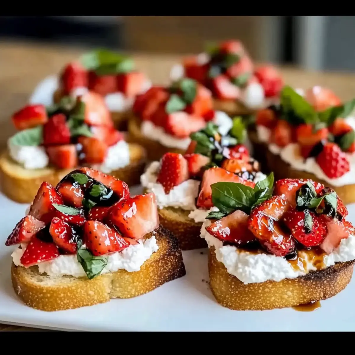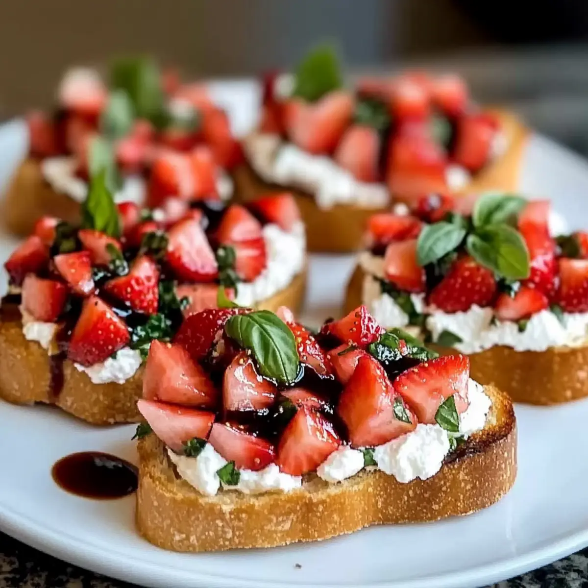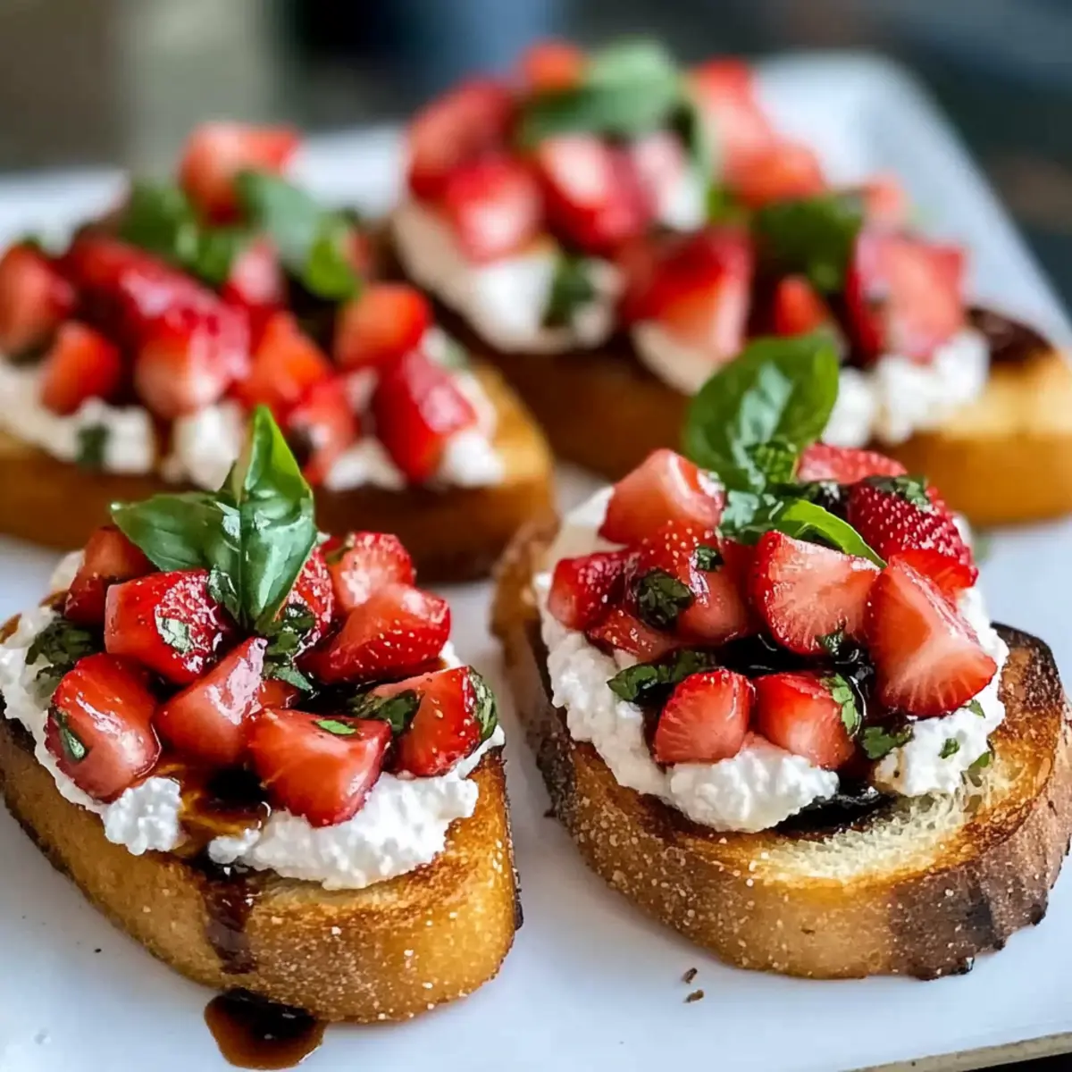 Jump to Recipe Print RecipeAs I stood by my kitchen window, the sun began to dip, casting a golden glow over my fresh summer produce. That’s when I spotted those beautiful strawberries, glistening like gems. It sparked an idea for a delightful appetizer; my Strawberry Ricotta Bruschetta! This quick-to-make dish perfectly blends creamy ricotta and sweet strawberries, all drizzled with a tangy balsamic glaze atop crispy toasted baguette slices. Not only is it a show-stopper for gatherings, but it’s also a breeze to prepare, making it ideal for busy weeknights or special moments alike. You’ll love how effortlessly it elevates any occasion with its vibrant colors and rich flavors. Curious how you can whip up this yummy treat and impress your friends or family? Let’s dive into the recipe! Why is Strawberry Ricotta Bruschetta a Must-Try? Deliciously Unique: This Bruschetta combines sweet strawberries with creamy ricotta, creating a flavor explosion that is both surprising and delightful. Quick Preparation: With just a few ingredients and a simple toasting method, you can put this elegant appetizer on the table in no time—perfect for those busy days. Versatile Serving: Whether you’re hosting a brunch or a dinner party, this dish fits right in with any menu. It’s also a fantastic starter for gatherings! Crowd-Pleasing Appeal: Not only does it look stunning, but it also satisfies various palates, making it a hit with friends and family alike. Plus, consider pairing it with a delightful Strawberry Mango Cupcake for a sweet finale! Fresh Ingredients: Utilizing fresh strawberries ensures that you capture the essence of summer in every bite, enhancing its vibrant flavors. Indulge in this delightful Strawberry Ricotta Bruschetta, and bring some sweet-savory bliss to your next meal! Strawberry Ricotta Bruschetta Ingredients For the Bread • Baguette – Provides structure and crispiness; best toasted for a delightful crunch. Sourdough or ciabatta can also be used for a delightful twist. For the Topping • Ricotta Cheese – Adds creaminess and richness; optional to mix with honey for added sweetness. Whipped ricotta can create an easier spread. • Strawberries – Offers fresh and juicy sweetness; ensure they are fresh—avoid using frozen as they release moisture. • Balsamic Glaze – Adds a tangy-sweet finishing touch to balance flavors beautifully in this Strawberry Ricotta Bruschetta. • Basil – Provides a fresh, aromatic garnish; add just before serving to prevent wilting. Embrace the simple pleasure of making this vibrant dish and let it brighten your table! Step‑by‑Step Instructions for Strawberry Ricotta Bruschetta Step 1: Preheat and Prepare the Bread Begin by preheating your oven to 400°F (200°C). While it warms up, slice the baguette into even pieces, about ¾ inch thick, and place them in a single layer on a baking sheet. Use a brush to lightly coat each slice with olive oil, ensuring every inch is covered for that perfect golden crispiness in your Strawberry Ricotta Bruschetta. Step 2: Toast the Bread Once the oven is preheated, slide the baking sheet inside and toast the bread for 6–8 minutes. Keep an eye on it; you’ll want the slices to turn a lovely golden brown and feel crispy to the touch. After toasting, remove the bread from the oven and allow it to cool slightly on the baking sheet while you prepare the topping. Step 3: Mix the Ricotta In a mixing bowl, add the ricotta cheese. Use a fork to break it up and mix in a pinch of salt and pepper, creating a smooth and creamy texture. For an extra touch of sweetness, you may stir in a teaspoon of honey if desired. This rich mixture will be the perfect base for your sumptuous Strawberry Ricotta Bruschetta. Step 4: Prepare the Strawberries Wash your fresh strawberries under running water, then gently pat them dry with a paper towel. Remove the tops and chop the strawberries into small, even pieces, letting their vibrant color shine. Set them aside, ready to complement the creamy ricotta and add a refreshing burst of sweetness to your bruschetta. Step 5: Assemble the Bruschetta Now, it’s time to assemble your delightful Strawberry Ricotta Bruschetta! Take each toasted bread slice and spread a generous spoonful of the ricotta mixture on top, smoothing it out as you go. Enjoy how the creamy texture contrasts beautifully with the crispy bread beneath. Step 6: Top with Strawberries Heap the chopped strawberries onto the ricotta-covered slices, making sure each piece gets a good amount. The juicy berries will enhance the flavor and add a pop of color to your appetizer. Drizzle a bit of balsamic glaze over the strawberries, allowing the tangy sweetness to infuse every bite of your delightful Strawberry Ricotta Bruschetta. Step 7: Garnish and Serve To finish off your masterpiece, add a few fresh basil leaves as a fragrant garnish, placing them delicately on top of each bruschetta just before serving. This will keep the basil vibrant and fresh. Serve immediately and watch everyone delight in the colorful, irresistible presentation of your Strawberry Ricotta Bruschetta! Make Ahead Options These Strawberry Ricotta Bruschetta are perfect for busy home cooks looking to save time! You can prepare the ricotta mixture and chop the strawberries up to 24 hours in advance. Store the ricotta in an airtight container in the refrigerator, and keep the chopped strawberries in a separate container to prevent them from getting mushy. Just before serving, toast the baguette slices to maintain their crispness, spread on the ricotta, top with strawberries, and drizzle with balsamic glaze. This way, you’ll have a fresh, beautiful appetizer ready with minimal effort, ensuring just as delicious results! Storage Tips for Strawberry Ricotta Bruschetta Room Temperature: Best enjoyed fresh! If you must store it, keep assembled bruschetta at room temperature for no more than 1 hour to avoid sogginess. Fridge: You can store leftover ricotta 