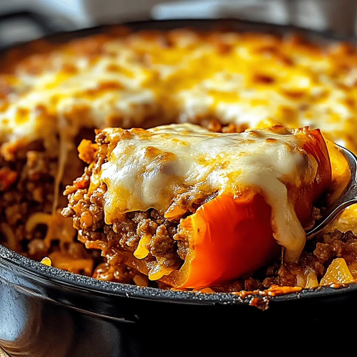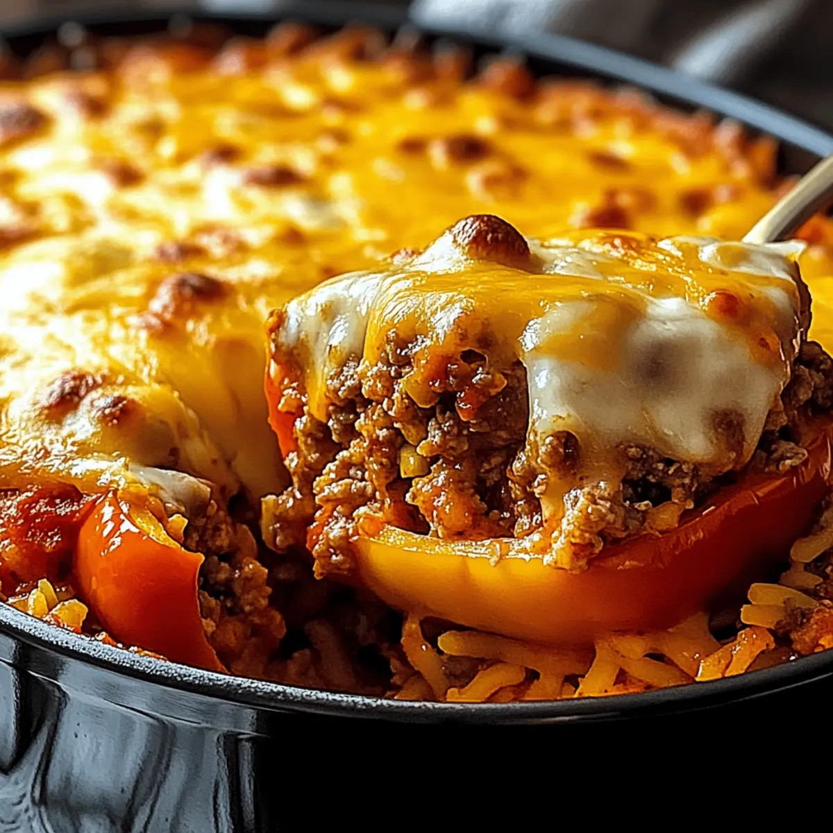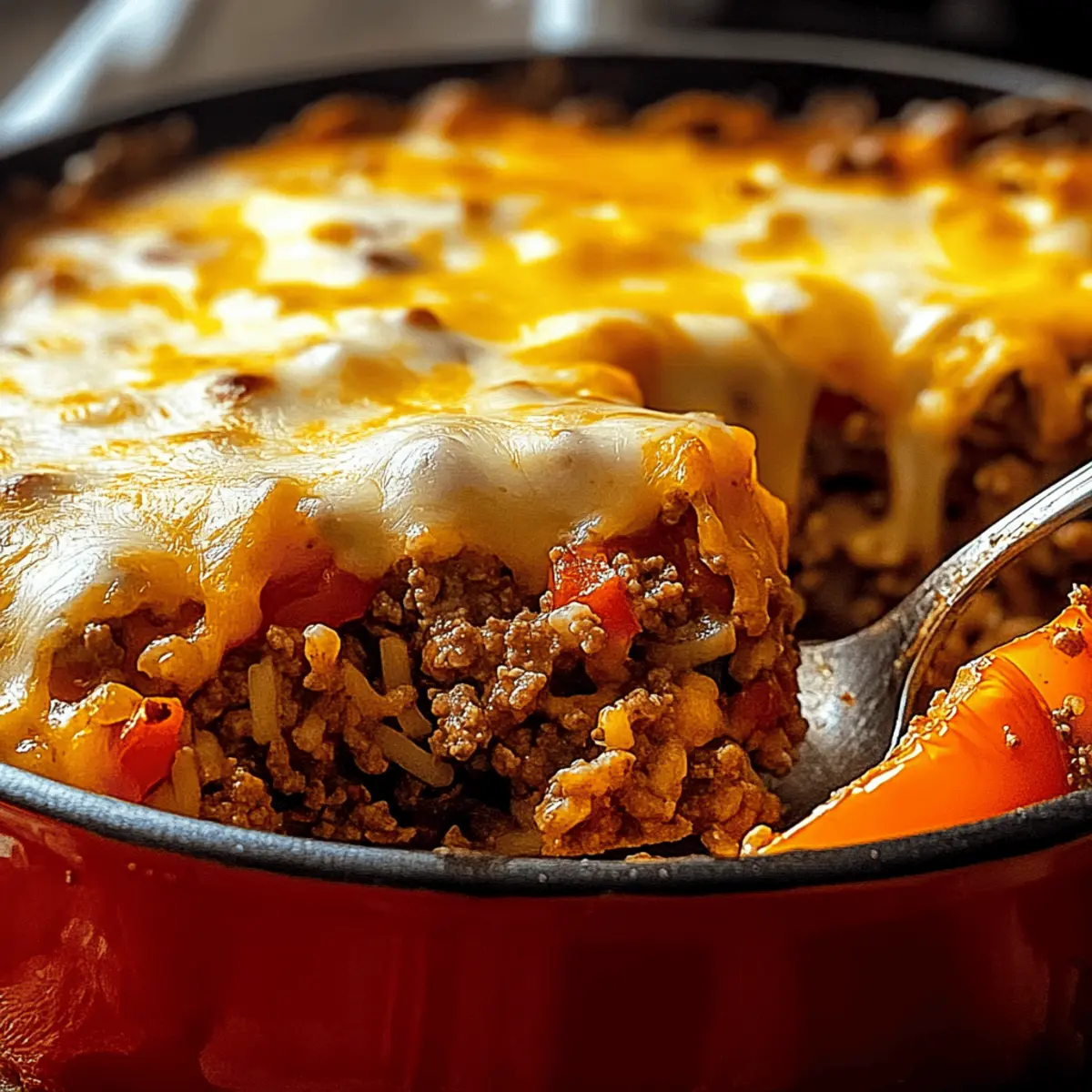 Jump to Recipe Print RecipeIn a whirlwind of spicy aromas and vibrant colors, I stumbled upon a delicious solution for busy weeknights: the Savory Stuffed Pepper Casserole. This dish seamlessly combines all the comforting flavors of traditional stuffed peppers into a hassle-free casserole that is perfect for sharing with family and friends. Not only does it come together in just about 50 minutes, but it’s also incredibly customizable, allowing you to swap in your favorite proteins and veggies. Whether you’re looking to impress guests or just wanting a warm bowl of comfort after a long day, this easy weeknight dinner offers a satisfying escape from the fast-food routine. Curious about how a simple blend of ingredients can turn into such a cozy meal? Let’s dive into the recipe! Why Is This Casserole So Amazing? Comforting Flavors: This Savory Stuffed Pepper Casserole brings the nostalgic taste of stuffed peppers right to your dinner table, delivering warmth in every bite. Customizable Delight: Easily swap proteins or veggies based on your mood; think ground turkey or even beans for a vegetarian twist! Time-Saving: With just 50 minutes to prepare and bake, it’s the perfect choice for busy weeknights. One-Dish Wonder: Say goodbye to multiple pots and pans; everything comes together beautifully in one dish for effortless cleanup. Crowd-Pleasing Appeal: Whether for family dinners or casual gatherings, this casserole is sure to become a hit like my delicious Ricotta Stuffed Peppers. Hearty and Filling: The combination of rice, meat, and cheese makes it incredibly satisfying, perfect for chasing away hunger without fuss. Get ready to enjoy a cozy meal that steers you away from fast food and into the comforting embrace of home-cooked goodness! Stuffed Pepper Casserole Ingredients • Are you ready to create a comforting masterpiece? For the Casserole Olive Oil – Adds richness and helps sauté vegetables; feel free to substitute with vegetable oil if you prefer. Lean Ground Beef – Provides protein and heartiness; ground turkey or plant-based alternatives work wonderfully too. Yellow Onion – Adds sweetness and depth of flavor; switch to shallots for an aromatic twist. Red Bell Pepper – Contributes sweetness and vibrant color; consider orange or yellow bell peppers for a variation. Green Bell Pepper – Adds crunch and additional flavor; any color of bell pepper can substitute in a pinch. Garlic – Provides aromatic flavor; adjust the quantity based on how much you love garlic! Italian/Cajun Seasoning – For seasoning depth; a mix of dried herbs can enhance the flavor profile in the absence of these. Worcestershire Sauce – Adds umami flavor; soy sauce is a suitable standby if needed. Salt – Enhances flavors; adjust according to your taste, especially with other canned ingredients involved. Ground Black Pepper – Adds spice and warmth; freshly cracked black pepper is usually best for flavor. Canned Diced Tomatoes – Provides moisture and acidity; fresh tomatoes can substitute if they’re in season. Long Grain White Rice – Serves as a filling component; brown rice can be used, but keep in mind it needs more water and cooking time. Beef Broth – Adds flavor and moisture; using vegetable broth creates a fantastic vegetarian option. Shredded Cheese (Cheddar/Mozzarella) – For a cheesy topping that everyone will love; don’t hesitate to mix different cheese blends for unique flavors. Fresh Parsley – Adds a pop of color and freshness; it can also be replaced with other similar fresh herbs if needed. Embrace the delicious possibilities of this Stuffed Pepper Casserole—each ingredient plays a vital role in crafting a comforting meal you’ll return to time and time again! Step‑by‑Step Instructions for Savory Stuffed Pepper Casserole Step 1: Preheat Oven Begin by preheating your oven to 350°F (175°C). This ensures that your Savory Stuffed Pepper Casserole will bake evenly and thoroughly. While the oven warms, you can prepare the rest of your ingredients, making the cooking process smoother and more efficient. Step 2: Brown Beef In a large skillet, heat a drizzle of olive oil over medium-high heat. Add the lean ground beef and cook, stirring occasionally, for about 6-8 minutes until it is browned and cooked through. As it cooks, use a spatula to break it into small pieces, ensuring even browning and a hearty base for your casserole. Step 3: Sauté Vegetables Next, add the diced yellow onion, red bell pepper, and green bell pepper to the skillet with the beef. Sauté these colorful veggies for about 5-7 minutes, or until they are tender and the onion becomes translucent. Stir in minced garlic and let it cook for another minute, releasing its aromatic flavor into the mixture. Step 4: Season Now, sprinkle in the Italian seasoning, Worcestershire sauce, salt, and ground black pepper. Stir everything together and let it simmer for about 1 minute. This step enhances the flavors of your Savory Stuffed Pepper Casserole, adding depth and richness as the spices meld with the meat and vegetables. Step 5: Combine Rice & Liquid Time to bring the casserole together! Stir in the canned diced tomatoes, uncooked long-grain white rice, and beef broth. Increase the heat until the mixture reaches a boil, then reduce to low, cover, and let it simmer for about 20 minutes. This allows the rice to absorb the flavors and moisture, becoming an integral part of the casserole. Step 6: Assemble Casserole Once the rice is tender and has absorbed most of the liquid, transfer the hearty mixture into a greased baking dish. Spread it out evenly and then sprinkle a generous layer of shredded cheese on top. This cheesy topping not only enhances the flavor but will create a beautiful golden crust as it bakes. Step 7: Bake Place the baking dish into your preheated oven and bake for 25 minutes. Keep an eye on it, and watch for the cheese to melt and bubble, turning a lovely golden color. Your Savory Stuffed P