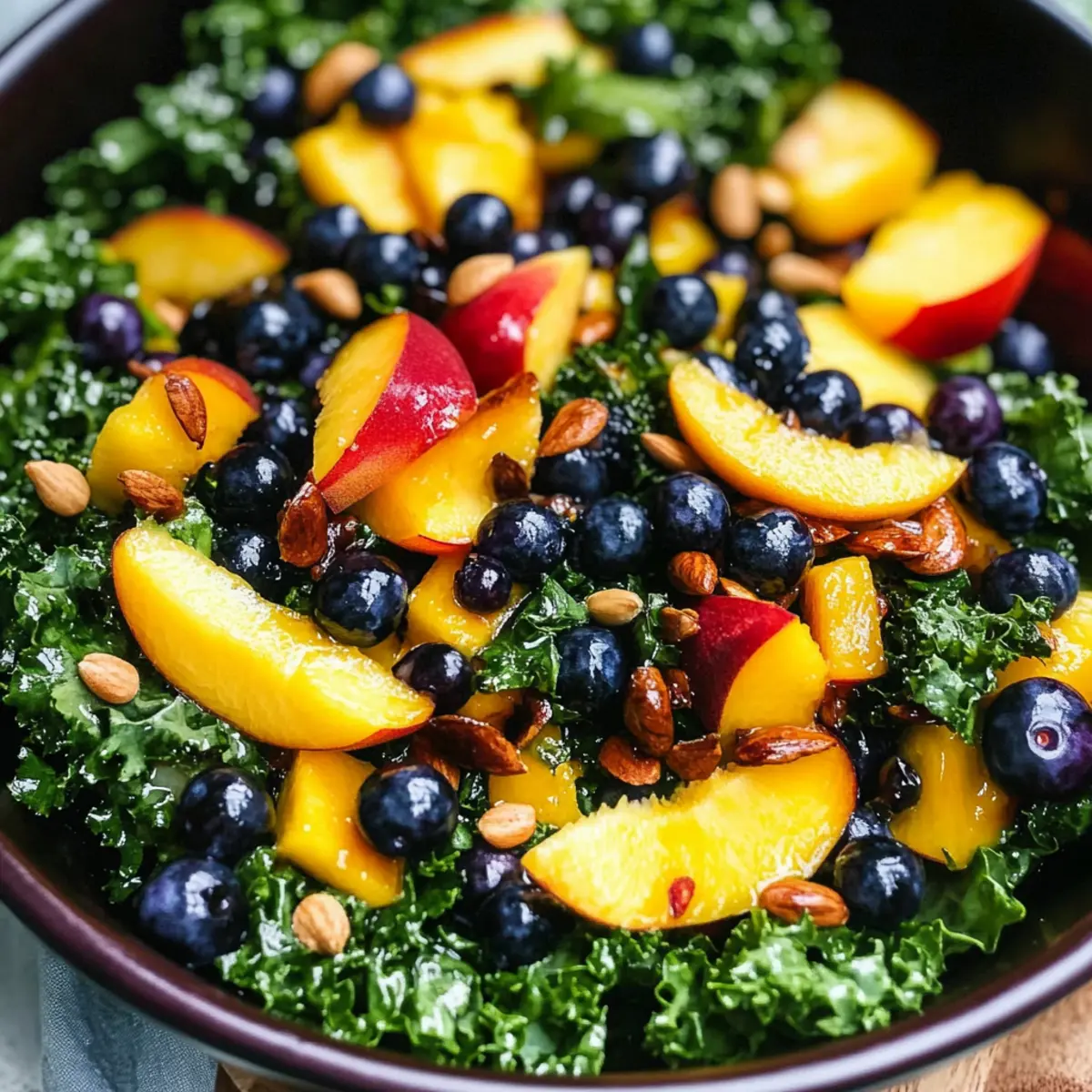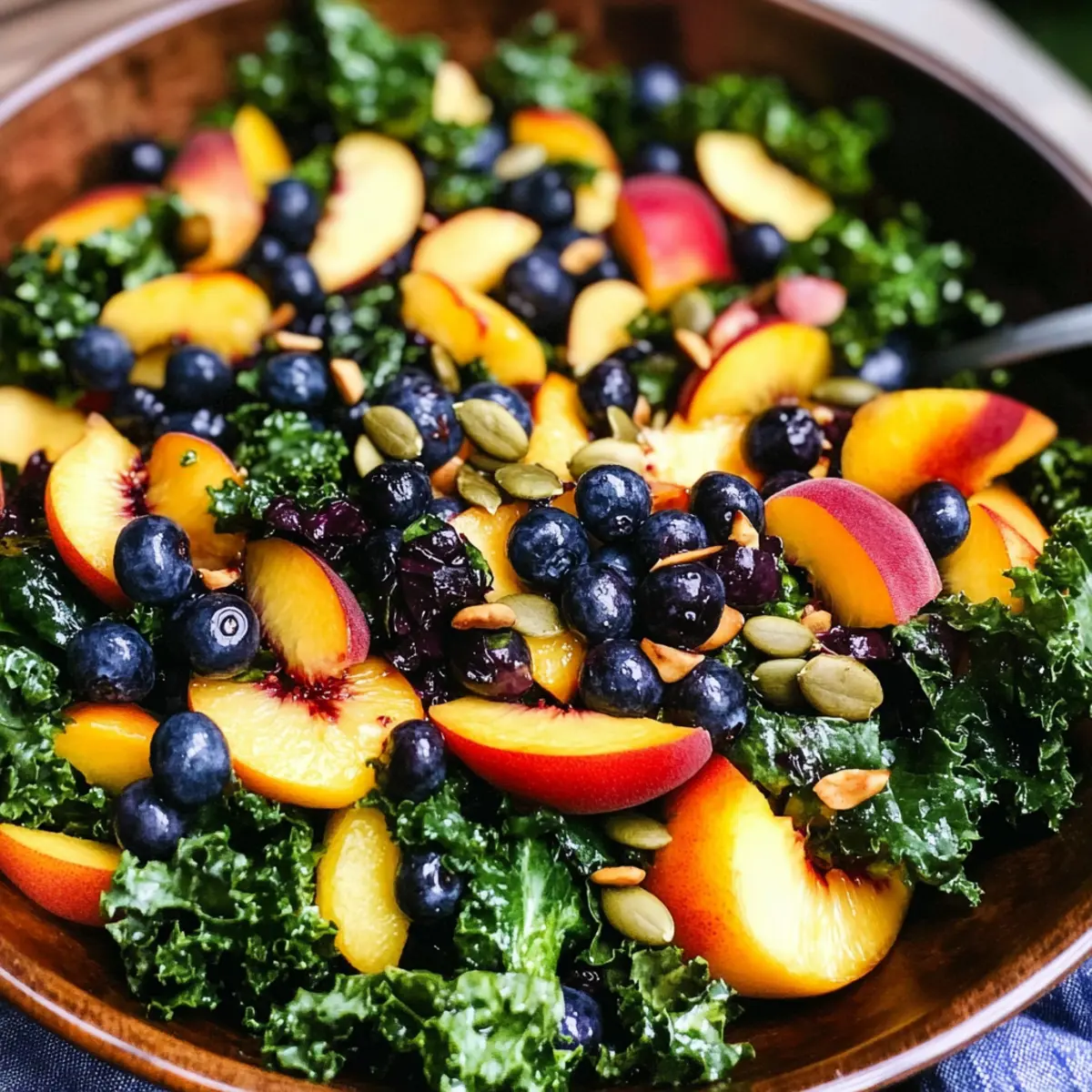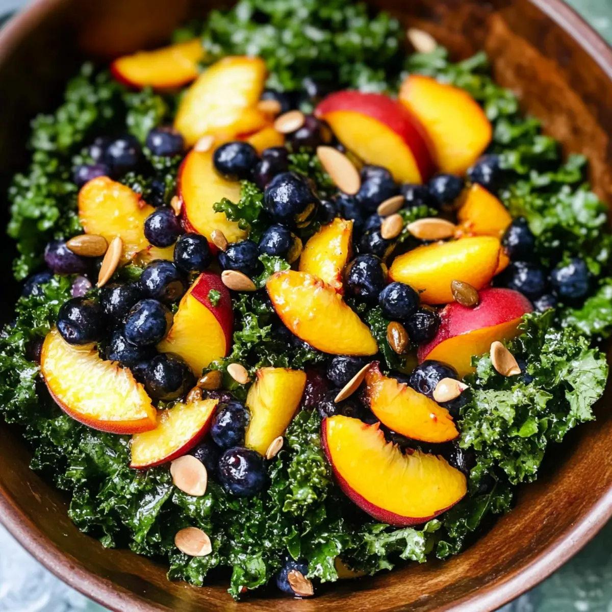 Jump to Recipe Print RecipeOn a lazy summer afternoon, I found myself surrounded by the vibrant colors of a farmer’s market, the sweetness of ripe peaches filling the air—a reminder that summer is a feast for the senses. That’s when I decided to whip up a delightful Summer Peach Blueberry Kale Salad that not only celebrates fresh ingredients but also makes healthy eating feel indulgent. This easy-to-make dish features the crispness of massaged kale, juicy peaches, and plump blueberries, all drizzled with a zesty honey-lemon vinaigrette. It’s crowd-pleasing and packed with nutrients, making it the perfect side for barbecues or a refreshing lunch option. Are you ready to bring some summer flair to your meals? Why is this salad a summer must-try? Vibrant flavors come together in this Summer Peach Blueberry Kale Salad, creating a dish that sings with freshness. Nutrient powerhouse: Packed with vitamins from kale and superfoods like peaches and blueberries, this salad is as healthy as it is delicious. Easy prep makes it a breeze to whip up on busy days or for last-minute gatherings. Versatile pairing options allow you to enjoy it alongside grilled meats or as a stand-alone lunch, giving you flexibility. Crowd-pleaser for all occasions—it’s a refreshing addition to summer barbecues, just like our popular Peach Cobbler Buttery and Berry Caprese Salad. Summer Peach Blueberry Kale Salad Ingredients For the Salad • Kale – A leafy green providing structure and nutrition; choose green curly kale for the best flavor and texture. • Peaches – Fresh, juicy fruits that add natural sweetness; opt for ripe or slightly underripe peaches, cutting them just before serving to prevent browning. • Blueberries – Sweet and tangy berries filled with antioxidants; smaller blueberries offer the best flavor balance. • Pepitas – Toasted pumpkin seeds contribute crunch and nuttiness; roast them to enhance flavor, found in the nut/seed aisle. For the Vinaigrette • Olive Oil – The base for the vinaigrette, helping to massage the kale; use a mild-tasting olive oil to avoid overpowering other flavors. • Lemons – Fresh juice is essential for the vinaigrette and kale massage, as the acidity brightens the dish’s flavors; adjust oil if too tart. • Honey – A natural sweetener for the vinaigrette, enhancing the dish’s overall taste. • Cracked Black Pepper – Adds necessary seasoning to the vinaigrette; adjust according to your taste preference. Remember, this delightful Summer Peach Blueberry Kale Salad is not just a feast for your eyes, but a nutritious choice for your body! Step‑by‑Step Instructions for Summer Peach Blueberry Kale Salad Step 1: Toast Pepitas Preheat your oven to 375°F (190°C). Spread the pepitas on a parchment-lined baking sheet. Toast them in the oven for about 5-6 minutes until they become lightly golden and aromatic. Keep an eye on them to prevent burning, and once done, set them aside to cool while you prepare the salad. Step 2: Make Vinaigrette In a medium bowl, whisk together the fresh lemon juice, honey, olive oil, and a sprinkle of cracked black pepper to create the vinaigrette. This mixture should look smooth and well combined, with a balanced sweet and tangy flavor. Cover the bowl and refrigerate the vinaigrette until needed, allowing the flavors to meld together. Step 3: Massage Kale Remove the tough stems from the kale and chop the leafy greens into bite-sized pieces. Place the chopped kale in a large bowl and drizzle a splash of olive oil along with the juice from one lemon over the top. With clean hands, massage the kale for about 5 minutes until it softens and deepens in color, enhancing the texture for your Summer Peach Blueberry Kale Salad. Step 4: Prepare Fruit Rinse the fresh peaches under cold water, then slice them into bite-sized pieces, discarding the pit. Rinse the blueberries gently in a colander and let them drain. Keep the fruit aside as they will add vibrant sweetness and juiciness to the salad while complementing the kale’s richness. Step 5: Toss Salad In the bowl with the massaged kale, combine the diced peaches and blueberries gently. Drizzle the chilled honey-lemon vinaigrette over the salad mixture, ensuring everything is evenly coated. Toss everything carefully to maintain the integrity of the fruit, allowing the flavors of the Summer Peach Blueberry Kale Salad to come together beautifully. Step 6: Serve Spoon the salad into bowls, and just before serving, generously garnish with the toasted pepitas. The added crunch from the pepitas will elevate the dish, creating a delightful contrast to the tender kale and juicy fruits. Enjoy your refreshing Summer Peach Blueberry Kale Salad as a perfect accompaniment to any summer meal! Summer Peach Blueberry Kale Salad Variations Feel free to let your creativity shine and customize this refreshing salad to suit your taste and dietary needs! Arugula Swap: Replace kale with peppery arugula for a different flavor profile. Its bite adds a zestful twist to the salad. Nutty Crunch: Add chopped walnuts or almonds to boost the salad’s crunch factor and enrich its nutritional content. The nutty flavor beautifully complements the sweetness of the peaches and blueberries. Berry Medley: Mix in raspberries or strawberries along with the blueberries and peaches for a delightful mixed berry experience. This adds layers of flavor and brings more color to your dish. Feta Finish: Crumble some feta cheese over the top for a creamy, tangy finish that pairs nicely with the sweet fruits. The contrast enriches the overall taste and texture. Spicy Kick: For those who like a little heat, throw in sliced jalapeños or a sprinkle of red pepper flakes in the vinaigrette. This unexpected spiciness harmonizes well with the sweet elements. Dried Fruits: Incorporate dried cranberries or apricots for additional sweetness and chewiness. They add an interesting texture and depth to the salad. Citrus Zing: Experiment w