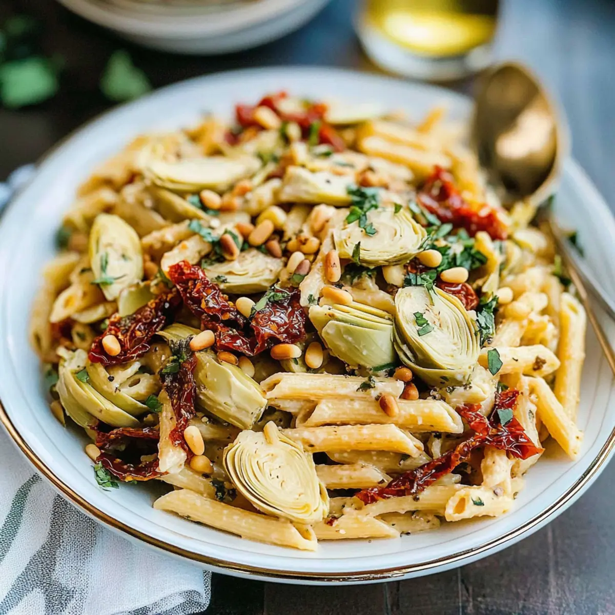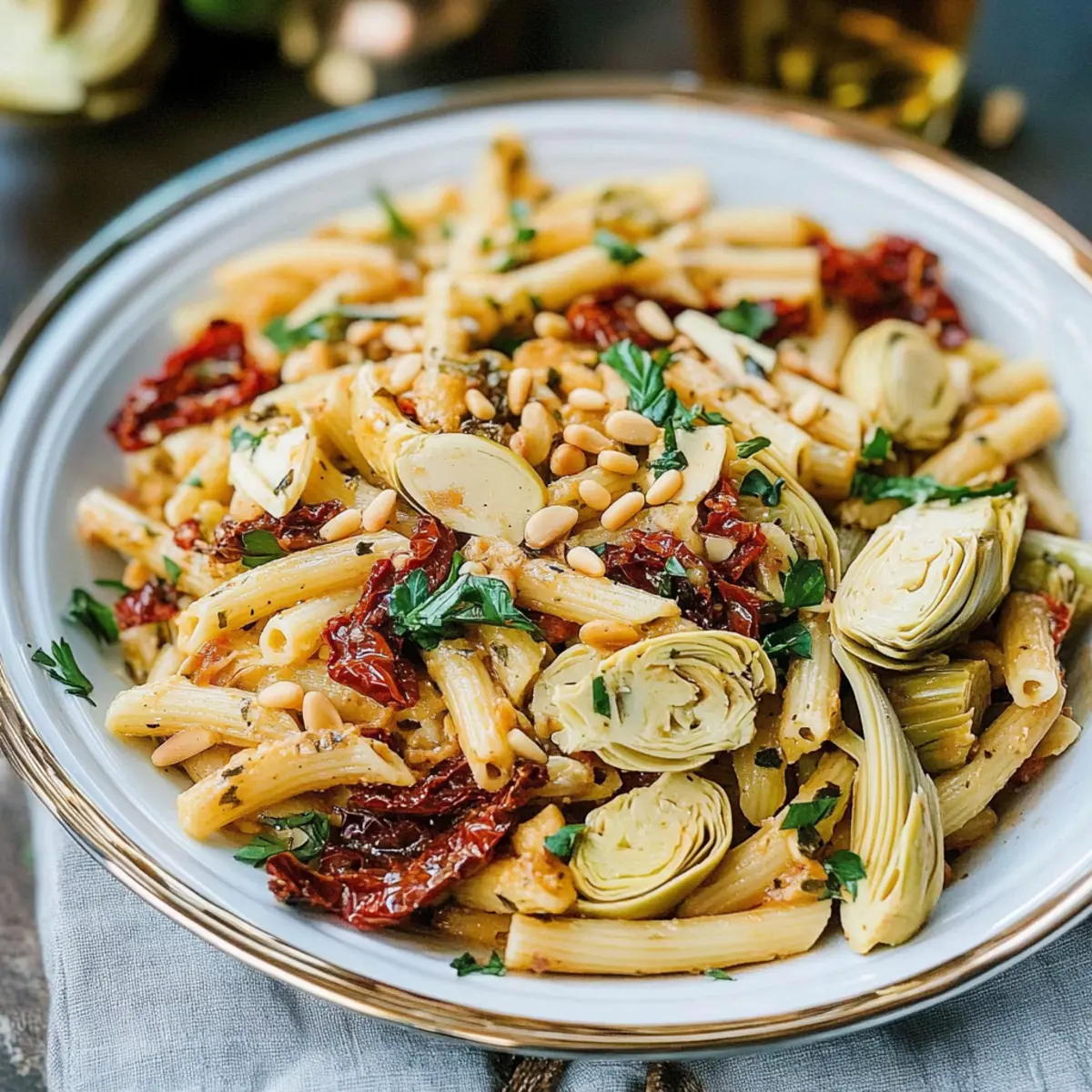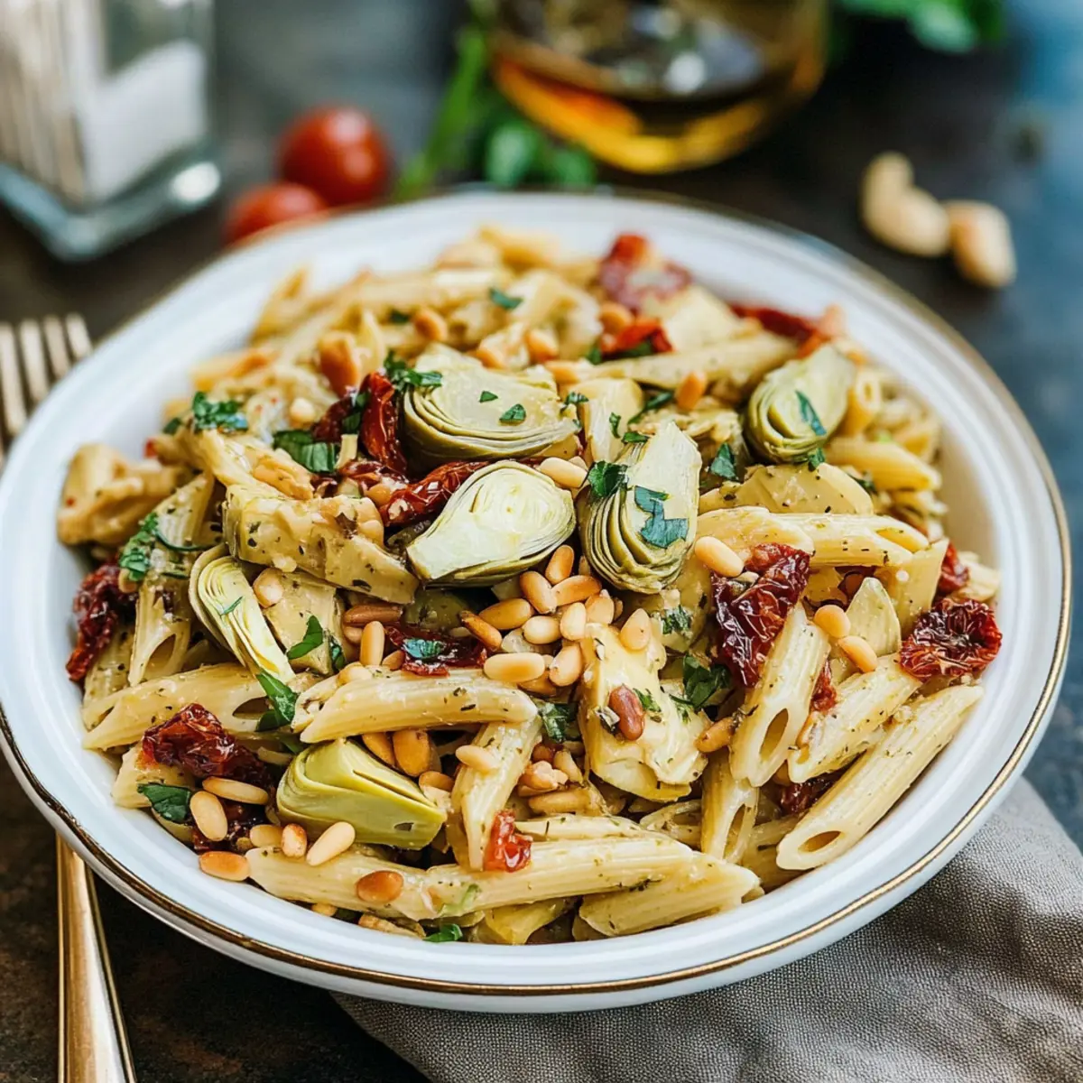 Jump to Recipe Print RecipeAs I stirred the pasta in a warm pot, the vibrant hues of sun-dried tomatoes and artichoke hearts brought a rush of summer memories. This Sun-Dried Tomato Pasta Salad is more than just a recipe—it’s a celebration of seasonal flavors that can transform any gathering into a feast. With its quick prep time and hearty vegetarian goodness, this dish shines as either a refreshing side or a complete meal. Each bite perfectly balances zesty, salty, and sweet notes, making it an absolute crowd-pleaser for those looking to escape the fast-food routine. Wondering how to whip up this delightful salad that requires no cooking skills whatsoever? Let’s dive in! Why is this pasta salad a must-try? Vibrant Colors: The combination of sun-dried tomatoes and artichoke hearts creates a stunning visual appeal, making it a showstopper on your table. Quick Prep Time: In just about 30 minutes, you can prepare a dish that is both delicious and satisfying—perfect for busy weeknights or last-minute gatherings. Hearty and Satisfying: This salad is filling enough to stand alone, yet versatile enough to pair wonderfully with grilled chicken or seafood, making it an ideal choice for any meal. Endless Customization: Whether you want to swap in your favorite pasta shape or add other seasonal veggies, this recipe allows for creativity while keeping those delightful flavors intact. Healthy Ingredients: Packed with wholesome ingredients, this salad offers a good mix of healthy fats and fibers, making it a guilt-free indulgence. You might also enjoy our refreshing Radish Salad Roasted or the delightful texture of Smashed Potato Salad—both are perfect sides for your summer cooking adventures! Sun-Dried Tomato Pasta Salad Ingredients For the Vinaigrette Sun-Dried Tomatoes – Adds tangy sweetness and depth to the vinaigrette; use drained oil-packed tomatoes for better texture. Fresh Lemon Juice – Provides acidity to balance the richness of the oil and complements the sun-dried tomatoes. Garlic – Enhances flavor with its aromatic profile; must be peeled before use. Dijon Mustard – Acts as an emulsifier for the vinaigrette and adds a slight tang. Extra Virgin Olive Oil – Main fat in the dressing, contributing richness and healthy fats. Fresh Oregano – Adds a fragrant herbal note; sub with dried oregano for convenience. Kosher Salt & Black Pepper – Essential seasonings for flavor enhancement. For the Pasta Salad Short Pasta (Casarecce) – Provides structure and captures the vinaigrette; can substitute with penne, fusilli, or orecchiette. Frozen Artichoke Hearts – Use thawed for ease; they hold their shape better than canned options. Olive Oil (for sautéing) – Adds depth when sautéing artichokes. Chopped Shallots – Provides sweetness and crunch; can use red onion as a substitute. Capers – Introduces a briny flavor; ensure they are drained well. Crushed Red Pepper Flakes – Optional for a mild kick in flavor. Toasted Pine Nuts – Adds a rich, nutty flavor and crunch; can substitute with walnuts or omit for a nut-free option. Chopped Flat Leaf Parsley & Fresh Basil – Fresh herbs for garnish and flavor; can vary based on preference. Shaved Pecorino Romano – For umami and creaminess; substitute with Parmesan if needed. Step‑by‑Step Instructions for Sun-Dried Tomato Pasta Salad Step 1: Prepare the Vinaigrette In a food processor, combine the sun-dried tomatoes, fresh lemon juice, peeled garlic, Dijon mustard, kosher salt, and black pepper. Pulse until well blended, then slowly drizzle in the extra virgin olive oil while the processor runs. Continue blending until the mixture is emulsified and creamy. Finally, add fresh oregano and pulse lightly to incorporate, creating a zesty dressing for your sun-dried tomato pasta salad. Step 2: Cook the Pasta Bring a large pot of salted water to a rolling boil and add the short pasta, such as casarecce. Cook the pasta until it reaches just al dente, about 8-10 minutes, ensuring it retains a slight bite. Once cooked, drain the pasta and spread it out on baking sheets to cool, which prevents sticking and gives your sun-dried tomato pasta salad a delightful texture. Step 3: Sauté Artichokes In a skillet, heat a drizzle of olive oil over medium heat. Add the thawed artichoke hearts, seasoned with kosher salt and black pepper, and sauté for 5-7 minutes until they are lightly golden and fragrant. Once they achieve a lovely color, remove them from heat and toss in chopped shallots, capers, and crushed red pepper flakes—mixing everything together enhances the flavor profile of the salad. Step 4: Combine Ingredients In a large mixing bowl, combine the cooled pasta with the prepared vinaigrette, ensuring every strand is coated. Gently fold in the sautéed artichoke mixture, toasted pine nuts, chopped parsley, and fresh basil. Toss everything together until well-combined, allowing the vibrant flavors of the sun-dried tomato pasta salad to meld beautifully, and season with additional salt and pepper to taste. Step 5: Serve Transfer your sun-dried tomato pasta salad to a serving dish and let it sit for a few minutes at room temperature to allow the flavors to settle. This dish can be enjoyed right away or stored in the refrigerator for later. Serve it as a refreshing side dish or a satisfying main course, savoring the delightful combination of tangy and earthy notes. Make Ahead Options These Sun-Dried Tomato Pasta Salad with Artichoke Hearts are a lifesaver for busy home cooks looking to streamline their meal prep! You can prepare the vinaigrette up to 3 days in advance, ensuring those bright flavors develop beautifully. Simply store it in an airtight container in the refrigerator. Additionally, you can cook the pasta and sauté the artichokes ahead of time; these components will stay fresh when refrigerated separately for up to 24 hours. To maintain quality, allow everything to come to room temperature before serving, and toss the salad 