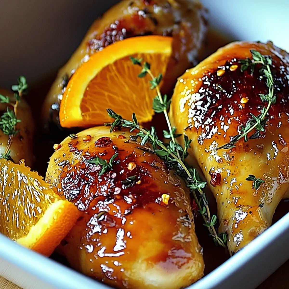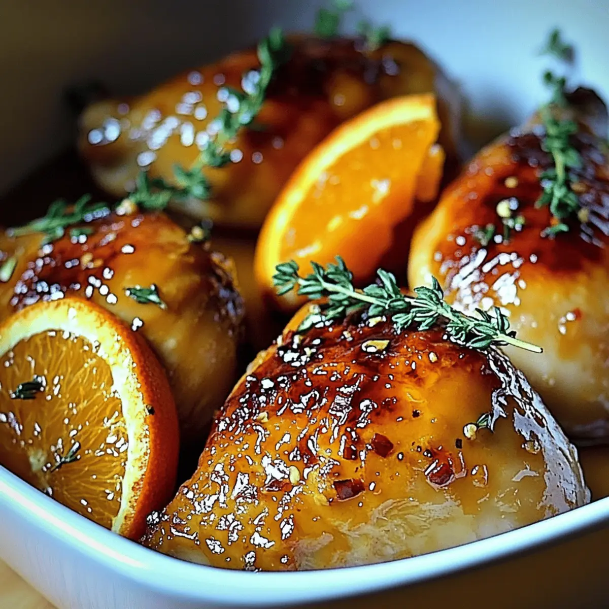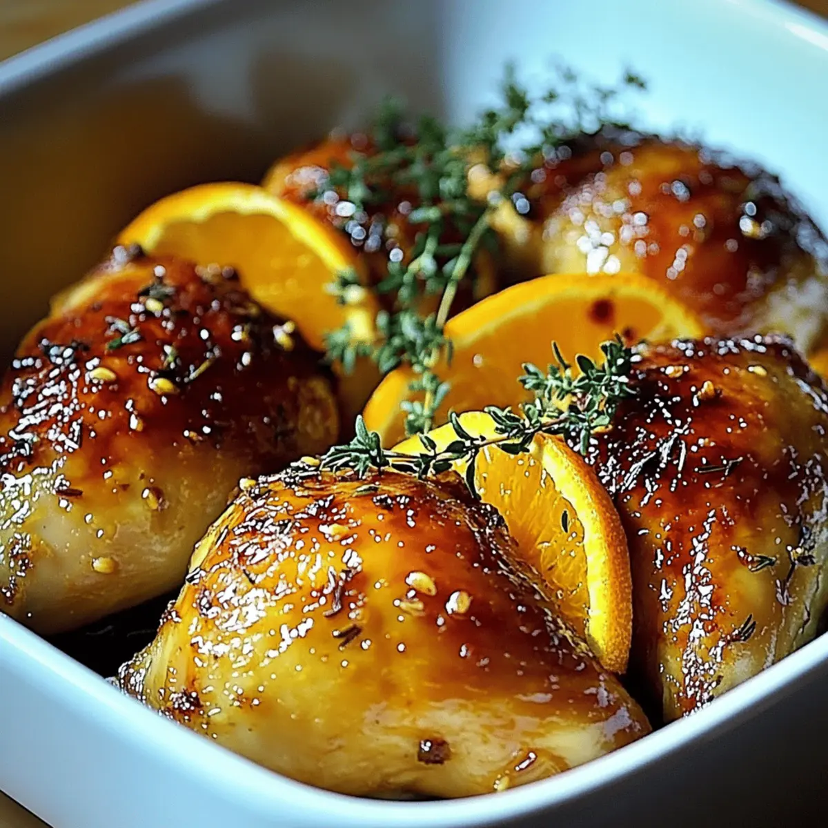 Jump to Recipe Print RecipeAs I entered my kitchen, the vibrant zests of fresh oranges filled the air, instantly lifting my spirits. Today, I’m sharing the recipe for Sweet and Savory Roasted Orange Chicken—a dish that masterfully combines citrus brightness with deep, savory caramelization. This meal is not only quick to whip up, making it a perfect choice for easy dinners, but it also brings the family together around the table, transforming a simple gathering into a flavorful feast. The delightful glaze and tender chicken pieces truly make this dish a winner, offering a healthier alternative to rushed takeout meals. Are you ready to experience a burst of flavor that will make your kitchen the happiest place at home? Let’s dive into this delightful recipe! Why Is This Orange Chicken Special? Simplicity at its best: The recipe features easy steps that anyone can follow, making it perfect for both novice cooks and seasoned chefs. Flavorful glaze: The blend of honey and fresh orange juice gives a sticky, sweet, and savory kick that elevates the chicken beautifully. Versatile meal option: Serve it with mashed potatoes or a fresh salad, just like with my Honey Butter Chicken for a comforting dinner your family will love. Time-saving dish: With just 25-30 minutes in the oven, you’ll spend less time cooking and more time enjoying with loved ones. Crowd-pleaser: This dish is perfect for special gatherings, easily impressing guests with its vibrant appearance and delicious taste. Feel free to explore variations by adding vegetables or substituting different citrus fruits! Sweet and Savory Roasted Orange Chicken Ingredients For the Chicken Bone-in Chicken Pieces – The star of the dish, delivering a juicy texture; boneless, skinless thighs can reduce cooking time by 10-15 mins. Garlic – A flavor enhancer; feel free to use garlic powder if you’re in a pinch. Salt & Pepper – Essential seasonings to bring out the chicken’s flavor; adjust to your taste. Thyme – Adds earthy, herbaceous notes; rosemary or oregano can work as fantastic substitutes. Red Pepper Flakes (optional) – For those who enjoy a bit of heat; skip it for a milder dish. For the Glaze Fresh Oranges – Provide a vibrant citrus sweetness; blood oranges or mandarins can also make delightful substitutes. Honey – Adds natural sweetness and aids in caramelizing the glaze; maple syrup serves as a great vegan alternative. Ready to create the best Sweet and Savory Roasted Orange Chicken that your family will rave about? Let’s cook up this delicious meal together! Step‑by‑Step Instructions for Sweet and Savory Roasted Orange Chicken Step 1: Preheat the Oven Begin by preheating your oven to 400°F (200°C). This high temperature is essential for achieving that golden, crispy skin on the chicken. Gather your roasting pan, as this will be the centerpiece for the Sweet and Savory Roasted Orange Chicken. While the oven heats, you can prepare the chicken, so everything is ready to go! Step 2: Prepare the Chicken Next, pat the bone-in chicken pieces dry with paper towels to ensure they roast beautifully. Season generously with salt, pepper, minced garlic, and fresh thyme, allowing each piece to be thoroughly coated. This will enhance the chicken’s flavor and help the skin crisp up nicely as it roasts in the oven. Step 3: Make the Glaze In a separate small bowl, combine freshly squeezed orange juice, honey, and red pepper flakes (if using) to create the sweet and tangy glaze. Mix well until the honey has dissolved into the juice, creating a luscious blend. This glaze will not only flavor the chicken but also form a gorgeous sticky coating while roasting. Step 4: Assemble in the Roasting Pan Place the seasoned chicken pieces in a roasting pan, making sure they are spaced out for even cooking. Pour the prepared orange glaze over the chicken, ensuring each piece is nicely coated. The sweet and savory flavor from the glaze will infuse into the chicken as it roasts, making every bite delectable. Step 5: Roast the Chicken Slide the roasting pan into the preheated oven and let the chicken roast for 25-30 minutes. During this time, the skin will become beautifully golden, and the glaze will caramelize. To keep the chicken moist, baste it halfway through with the juices from the pan, enhancing the flavor while preventing dryness. Step 6: Check for Doneness After 25-30 minutes, check the internal temperature of the chicken pieces with a meat thermometer. They should reach at least 165°F (74°C) for safe consumption. If the skin isn’t crispy enough yet, consider leaving it in for an extra couple of minutes. This check ensures your Sweet and Savory Roasted Orange Chicken is perfectly cooked through and juicy. Step 7: Broil for a Crispy Finish For an extra crispy skin, switch your oven to broil and let the chicken broil for an additional 2-3 minutes. Keep a close eye during this time to prevent burning. The result will be an irresistibly crispy exterior that’s sure to impress anyone around the dinner table! Step 8: Let It Rest Once your chicken is gloriously golden and cooked to perfection, remove it from the oven and let it rest for about 5 minutes. This resting period allows the juices to redistribute, ensuring each piece remains tender and flavorful. Serving this lovely Sweet and Savory Roasted Orange Chicken immediately after resting guarantees a splendid family meal. Sweet and Savory Roasted Orange Chicken Variations Get ready to unleash your creativity in the kitchen! Customize this recipe to fit your taste and dietary preferences. Citrus Twist: Replace oranges with tangerines or lemons for a fresh flavor twist. Veggie Boost: Add chopped carrots or Brussels sprouts to the roasting pan for a colorful, nutritious one-pan meal. Herb Change-up: Swap thyme for rosemary or cilantro to explore different herbaceous notes. Spicy Kick: Amp up the heat with extra red pepper flakes, or add diced jalapeños for a zesty challenge. Sweet