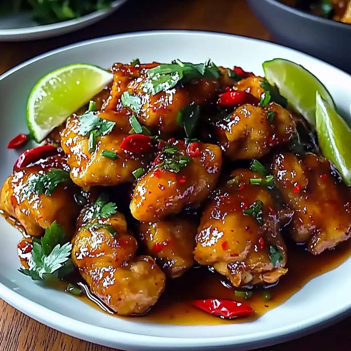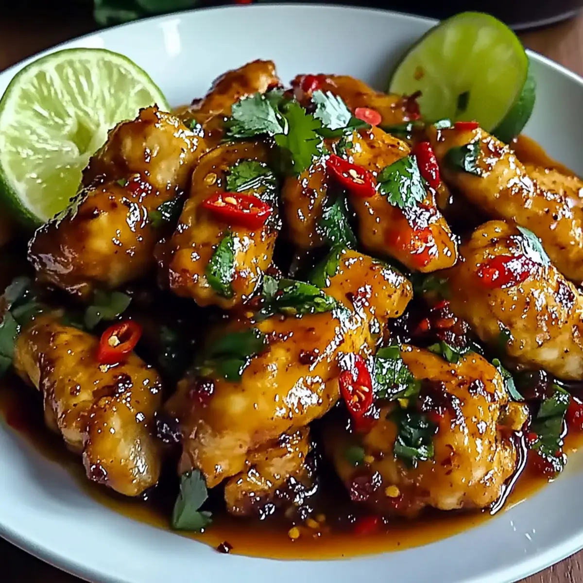 4. Transfer the coated chicken to a serving plate, drizzle with remaining sauce, and garnish with fresh herbs or lime wedges. Serve immediately.