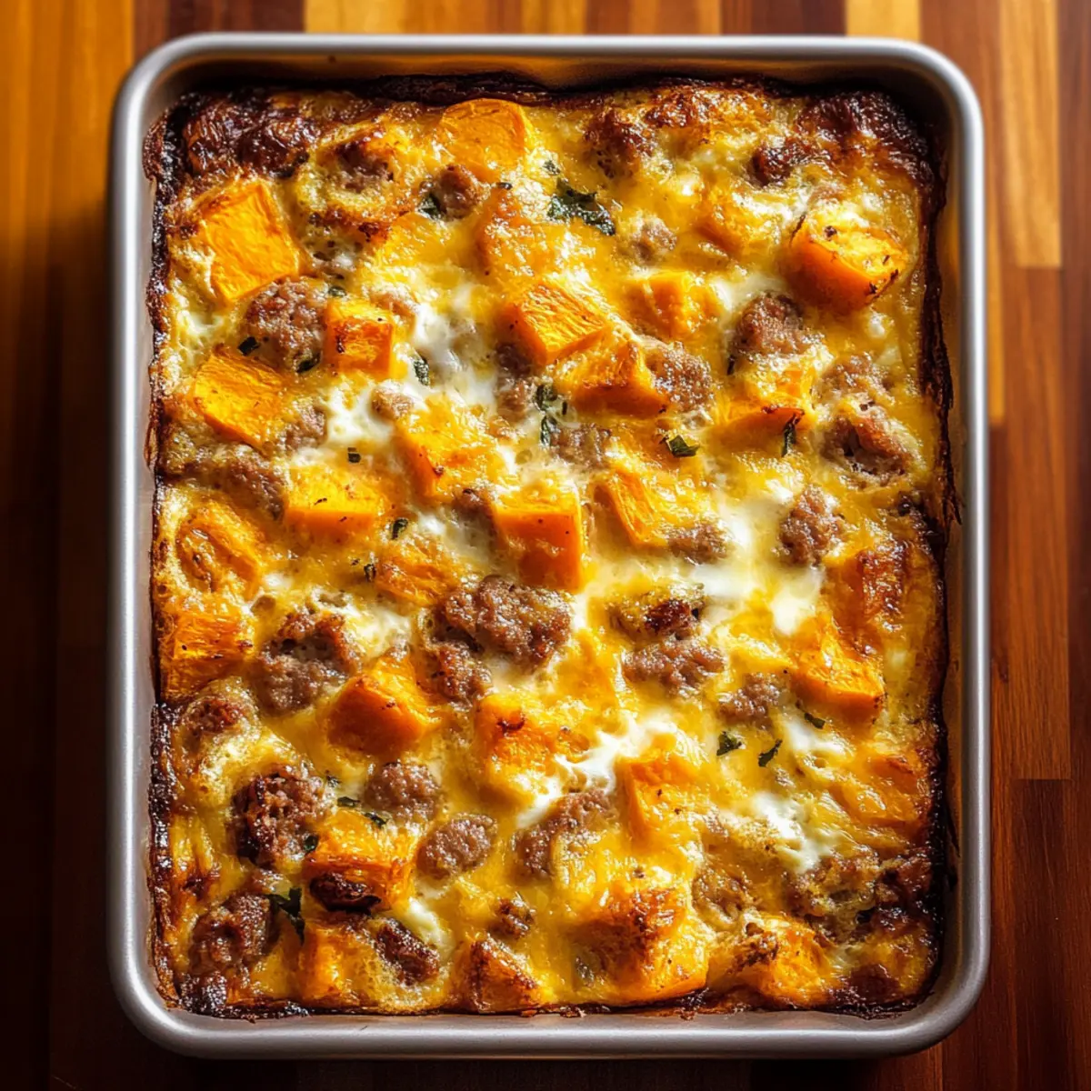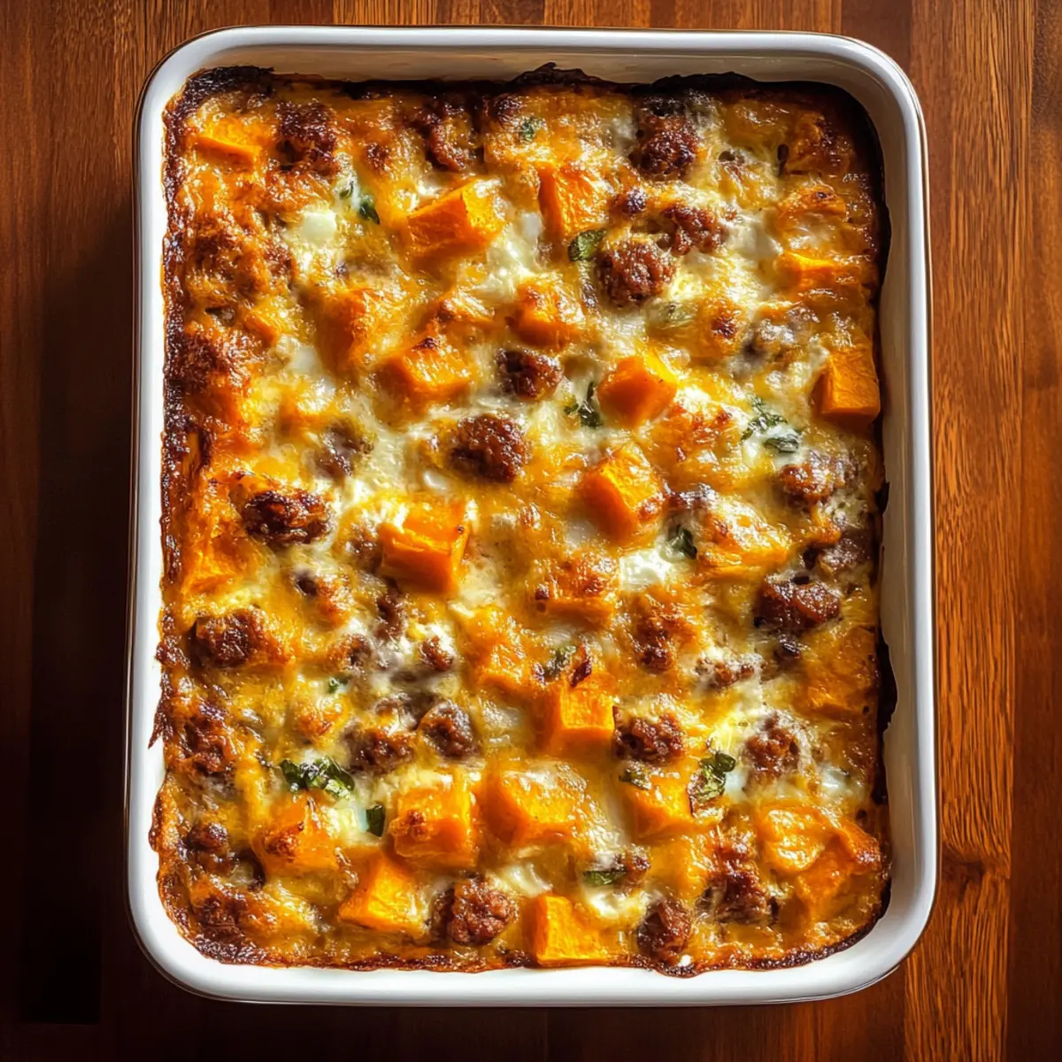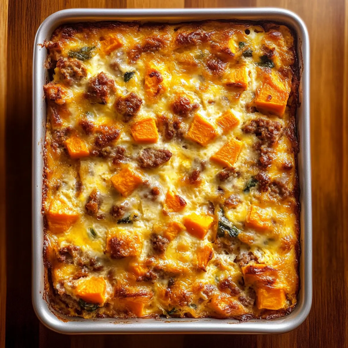 Jump to Recipe Print RecipeAs I pulled the warm casserole from the oven, the inviting aroma of sweet potatoes mingled with the savory notes of turkey sausage filled my kitchen. This Easy Sweet Potato Egg Casserole has quickly become a morning favorite in our home, offering a delightful blend of nutrition and comfort. Not only is it incredibly filling, but it can also be made ahead, letting you enjoy a stress-free start to your day. Each bite boasts a creamy texture thanks to the fluffy eggs and a hint of sweetness that perfectly complements the heartiness of the sausage. So, why settle for another rushed breakfast when you can savor a slice of this delicious creation? Let’s dive into this easy recipe and discover how to make your mornings a bit brighter! Why is Sweet Potato Egg Casserole a Must-Try? Nutritious Start: Packed with protein and fiber, this casserole fuels your mornings perfectly. Effortless Meal Prep: Prepare it the night before with minimal fuss—just pop it in the oven when you wake up! Flavorful Harmony: The sweet potatoes meld beautifully with turkey sausage and fresh herbs, creating a delightful balance. Versatile Options: Switch up the ingredients to fit dietary preferences—think plant-based sausage or different cheeses! Crowd-Pleaser: Ideal for family gatherings or brunch with friends, it serves a deliciously hearty breakfast everyone will love. Pair it with a refreshing fruit salad for a complete meal that feels as good as it tastes! Sweet Potato Egg Casserole Ingredients For the Casserole Sweet Potatoes – The star ingredient that brings a natural sweetness and a creamy texture; choose Garnet or Jewel varieties for the best flavor. Turkey Sausage – Adds a savory flavor and protein punch; can be swapped for chicken sausage or omitted for a vegetarian version. Eggs – Essential for structure; use large eggs for optimal creaminess. Milk – Contributes to the fluffiness of the casserole; substitute with almond milk for a dairy-free alternative. Onion – Boosts flavor and nutrition; leeks can be used as a flavorful substitute. Green Pepper – Adds a touch of sweetness and crunch; feel free to swap with red or yellow bell peppers for a different color. Garlic – Enhances the overall flavor profile; fresh minced garlic is best for robustness. Fresh Thyme – An aromatic herb that elevates the dish; dried thyme can work in a pinch. Salt & Pepper – Key seasonings that round out the dish; adjust to your taste preference. Shredded Cheese – Adds creaminess and a delightful flavor; cheddar or mozzarella are great options, or try a dairy-free cheese for a lighter touch. Optional Toppings Fresh Spinach – For an extra nutrient boost; mix it in before baking or add as a topping after removing from the oven. Jalapeños – For a spicy kick; mix into the casserole or sprinkle on top for added heat. You’ll love how the Sweet Potato Egg Casserole combines flavor and nutrition, making it a family favorite! Step‑by‑Step Instructions for Sweet Potato Egg Casserole Step 1: Preheat the Oven Begin by preheating your oven to 350°F (175°C). This temperature is perfect for baking the Sweet Potato Egg Casserole, allowing it to cook evenly and develop a golden, fluffy top. Make sure your oven reaches the desired heat before proceeding to the next step for optimal results. Step 2: Prepare the Vegetables In a large saucepan, heat a tablespoon of avocado oil over medium heat. Chop your sweet potatoes into 1-inch cubes along with the onion and green pepper. Sauté the vegetables in the heated pan for about 8-9 minutes, stirring occasionally, until they soften. Add minced garlic in the last 1-2 minutes of cooking to infuse the dish with flavor. Step 3: Combine in Casserole Dish Once your vegetables are sautéed, grease a 9×13-inch casserole dish with a touch of oil or butter. Spread the warm sautéed mixture evenly across the bottom of the dish. This layer of colorful veggies will be the flavorful base of your Sweet Potato Egg Casserole and will ensure every bite is packed with nutrition. Step 4: Cook the Turkey Sausage Using the same large saucepan, add the turkey sausage and sauté over medium heat until fully cooked, about 5-7 minutes. As it cooks, break the sausage into smaller pieces. Once browned and cooked through, mix the sausage with the sautéed vegetables in the casserole dish, ensuring everything is well incorporated. Step 5: Whisk the Egg Mixture In a large bowl, crack open the eggs and whisk them together with milk, fresh thyme, salt, pepper, and shredded cheese until the mixture is smooth. This egg mixture will add a creaminess to your Sweet Potato Egg Casserole, binding all the flavors together beautifully. Step 6: Assemble the Casserole Pour the whisked egg mixture evenly over the vegetable and turkey sausage layer in the casserole dish. Gently stir the mixture using a spatula or spoon to ensure that everything is integrated and evenly distributed. This will help your casserole cook uniformly and create a delightful balance of flavors. Step 7: Bake Place the assembled casserole in your preheated oven and bake for about 40-45 minutes. Keep an eye on the top; it should be set and firm to the touch. If it browns too quickly, tent it with aluminum foil. The result will be a beautifully baked Sweet Potato Egg Casserole that’s fluffy and inviting. Step 8: Cool & Serve After baking, remove the casserole from the oven and let it cool for about 15 minutes. This resting period allows the flavors to meld and makes slicing easier. Once cooled, cut into squares and serve warm, enjoying your perfect start to the day! Tips for the Best Sweet Potato Egg Casserole Uniform Cutting: Ensure sweet potatoes are cut into uniform 1-inch cubes to guarantee even cooking throughout the casserole. Avoid Overcrowding: When sautéing the vegetables, avoid overcrowding the pan; this prevents them from browning and enhances flavor. Drain Excess Liquid: To prevent a watery casserole, drai