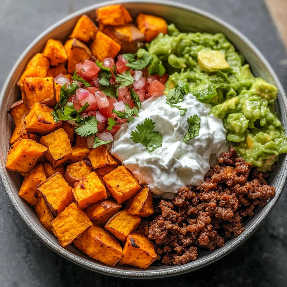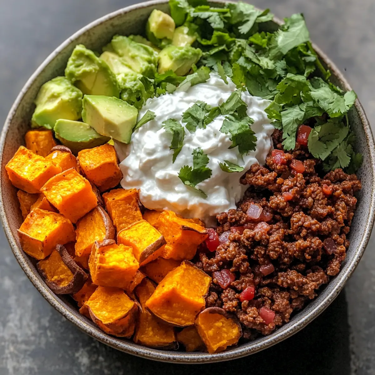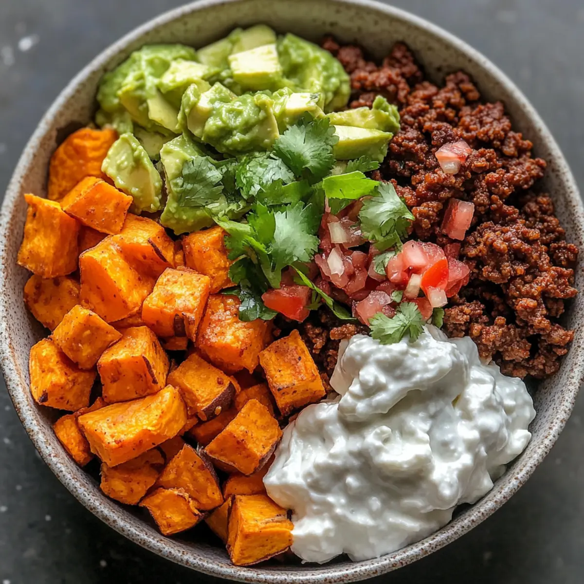 Jump to Recipe Print RecipeAs I rummaged through my pantry, I stumbled upon a bag of sweet potatoes that seemed to call out for a twist. That’s when the idea of a Sweet Potato Taco Bowl sparked in my mind, blending wholesome flavors with a hint of excitement. Picture this: smoky roasted sweet potatoes, generously topped with taco-seasoned beef, and a vibrant array of fresh ingredients that dance together in each bite. Not only is this recipe meal-prep friendly, meaning you’ll save time and money during the week, but it’s also customizable to please even the pickiest eaters. Whether you’re swaying towards a vegetarian option or craving something more traditional, this bowl allows for delicious creativity! So, what’s your favorite taco topping that you’ll throw into the mix? Why Is This Taco Bowl So Delightful? Flavor-Packed: Each bite of this Sweet Potato Taco Bowl delivers a burst of smoky sweetness from the roasted sweet potatoes and spicy warmth from the taco-seasoned beef, making it irresistible. Customizable Goodness: Tailor this dish to your taste! Swap ground beef for lentils or turkey, and mix in your preferred toppings like creamy guacamole or zesty pico de gallo. You might also love trying it with Peanut Sweet Potato for a different twist! Meal Prep Winner: Perfect for busy weekdays, this bowl is a breeze to prepare in advance and store separately. Just assemble when you’re ready to eat! Nutrient-Dense Delight: Packed with vitamins and healthy fats, each serving ensures you stay nourished without sacrificing flavor. It’s a dish you can feel good about. Crowd-Pleasing: Whether it’s a family dinner or a get-together with friends, this colorful bowl is sure to impress and satisfy even the pickiest eaters, inviting everyone to build their unique taco experience! Sweet Potato Taco Ingredients For the Bowl Sweet Potatoes – The heart of the dish, providing natural sweetness and nutrients; feel free to swap with butternut squash for a different flavor. Olive Oil – Essential for roasting, adding flavor and promoting caramelization; avocado oil is a great alternative if desired. Smoked Paprika – Adds a rich, smoky depth to the sweet potatoes; regular paprika or chili powder can be used for a spicy kick. For the Protein Ground Beef – The primary protein that brings warmth to the bowl; swap for turkey or plant-based lentils to cater to vegetarian preferences. Taco Seasoning – The blend that brings it all together; consider making your own with spices like chili powder and cumin for a fresher taste. For the Toppings Pico de Gallo – Fresh and vibrant, it adds crunch and brightness; mix diced tomatoes, onions, and cilantro for a delightful topping. Guacamole – Creamy and indulgent, it enhances flavors while providing healthy fats; mashing avocado with lime juice is a simple way to prepare it. Sour Cream – Provides a tangy creaminess; opt for dairy-free alternatives or omit it for a lighter taste. Craft your Sweet Potato Taco Bowl with these wholesome ingredients for a delightful feast that caters to every palate! Step‑by‑Step Instructions for Sweet Potato Taco Bowl Step 1: Preheat the Oven Begin by preheating your oven to 425°F (220°C). While the oven warms up, peel and cube the sweet potatoes into bite-sized pieces. In a large mixing bowl, toss the cubed sweet potatoes with olive oil, salt, pepper, and smoked paprika until evenly coated, ensuring each piece is glistening and flavorful. Step 2: Roast the Sweet Potatoes Spread the seasoned sweet potatoes in a single layer on a baking sheet, making sure to give them some space for optimal roasting. Slide the pan into the preheated oven and roast for about 15 minutes. After that time, give them a gentle flip and continue to roast for another 10 to 15 minutes until they are golden and tender, with caramelized edges. Step 3: Cook the Ground Beef While your sweet potatoes are roasting to perfection, heat a skillet over medium heat. Add the ground beef, breaking it apart as it browns. Cook for about 5–7 minutes until fully browned. If desired, drain any excess fat, then stir in taco seasoning along with a splash of water and let it simmer for 2-3 minutes until the flavors meld together. Step 4: Assemble the Taco Bowl Once the sweet potatoes are roasted and the beef is seasoned, it’s time to build your Sweet Potato Taco Bowl. In large bowls, layer the roasted sweet potatoes at the bottom, followed by a generous serving of the seasoned beef. Step 5: Add the Toppings Top your bowl with a vibrant mix of toppings! Spoon on fresh pico de gallo for a zesty crunch, followed by creamy guacamole. Finish off with a dollop of sour cream, and sprinkle some fresh cilantro on top for an extra burst of flavor. Step 6: Serve and Enjoy For added flair, serve your Sweet Potato Taco Bowl with lime wedges on the side for a refreshing squeeze just before eating. This colorful and delicious bowl invites everyone to enjoy a wholesome meal packed with flavors, perfect for sharing or savoring solo! Make Ahead Options These Sweet Potato Taco Bowls are a fantastic option for meal prep enthusiasts looking to save time during busy weeknights! You can roast the sweet potatoes and cook the ground beef up to 3 days in advance, storing them separately in airtight containers in the refrigerator to maintain their quality. Additionally, assemble your toppings like pico de gallo and guacamole ahead of time to minimize last-minute prep—just keep them in the fridge until you’re ready to serve. When it’s time to enjoy your meal, simply reheat the sweet potatoes and beef, then layer everything into bowls for a flavorful, satisfying dinner that feels freshly made! How to Store and Freeze Sweet Potato Taco Bowl Fridge: Store leftover taco bowls in airtight containers, and enjoy within 3 days for optimal freshness. Keeping components separate helps maintain texture. Freezer: Freeze assembled bowls in airtight containers for up to 2 months. When 