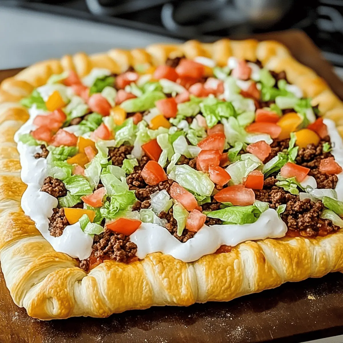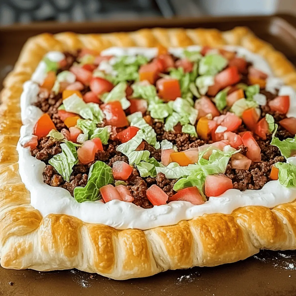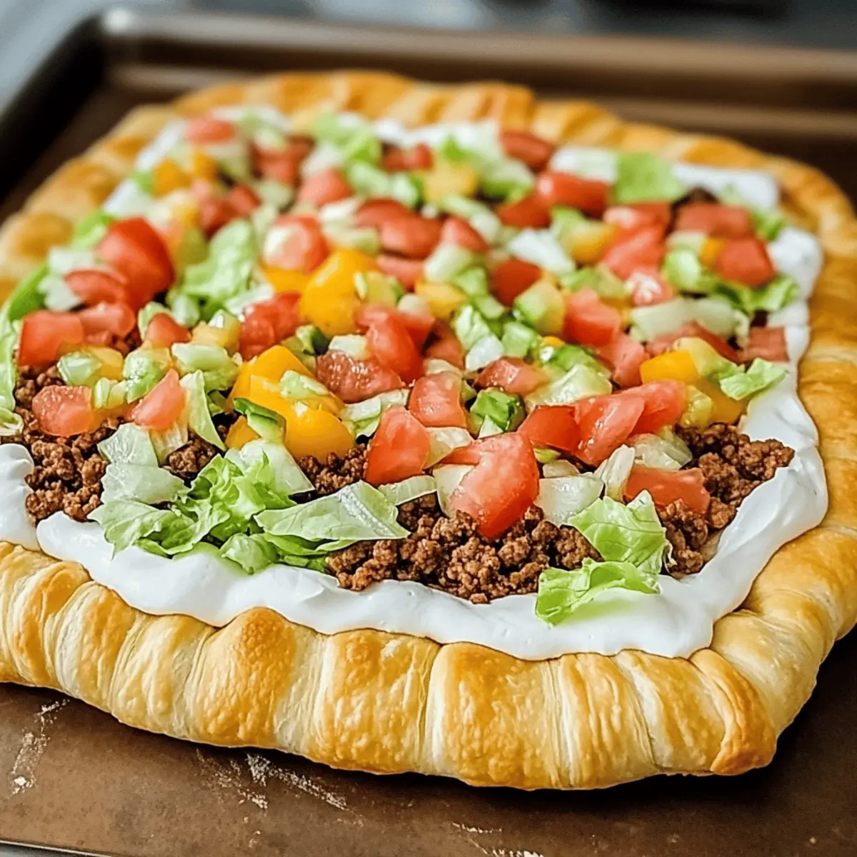 Jump to Recipe Print RecipeAs I pulled out the warm, golden, flaky crust from the oven, an unexpected thrill washed over me—it was time to unveil my Taco Pizza Appetizer, a delightful fusion of two beloved meals rolled into one scrumptious bite. With its crispy crescent roll base, this dish transforms traditional taco flavors into an easy, cheesy experience that’s perfect for gatherings or a cozy family night. The beauty of Taco Pizza lies not just in its deliciousness, but also in its adaptability; you can customize every topping to suit your cravings, making it a go-to for any occasion. Plus, prep time is minimal, so you’ll spend less time in the kitchen and more time enjoying the delightful reactions of your guests. Curious how to bring this culinary sensation to life? Let’s dive into the recipe! Why is Taco Pizza a Game Changer? Flaky Crust: The buttery crescent roll base provides an irresistible crunch that perfectly complements the toppings. Customizable Goodness: Tailor it to your taste! Add jalapeños for heat or black beans for a hearty twist—like with my Steak Elote Tacos. Quick and Easy: With minimal prep and cook time, you can whip this up in a flash, leaving you more time to enjoy the laughter and fun with friends and family. Crowd Favorite: It’s a guaranteed hit! The combination of cheesy taco flavors appeals to everyone at the table, making it ideal for parties or movie nights. Versatile Topping Options: Whether you’re a meat lover or vegetarian, you can mix and match toppings to create the perfect personalized pizza experience. This dish truly stands out as a unique and delicious alternative to standard pizza boredom! Check out my other fun recipes like Cookie Fruit Pizzas for more family-friendly ideas! Taco Pizza Ingredients For the Crust • Crescent Roll Dough – This flaky dough forms the delicious base and can be easily substituted with gluten-free dough if needed. For the Creamy Base • Cream Cheese – Ensure this is softened for easy mixing, lending a lovely richness to the sauce. • Sour Cream – This adds a tangy flavor; Greek yogurt can be used as a healthier alternative. For the Taco Filling • Ground Beef – The primary protein for the filling; ground turkey is a leaner substitute option. • Taco Seasoning – Infuses bold flavors into the meat; feel free to make your own spice blend for a personal touch. For the Toppings • Shredded Cheddar Cheese – Melts beautifully and adds richness; you can swap it for Monterey Jack for a milder flavor. • Shredded Mozzarella Cheese – Provides that delightful gooey texture; for a dairy-free version, try vegan cheese instead. • Diced Tomatoes – Adds a pop of color and freshness; any fresh or canned tomatoes work perfectly. • Shredded Lettuce – Offers a nice crunch; you could use spinach for a nutritious twist. • Optional Toppings (e.g., Jalapeños) – Spice things up to your preference; consider adding olives or avocado for extra flavor. Now you’re ready to gear up for a taco night like no other with this Taco Pizza that’s sure to delight every palate! Step‑by‑Step Instructions for Taco Pizza Step 1: Preheat the Oven Begin by preheating your oven to 375°F (190°C). While it warms up, prepare a cookie sheet by lining it with parchment paper or spraying it with non-stick cooking spray. This ensures your Taco Pizza will easily lift away from the sheet after baking, giving you a perfect presentation. Step 2: Prepare the Crust Unroll the crescent roll dough onto your prepared baking sheet. Press the seams together to create a uniform layer, ensuring there are no gaps. Bake in your preheated oven for about 10 minutes or until the crust is golden brown and fragrant. Once done, remove it and let it cool completely. Step 3: Make the Creamy Base In a mixing bowl, combine the softened cream cheese and sour cream. Use a hand mixer or a spatula to blend the mixture until it’s smooth and creamy, creating a delightful base for your Taco Pizza. Once you achieve a consistent texture, spread this creamy mixture evenly over the cooled crust. Refrigerate while preparing the taco filling. Step 4: Cook the Taco Meat Heat a skillet over medium heat, adding the ground beef or turkey for about 5-7 minutes. As the meat browns, break it apart with a spatula to ensure even cooking. Once the meat is browned and cooked through, drain any excess fat, then sprinkle in taco seasoning. Stir and cook for an additional 3-5 minutes, allowing the spices to infuse the meat. Step 5: Assemble the Taco Pizza Remove the creamy base from the fridge and spread the cooked taco meat evenly over the crust. Next, layer on the shredded cheeses—cheddar and mozzarella—making sure to cover the meat entirely for that melty goodness. Top with diced tomatoes and shredded lettuce, sprinkling these ingredients generously to ensure every bite is bursting with flavor. Step 6: Slice and Serve Using a sharp pizza cutter, slice your Taco Pizza into squares or triangles, depending on your serving preference. Serve immediately to enjoy the delightful combination of flavors and textures while everything is fresh and warm. This vibrant dish is perfect for parties, family dinners, or a fun taco night! Taco Pizza: Fun Variations Await! Feel free to let your creativity run wild with these tantalizing twists on the Taco Pizza! Vegetarian Delight: Swap ground beef for black beans or lentils to create a satisfying plant-based version. It’s hearty and packed with flavor! Spicy Kick: Use pepper jack cheese instead of cheddar for an exciting heat that’ll spice up your pizza night. You’ll feel the warmth in every bite! Creamy Dream: Replace sour cream with avocado cream for a richer, creamier texture. Simply blend ripe avocados with lime juice and seasonings for an unexpected delight. Savory Sweet: Add caramelized onions or roasted corn to the toppings for a hint of sweetness that complements the savory elements perfectly. Crunchy Texture:
