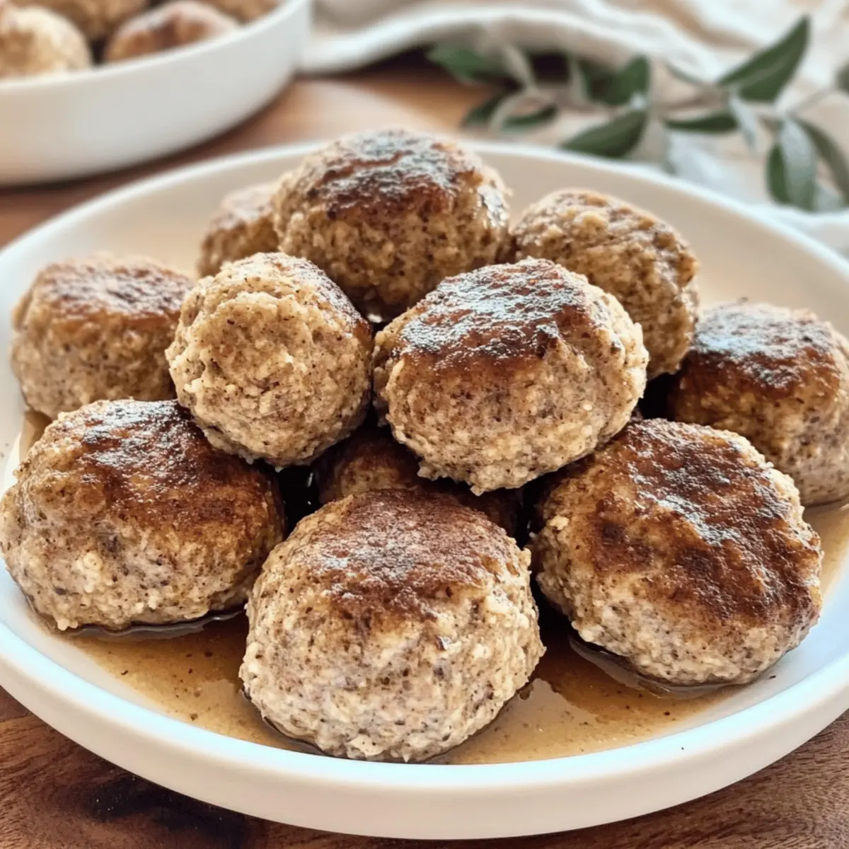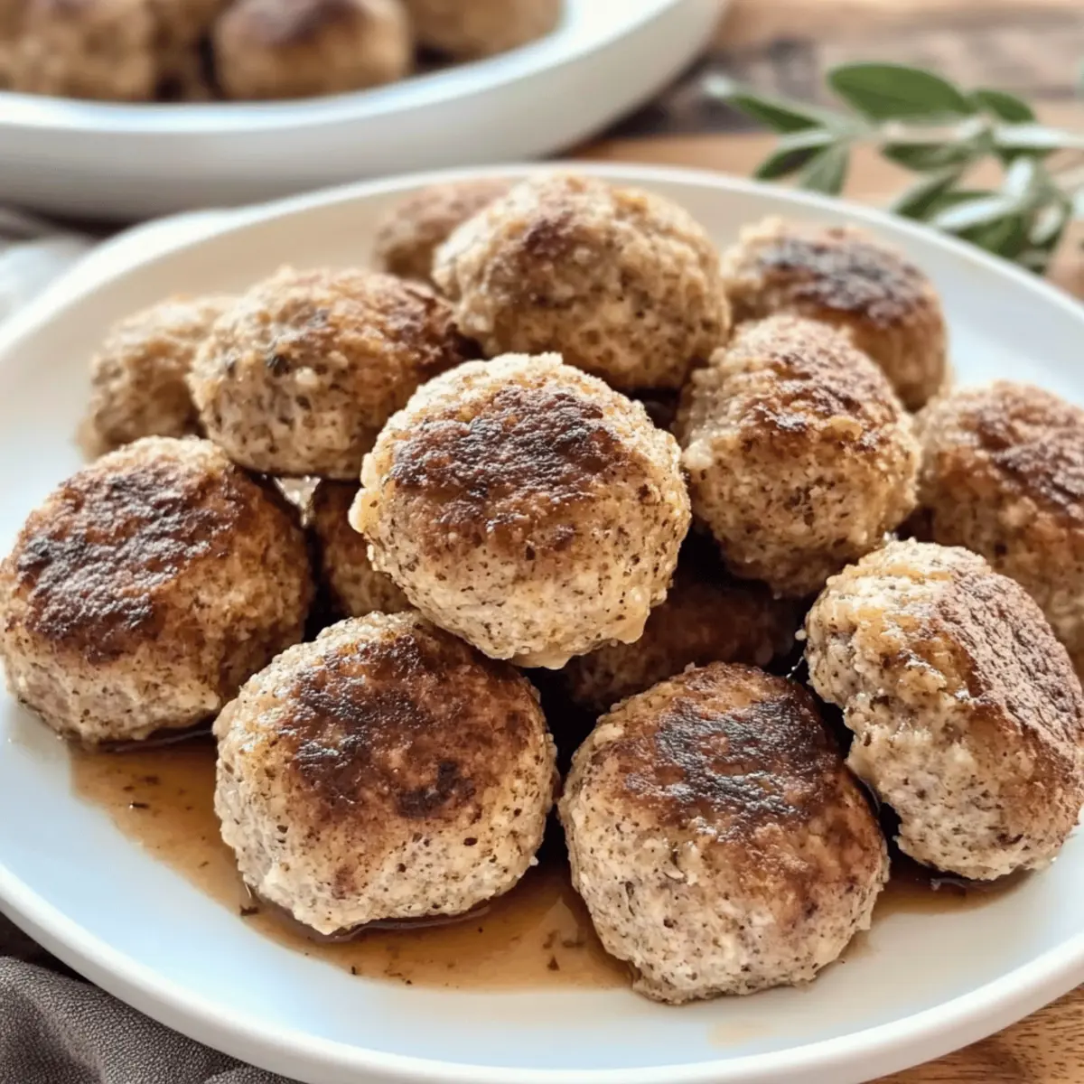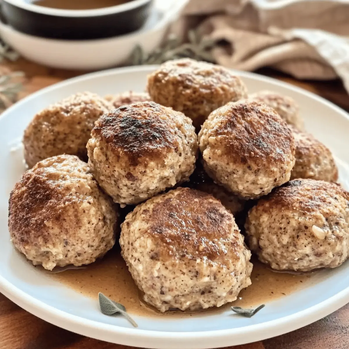 Jump to Recipe Print RecipeThe aroma of Thanksgiving wafted through my kitchen as I prepared a batch of Turkey and Stuffing Meatballs with Gravy. It felt like a delightful time capsule, transporting me right back to those cozy family gatherings. These scrumptious meatballs combine the wholesome flavors of ground turkey with the comforting essence of stuffing, making them a crowd-pleaser for any busy weeknight dinner. Not only are they quick to prepare, but they also provide a hearty yet lighter alternative to traditional meatballs, paired with a rich homemade gravy that takes just minutes to whip up. Whether you’re craving that festive flavor or simply looking to elevate your dinner routine, these meatballs are bound to become a favorite in your home. Curious how to bring the taste of Thanksgiving to your table all year round? Let’s get cooking! Why Are Turkey and Stuffing Meatballs Amazing? Flavorful Fusion: These meatballs blend ground turkey with savory stuffing, delivering that holiday taste anytime you crave it. Quick and Easy: Perfect for busy weeknights, they require minimal prep and cook time. Hearty and Wholesome: With 31g of protein per serving, they’re a satisfying option without the heaviness of traditional meatballs. Versatile Pairing: Enjoy them with cranberry sauce, or serve over mashed potatoes for a comforting meal that pleases everyone. Make Ahead: Cooked meatballs store well for 5 days and freeze beautifully, ensuring you always have a delicious dinner ready. Elevate your family dinners with these delightful Turkey and Stuffing Meatballs with Gravy that are sure to impress! Turkey and Stuffing Meatballs With Gravy Ingredients For the Meatballs • Ground Turkey – Lean and hearty, a healthier alternative to beef that still packs a punch. • Eggs – Essential for binding the mixture while keeping the meatballs moist. • Granulated Garlic – Adds a deep, savory flavor; fresh garlic is a great substitute for a stronger kick. • Salt – Enhances all the flavors; opt for kosher salt and adjust according to taste. • Black Pepper – Freshly ground elevates taste; try adding more for a spicy kick. • Onion – Grated or minced, it brings moisture and sweetness; shallots are a mild alternative. • Stuffing Mix – The secret to those classic Thanksgiving flavors; swap with homemade herb bread cubes for customization. For the Cooking • Butter – Used for searing the meatballs and making the gravy; olive oil is a lighter option. • Olive Oil – Prevents sticking and adds richness; any cooking oil works too. For the Gravy • Low Sodium Chicken Broth – The flavorful base for the gravy; vegetable broth can be used for a lighter dish. • Dried Thyme – This herb enhances flavors, but fresh thyme can bring in a brighter taste. • Flour – A thickening agent for the gravy; gluten-free flour works for a gluten-free variant. Each ingredient plays a vital role in creating delicious Turkey and Stuffing Meatballs with Gravy that are perfect for any occasion! Happy cooking! Step‑by‑Step Instructions for Turkey and Stuffing Meatballs With Gravy Step 1: Preheat Your Oven Start by preheating your oven to 350°F (175°C). This ensures that your Turkey and Stuffing Meatballs cook evenly and completely. While the oven heats up, gather all your ingredients and cooking equipment, so you’re ready for each step. Step 2: Mix the Meatball Ingredients In a large mixing bowl, crumble the ground turkey and then add the eggs, seasoning ingredients like salt, pepper, and granulated garlic, along with the finely minced onion and stuffing mix. Mix everything well until fully combined, ensuring each ingredient is evenly distributed for flavorful meatballs. Step 3: Form the Meatballs Using your hands or an ice cream scoop, form uniform meatballs from the mixture, aiming for about 1 to 1.5 inches in diameter. Uniformity will help ensure that the Turkey and Stuffing Meatballs cook evenly and have the same delightful texture throughout. Place them on a baking sheet as you work. Step 4: Sear the Meatballs Heat a large skillet over medium-high heat and add a tablespoon of butter along with a drizzle of olive oil. Once the butter is foamy, sear the meatballs in batches, allowing them to brown for 1 to 2 minutes on each side until they are golden brown. This step adds delicious flavor and texture to the meatballs. Step 5: Cook with Broth and Thyme After searing, return all the meatballs to the skillet and pour in the low sodium chicken broth. Add dried thyme and any remaining butter, gently stirring to combine. Let this simmer for about 2-3 minutes, allowing the meatballs to absorb some of the broth flavor before moving to the next step. Step 6: Bake to Perfection Transfer the skillet to your preheated oven and bake the meatballs for approximately 20 minutes, or until the internal temperature reaches 165°F (74°C). This ensures that your Turkey and Stuffing Meatballs are fully cooked while remaining juicy and tender. Step 7: Prepare the Gravy Once the meatballs are done baking, remove them from the skillet and keep them warm. To make the gravy, use the cooking liquid left in the skillet. Whisk in a mix of butter and flour over medium heat, slowly incorporating the cooking liquid until a smooth gravy forms. Step 8: Thicken and Serve Bring the mixture to a boil, then reduce the heat and let it simmer until thickened, about 5-7 minutes. If you prefer a smoother gravy, strain it before serving. Pour the rich gravy over your Turkey and Stuffing Meatballs and enjoy the delicious, comforting meal! How to Store and Freeze Turkey and Stuffing Meatballs With Gravy Fridge: Store cooked Turkey and Stuffing Meatballs in an airtight container for up to 5 days. Ensure they cool completely before refrigeration to maintain moisture. Freezer: Freeze meatballs individually on a baking sheet before transferring to an airtight container or freezer bag. They can last for up to 3 months, keeping the flavo