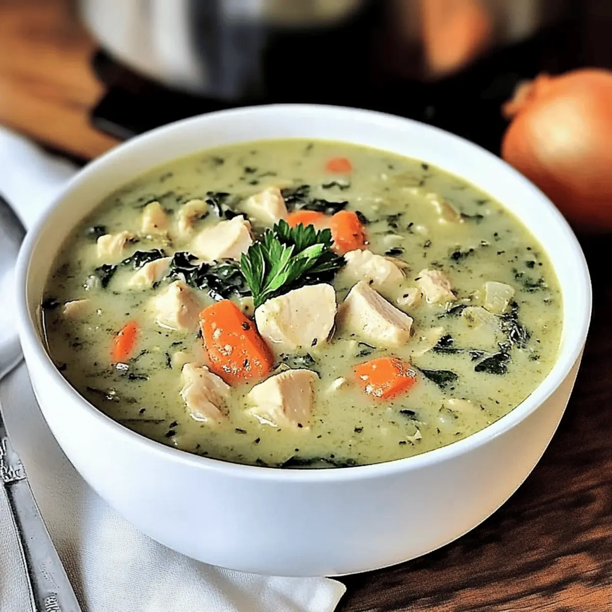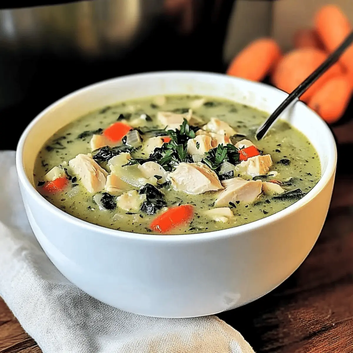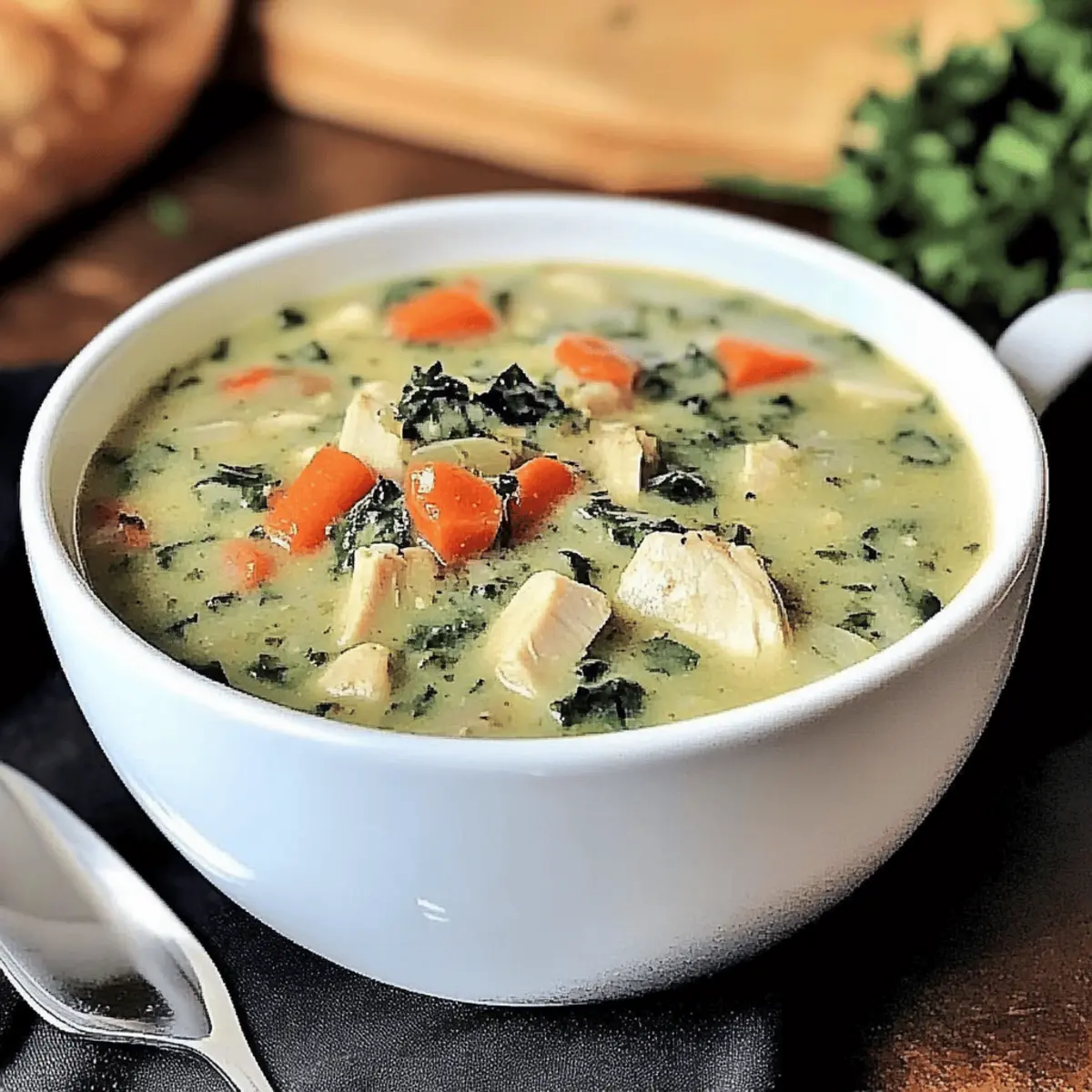 Jump to Recipe Print RecipeAs autumn wraps its arms around us, I find myself dreaming of warm, comforting meals that invite us to gather around the table. Enter my Creamy Turkey Soup with Spinach, a dish that elevates those leftovers into something truly special. It’s an easy way to transform forgotten turkey into a delightful experience rather than simply another sandwich or noodle soup. With its hearty blend of flavors and nutritious punch from fresh spinach, this recipe checks all the boxes for cozy cooking. Plus, it’s incredibly quick to whip up—perfect for those busy weeknights when you still crave a home-cooked meal. So why not give your holiday leftovers a second life? Ready to dive into this creamy comfort? Let’s get started! Why is this Turkey Soup special? Comforting Flavors: This Creamy Turkey Soup with Spinach combines the rich, savory notes of tender turkey with fresh spinach, creating a dish that’s both satisfying and nourishing. Quick and Easy: Ideal for busy weeknights, this recipe allows you to whip up a hearty meal in under 30 minutes, perfect for those hectic evenings when you just want comfort food. Customizable Goodness: With the flexibility to incorporate your favorite vegetables or grains, like adding quinoa or even green beans, this soup remains versatile and exciting. Utilizes Leftovers: A fantastic way to repurpose leftover turkey, transforming it into a dish that steals the spotlight at any dinner table. Embrace the flavors just like in my cozy Tortellini Soup Cozy or the hearty Chicken Spinach Casserole. Crowd-Pleasing Appeal: Its creamy texture and vibrant colors make it appealing for everyone, ensuring that your family or guests will savor every last spoonful. Turkey Soup with Spinach Ingredients For the Soup Base Turkey – Use leftover roasted or cooked turkey for the best flavor and convenience. Carrots – These add a hint of sweetness; substitute with parsnips if desired. Celery – Essential for the classic mirepoix base, offering both aroma and crunch. Onion – Provides robust depth; shallots can be used for a milder flavor. Garlic – Fresh cloves infuse the soup with a delightful, aromatic kick. For the Creamy Texture Spinach – Packed with nutrients; kale or Swiss chard can work as tasty alternatives. Cream or Milk – Achieves that luscious creaminess; opt for half-and-half for a lighter option. For the Flavor Boost Broth (Chicken or Vegetable) – Use low-sodium broth to control the salt content in your soup. Herbs (Thyme, Parsley) – Fresh herbs enhance flavor; dried herbs are a suitable backup. Pepper & Salt – Adjust these for seasoning based on your broth’s saltiness. This Turkey Soup with Spinach is a delightful way to enjoy leftovers while staying cozy and satisfied! Step‑by‑Step Instructions for Creamy Turkey Soup with Spinach Step 1: Sauté the Vegetables In a large pot, heat a splash of olive oil over medium heat. Add diced carrots, celery, and onion, along with minced garlic. Sauté these aromatics for about 8-10 minutes, stirring occasionally until the vegetables are tender and fragrant. The vibrant colors should glisten invitingly as they cook, creating a warm base for your Turkey Soup with Spinach. Step 2: Add the Turkey Once the vegetables are tender, stir in the shredded leftover turkey. Cook for an additional 2-3 minutes, allowing the turkey to warm through and absorb the flavors of the sautéed veggies. You want to see a light steaming rising from the pot as you mix everything together, melding the comforting essence of the soup. Step 3: Pour in the Broth Now, gradually pour in your low-sodium broth, ensuring all the ingredients are submerged. Increase the heat slightly to bring the mixture to a gentle simmer. This should take about 5 minutes. You’ll know it’s ready when tiny bubbles begin to form at the surface, signaling that your Turkey Soup with Spinach is developing its hearty flavor. Step 4: Stir in Spinach and Cream Gently fold in the fresh spinach and cream, allowing them to become part of the soup’s lush texture. Simmer for another 5-8 minutes or until the spinach is beautifully wilted and vibrant green. The soup should look thick and creamy, with a rich color that invites you to spoon it into a bowl. Step 5: Adjust Seasonings and Serve Taste your soup and make any final adjustments with salt and pepper. If desired, sprinkle in fresh or dried herbs for an extra flavor boost. Once everything is well-seasoned, serve your delightful Turkey Soup with Spinach hot, garnishing with parsley for a pop of color and freshness to brighten each bowl. Variations & Substitutions for Turkey Soup with Spinach Feel free to personalize your Turkey Soup with Spinach; it’s all about making it your own! Dairy-Free: Use coconut milk instead of cream for a creamy texture without dairy. This lends a unique flavor twist that enhances the overall warmth. Protein Boost: Substitute turkey with shredded chicken or even diced tofu for a different protein source. Both work wonderfully while keeping the soup hearty. Extra Veggies: Toss in vibrant green beans or bell peppers for a delightful crunch and added nutrition. The more color, the happier your meal will be! Spicy Kick: Mix in red pepper flakes or a splash of hot sauce for a warm kick. Spice levels can be adjusted based on personal preference to keep things exciting. Hearty Grains: Add in cooked quinoa or barley for a fulfilling texture and added fiber. These grains soak up the soup’s flavors beautifully, turning it into a cozy, wholesome meal. Herb Magic: Experiment with fresh dill or basil instead of thyme for a fresh, aromatic flavor. These herbs offer a lovely twist that brings a new dimension to the classic dish. Vegetable Variety: Incorporate hearty vegetables like potatoes or sweet potatoes for a hearty, filling addition. Their natural sweetness complements the savory broth perfectly. Slow Cooker Option: For a hands-off approach, simmer all ingredients in a slo