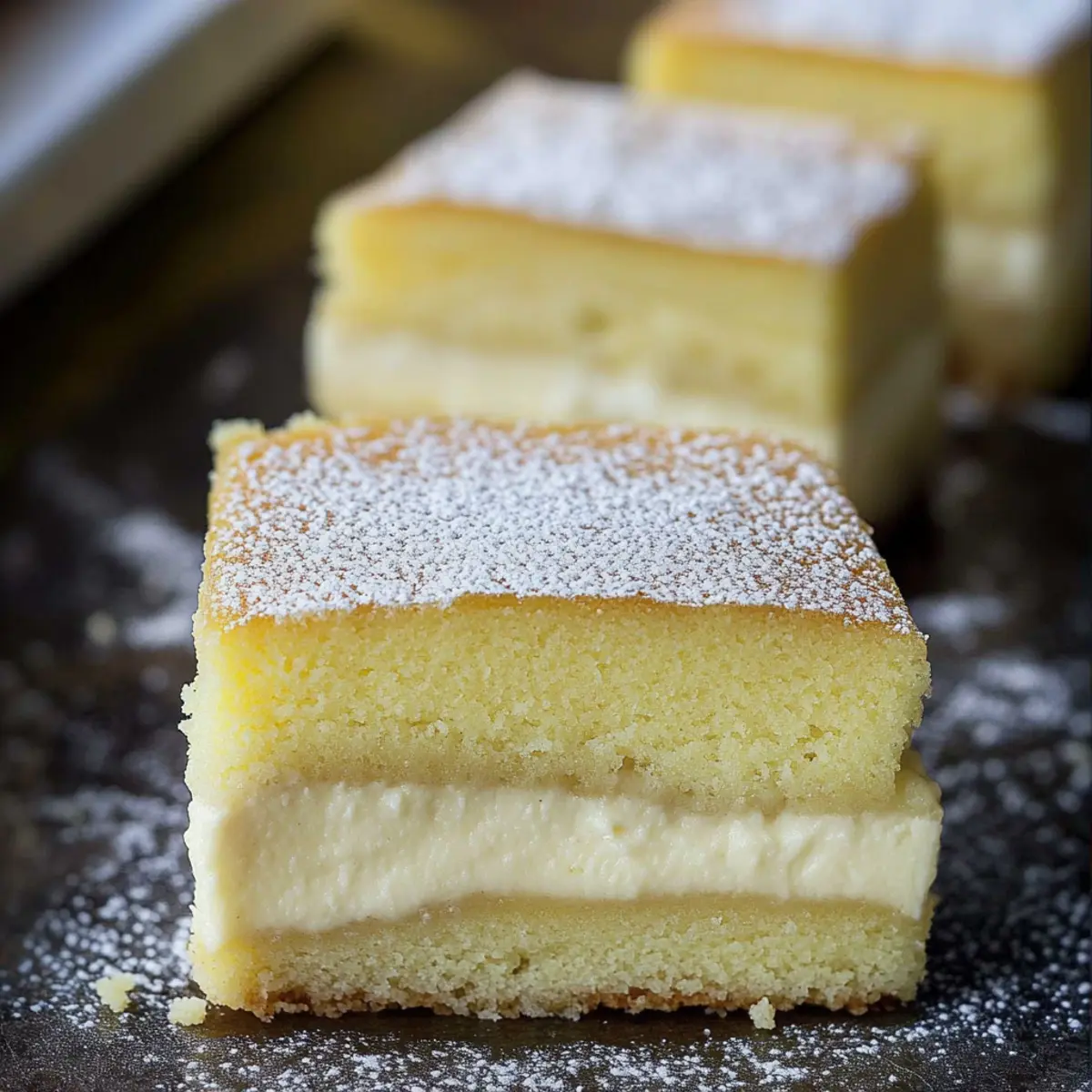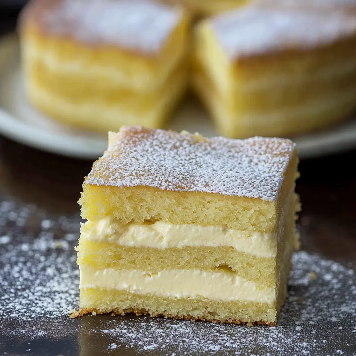 Jump to Recipe Print RecipeAs I stood in my kitchen, the aroma of vanilla wafted through the air, instantly transporting me back to my childhood. Today, I’m sharing a delightful recipe for Vanilla Magic Custard Cake—a three-layered wonder that magically creates a light, fluffy top, a luscious custard center, and a dense cake base, all from one simple batter. This easy dessert is perfect for impressing guests at a gathering or treating yourself after a long day. Not only is it a stunning centerpiece for any table, but it also requires minimal prep, freeing you up to focus on what truly matters: enjoying the moment. Now, are you ready to indulge in this sweet magical experience? Let’s bake! Why is Vanilla Magic Custard Cake Special? Irresistible Layers: The Vanilla Magic Custard Cake boasts a unique three-layer structure that surprises and delights with every forkful. Easy to Make: With simple ingredients and straightforward steps, this recipe is perfect for bakers of all skill levels, ensuring anyone can impress family and friends. Versatile Flavor: Feel free to switch things up by adding spices or making a delicious chocolate version—it’s a canvas for your creativity! Perfect for Any Occasion: Whether it’s a family dinner or a festive gathering, this cake is sure to be the star of the dessert table. Make Ahead: Prep it a day in advance to save time, letting you relax and savor the sweet moments. Experience the joy of homemade magic, just like with other delightful treats such as Strawberry Spoon Cake or Honey Cheesecake Salted. Vanilla Magic Custard Cake Ingredients • To create your own magical experience in the kitchen, here’s what you’ll need: For the Batter Eggs – Essential for structure and richness; they help achieve that beautiful three-layer effect. Granulated Sugar (1 cup) – Sweetens the cake and helps create a light texture; feel free to use coconut or brown sugar for a different sweetness. Powdered Sugar (1/2 cup) – Provides a meringue texture on top, making it smooth; be sure to sift before adding for the best results. Vanilla Extract (1-2 teaspoons) – The backbone of this recipe; for a more potent vanilla flavor, consider using vanilla bean paste. Milk (2 cups) – Acts as the liquid base, lending moisture and aiding in that custard effect—non-dairy? Almond, coconut, or soy milk work beautifully as substitutes! All-Purpose Flour (1 cup) – Provides crucial structure; sifting is recommended for optimal texture, and gluten-free flour can be used for those with dietary needs. Unsalted Butter (1/2 cup) – Brings richness and flavor; remember to use it softened, not melted. Margarine can substitute but may alter the taste. Enjoy whipping up the delightful layers of your Vanilla Magic Custard Cake—it’s truly a dessert that brings comfort and joy into your home! Step‑by‑Step Instructions for Vanilla Magic Custard Cake Step 1: Prepare the Batter In a large mixing bowl, beat 4 egg yolks with 1 cup of granulated sugar until the mixture turns pale and creamy, about 3-5 minutes. Add in 1-2 teaspoons of vanilla extract and 1/2 cup of softened unsalted butter, mixing well. Gradually pour in 2 cups of milk and 1 cup of sifted all-purpose flour, whisking until the batter is smooth and well combined. Step 2: Whip Egg Whites In a separate clean bowl, whip 4 egg whites until soft peaks form, which should take about 2-3 minutes with an electric mixer. Carefully fold the whipped egg whites into the batter using a spatula, making sure not to overmix—it’s okay if small lumps of egg whites remain. This process helps create the magical layers in your Vanilla Magic Custard Cake. Step 3: Bake the Cake Pour the prepared batter into a greased 9-inch square baking dish, spreading it evenly. Place the dish in a preheated oven at 325°F (160°C) and bake for 40-45 minutes. Keep an eye on the cake; it should turn a lovely golden brown on top, while a slight jiggle remains in the center, indicating the creamy custard layer beneath. Step 4: Cool and Slice Once baked, remove the Vanilla Magic Custard Cake from the oven and allow it to cool in the baking dish for at least 30 minutes. When cool enough to handle, gently slice the cake into squares. This cake can be served warm or chilled, depending on your preference, bringing out the delightful layers beautifully. What to Serve with Vanilla Magic Custard Cake Elevate your dessert experience by pairing it with delightful accompaniments that enhance its creamy magic. Fresh Berries: The tartness of strawberries or raspberries complements the sweetness of the custard cake, adding a vibrant burst of flavor. Whipped Cream: Light and fluffy whipped cream creates a luxurious addition, enhancing the cake’s layers with creamy goodness. Chocolate Sauce: A drizzle of rich chocolate sauce introduces a decadent twist, perfect for chocolate lovers looking to elevate their dessert game. Coconut Ice Cream: This tropical treat adds a creamy, cold contrast that balances the warmth of the Vanilla Magic Custard Cake beautifully. Caramel Sauce: Drizzling homemade or store-bought caramel sauce brings an enticing sweetness that pairs harmoniously with the dessert’s vanilla tones. Nutty Crumble: A crunchy topping of almonds or pecans provides a delightful texture contrast, making each bite of cake even more delightful. These pairings transform your Vanilla Magic Custard Cake into a multi-dimensional dessert experience that will have everyone coming back for seconds! Make Ahead Options These Vanilla Magic Custard Cakes are a dream for busy home cooks looking to save time! You can prepare the batter up to 24 hours in advance, allowing you to simply mix the ingredients and refrigerate the uncooked batter until you’re ready to bake. If you want to take it another step, you can bake the cake ahead of time, then let it cool completely, cover it tightly, and refrigerate for an additional 2-3 days. When you’re ready to serve, just allow it to rea