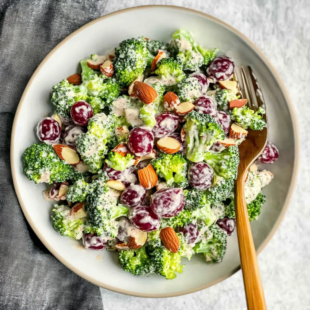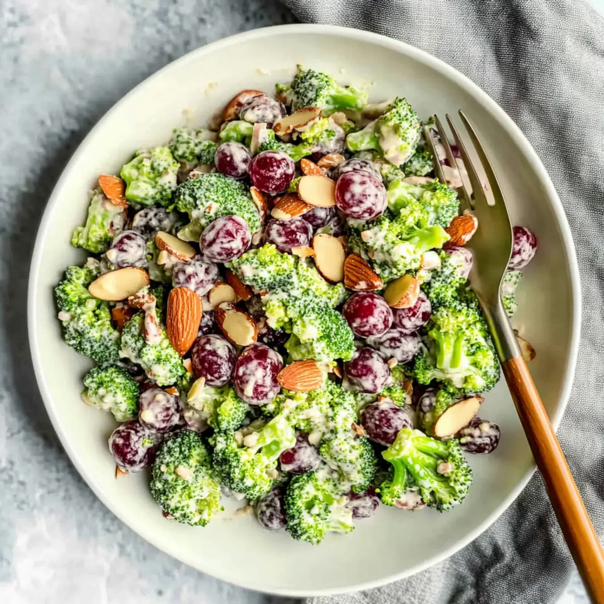Jump to Recipe Print RecipeAs I tossed the vibrant colors of fresh produce together, the delightful crunch of raw broccoli caught my attention—reminding me of family gatherings and those beloved potlucks. Today, I’m excited to share my take on The Best Vegan Broccoli Salad. This recipe, featuring a creamy cashew dressing, offers a quick 15-minute prep that transforms healthy veggies into a crowd-pleasing side dish. It’s guilt-free but full of flavor, leaving you feeling energized rather than weighed down. With the added sweetness of grapes and a handful of crunchy almonds, it’s a perfect addition to any meal or gathering. Whether you’re vegan, gluten-free, or just looking for a light, healthy bite, this salad checks all the boxes. Are you ready to discover how to make this refreshing dish your new go-to? Why is this Vegan Broccoli Salad a Must-Try? Quick and Easy: This salad comes together in just 15 minutes, making it an ideal choice for busy weeknights or last-minute potluck invitations. Guilt-Free Comfort: With a creamy cashew dressing made from wholesome ingredients, you can indulge without worry—perfect for anyone looking to eat healthier. Crowd-Pleasing Delight: The vibrant mix of crunchy broccoli, sweet grapes, and tangy cranberries guarantees you’ll impress your guests at any gathering. Versatility at Its Finest: Feel free to swap in your favorite nuts or dried fruits, like adding apples for a fun twist or using sunflower seeds for a nut-free version. Flavorful and Nutritious: Packed with essential vitamins and a good source of fiber, this salad not only tastes good but is also a fantastic addition to your healthy meal plan. Elevate your gatherings with this Vegan Broccoli Salad that stands out among classics, alongside other flavorful options like Radish Salad Roasted or Cucumber Shrimp Salad. Vegan Broccoli Salad Ingredients Here’s everything you need to create this delicious Vegan Broccoli Salad! For the Salad Broccoli – a crisp base that packs a nutritious punch; use it raw for maximum crunch. Red Onion – adds a zesty kick and crunch; can be swapped with green onions for a milder taste. Dried Cranberries – offer a touch of sweetness; substitute with raisins for a different flavor. Red Grapes – for bursts of sweetness; feel free to swap with apple chunks or sliced strawberries as a variation. Almonds – bring in additional crunch; pecans or walnuts can be used for a nutty twist. For the Creamy Dressing Raw Cashews – these are the secret to the creamy texture; soak them in water for 2-4 hours for easy blending! Maple Syrup – provides natural sweetness in the dressing; agave syrup is a suitable substitute. Apple Cider Vinegar – delivers a tartness that balances the sweetness; lemon juice can also work here. Garlic – offers savory depth; adjust to taste; roasted garlic adds a sweeter profile if preferred. Salt & Pepper – key seasonings to elevate the flavor of your dressing. Get ready to whip up this Vegan Broccoli Salad that will surely impress anyone looking for a bright, healthy dish! Step‑by‑Step Instructions for Vegan Broccoli Salad Step 1: Prepare the Creamy Cashew Dressing Start by soaking 1 cup of raw cashews in water for 2–4 hours, allowing them to soften. Once soaked, drain and rinse the cashews, then blend them in a high-speed blender with 2 tablespoons of maple syrup, 2 tablespoons of apple cider vinegar, 1 clove of garlic (or more to taste), and a pinch of salt and pepper. Blend until the mixture is creamy and smooth, resembling a thick dressing. Step 2: Chop the Fresh Vegetables While the cashews are soaking, wash and chop 3 cups of fresh broccoli into bite-sized florets. Transfer the broccoli into a large mixing bowl. Next, thinly slice 1/2 of a red onion and add it to the bowl for a zesty kick. The vibrant green of the broccoli and the purple onion will create a beautiful base for your Vegan Broccoli Salad. Step 3: Add Sweet & Crunchy Ingredients In the same bowl, add 1/2 cup of dried cranberries for sweetness, along with 1 cup of halved red grapes for added freshness. Finally, incorporate 1/2 cup of chopped almonds to provide a delightful crunch. Gently toss the vegetables and fruits together to ensure a uniform distribution of flavors before coating them with the creamy cashew dressing. Step 4: Combine with the Dressing Pour the creamy cashew dressing over the salad mix, making sure all the ingredients are well-coated. Use tongs or two large spoons to gently toss the Vegan Broccoli Salad together, ensuring each piece is enveloped in the luscious dressing. This step will enhance the flavors and create a satisfying, creamy texture throughout the salad. Step 5: Chill to Enhance Flavors Once mixed, cover the bowl with plastic wrap or a lid and place the Vegan Broccoli Salad in the refrigerator. Allow it to chill for at least 30 minutes, which helps to meld the flavors together for a more delicious taste experience. The chilling time also allows the broccoli to absorb the dressing, enhancing its flavor. Step 6: Serve and Enjoy After chilling, give the salad a final toss before serving. You can either portion it out into individual bowls or serve it family-style in a large dish. This colorful and nutritious Vegan Broccoli Salad is now ready to elevate your next meal, whether it’s a weeknight dinner or a potluck gathering. Storage Tips for Vegan Broccoli Salad Fridge: Store the Vegan Broccoli Salad in an airtight container for up to 5 days. This helps preserve its freshness and flavors for later enjoyment. Dressing Storage: If you prefer making the dressing ahead, it can be kept in the fridge for up to 1 week. Just give it a good stir or shake before using, as it may thicken. Freezer: For optimal taste and texture, avoid freezing this salad. The vegetables may become mushy upon thawing. Reheating: If served cold, simply enjoy it straight from the fridge; there’s no need to reheat this delicious salad! Make Ahead Options This