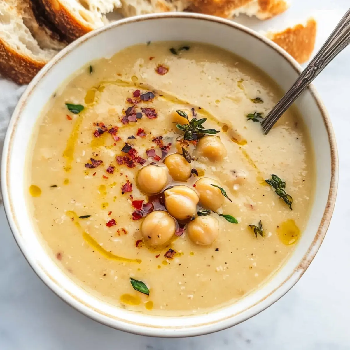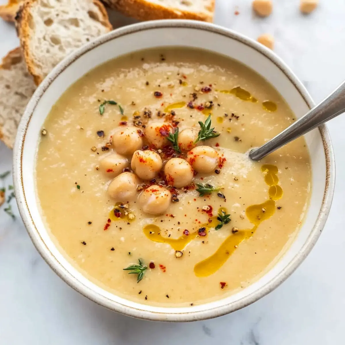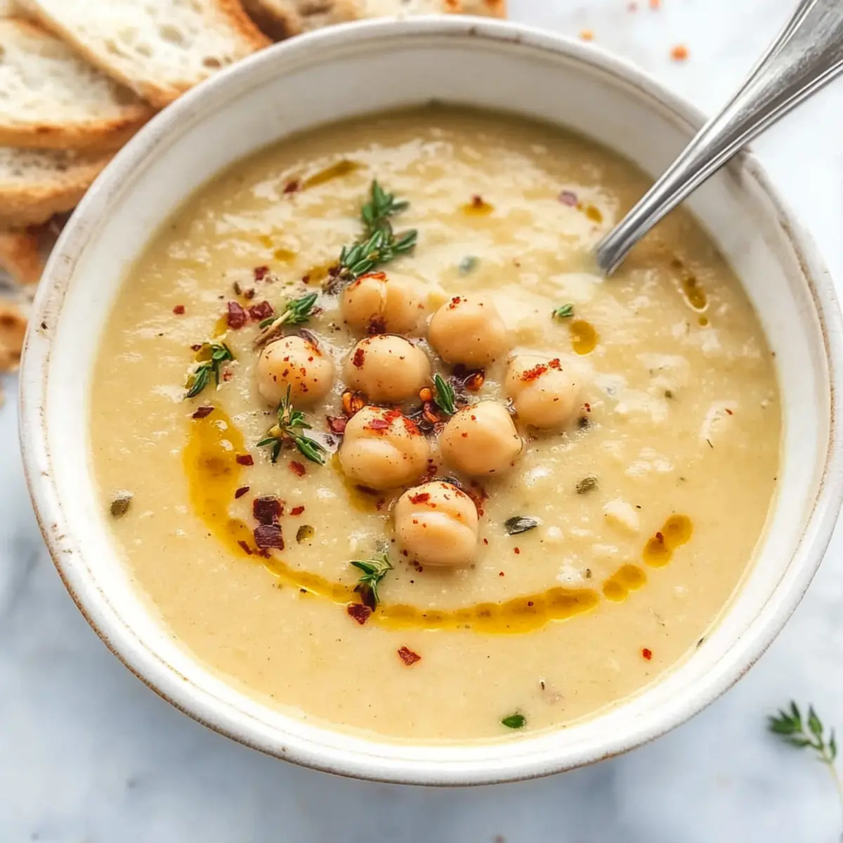 Jump to Recipe Print RecipeAs I stood by the stove, the rich aroma of sautéing garlic enveloped my kitchen like a cozy hug on a chilly evening. It’s amazing how just a few humble ingredients can transform into something so delightful, isn’t it? This Creamy Vegan Garlic Chickpea Soup is my go-to for those busy weeknights when I crave comfort without spending hours over the stove. Ready in under 30 minutes, it’s not just quick but also budget-friendly, making it a perfect choice for health-conscious food lovers. Packed with high-protein chickpeas and a creamy texture, it’s a dish that nourishes both body and soul. Curiosity piqued? Let’s dive into the simple steps that lead to this heartwarming bowl of goodness! Why Is This Soup a Must-Try? Quick and Easy: This soup comes together in under 30 minutes, making it a lifesaver for busy evenings. Creamy Delight: The luscious texture from blended chickpeas gives you a rich experience without any dairy. Nutritious Powerhouse: With high protein and fiber from chickpeas, it’s both satisfying and good for you—perfect for health-conscious eaters! Versatile Flavors: Feel free to customize by adding spinach or roasted red peppers for extra depth. Crowd-Pleasing Comfort: It’s an instant crowd favorite—serve it with Cheesy Garlic Breadsticks to make it a complete meal! Vegan Garlic Chickpea Soup Ingredients For the Soup • Olive Oil – Adds richness and helps in sautéing garlic; feel free to use any cooking oil as a substitution. • Garlic (3 large cloves) – Provides a strong aromatic flavor; add more if you love garlic! • Paprika (1 tsp) – Adds subtle warmth and color; consider smoked paprika for a deeper flavor. • Dried Rosemary (1 tsp) – Contributes a fragrant note; fresh rosemary is a delightful substitute. • Dried Thyme (½ tsp) – Enhances the earthiness of the soup; can be omitted or swapped with other dried herbs. • Chili Flakes (¼ tsp) – Introduces a spicy kick; adjust according to your spice preference. • Chickpeas (2 cans, 15 oz each) – The main ingredient, rich in protein; can substitute with other legumes if desired. • Potato (1 large, diced) – Adds creaminess and thickness; sweet potatoes can be used for a sweeter twist. • Low-Sodium Vegetable Broth (2 cups) – Provides the soup base; homemade or store-bought works great. • Salt & Black Pepper – Essential for seasoning; adjust to taste. Optional Add-Ins • Chopped Kale or Spinach – For extra greens and nutrition; they add lovely color and texture. • Roasted Red Peppers – Introduce sweetness and depth of flavor; a perfect way to brighten the dish. Step‑by‑Step Instructions for Vegan Garlic Chickpea Soup Step 1: Blend the Chickpeas Begin your journey to a comforting bowl of Vegan Garlic Chickpea Soup by blending one can of drained chickpeas along with its liquid in a blender. Blend until smooth and creamy, which should take about 1-2 minutes. This will create a luscious base for your soup, enhancing the texture without any dairy. Step 2: Sauté the Garlic In a large pot, heat 2 tablespoons of olive oil over medium heat for about 1 minute. Once hot, add the minced garlic and sauté until fragrant and golden, stirring constantly to prevent burning. This should take around 1 minute, and you’ll smell a warm and inviting aroma wafting through your kitchen. Step 3: Combine Main Ingredients Now it’s time to make the magic happen! Stir in the blended chickpeas, the other can of drained chickpeas, diced potato, paprika, dried rosemary, dried thyme, and chili flakes. Mix everything well to ensure the spices evenly coat the ingredients, and let the vibrant colors come together beautifully. Step 4: Add Vegetable Broth Pour in 2 cups of low-sodium vegetable broth, stirring gently to combine all elements thoroughly in the pot. This will create a hearty mixture perfect for the soup base. At this point, the soup should look vibrant and ready to come to life with flavor. Step 5: Simmer the Soup Cover the pot and increase the heat to medium-high, bringing the soup to a boil. Once boiling, reduce the heat to medium-low and let it simmer for 25 minutes, stirring occasionally. During this time, the potatoes will soften, and the flavors will meld together beautifully, creating a comforting aroma. Step 6: Final Seasoning and Serve After simmering, taste your Vegan Garlic Chickpea Soup and adjust seasoning with salt and fresh black pepper, as desired. Serve hot, garnished with a drizzle of olive oil and a pinch of freshly cracked pepper. The creamy texture is your reward for a meal that not only nourishes but also warms your soul! Vegan Garlic Chickpea Soup Variations Feel free to create your perfect bowl by customizing this vegan garlic chickpea soup to match your tastebuds! Add Greens: Toss in chopped kale or spinach for a nutritional boost and added texture! Smoky Flavor: Swap in smoked paprika in place of regular to deepen the soup’s aroma and richness. Herb Swap: Use fresh basil or Italian seasoning instead of dried thyme for a fresh, summery flavor. Heat It Up: Increase the chili flakes for a spicier kick, adjusting according to your heat preference. Legume Variety: Substitute the chickpeas with black beans or lentils for a different flavor profile and nutrition. Creamy Twist: Blend in coconut milk at the end for extra creaminess and a touch of sweetness. Roasted Red Peppers: Add chopped roasted red peppers for a sweet depth that perfectly complements the garlic. Sweet Potato Variation: Try using diced sweet potatoes instead of regular potatoes for a sweeter, earthier flavor. They bring a lovely comfort to this warm dish! As you explore these variations, you may also find joy in pairing this soup with Cheesy Garlic Breadsticks or even a hearty bowl of Tortellini Soup Cozy for that perfect, satisfying meal! Expert Tips for Vegan Garlic Chickpea Soup Chickpea Consistency: Blend one can of chickpeas for a creamy base and keep the second can 