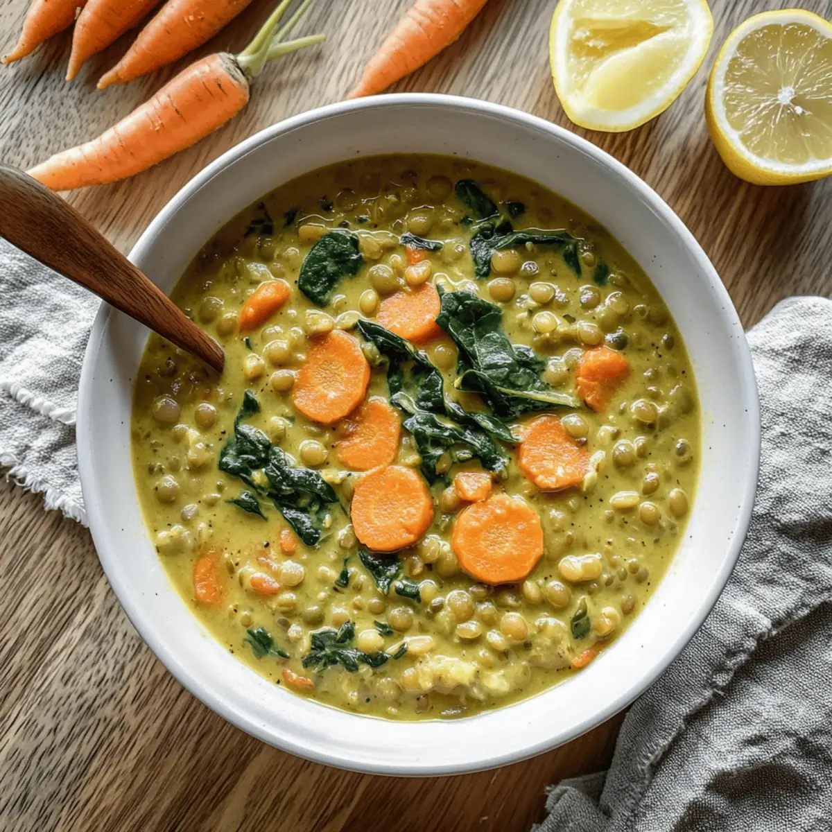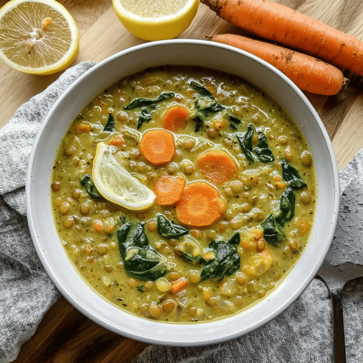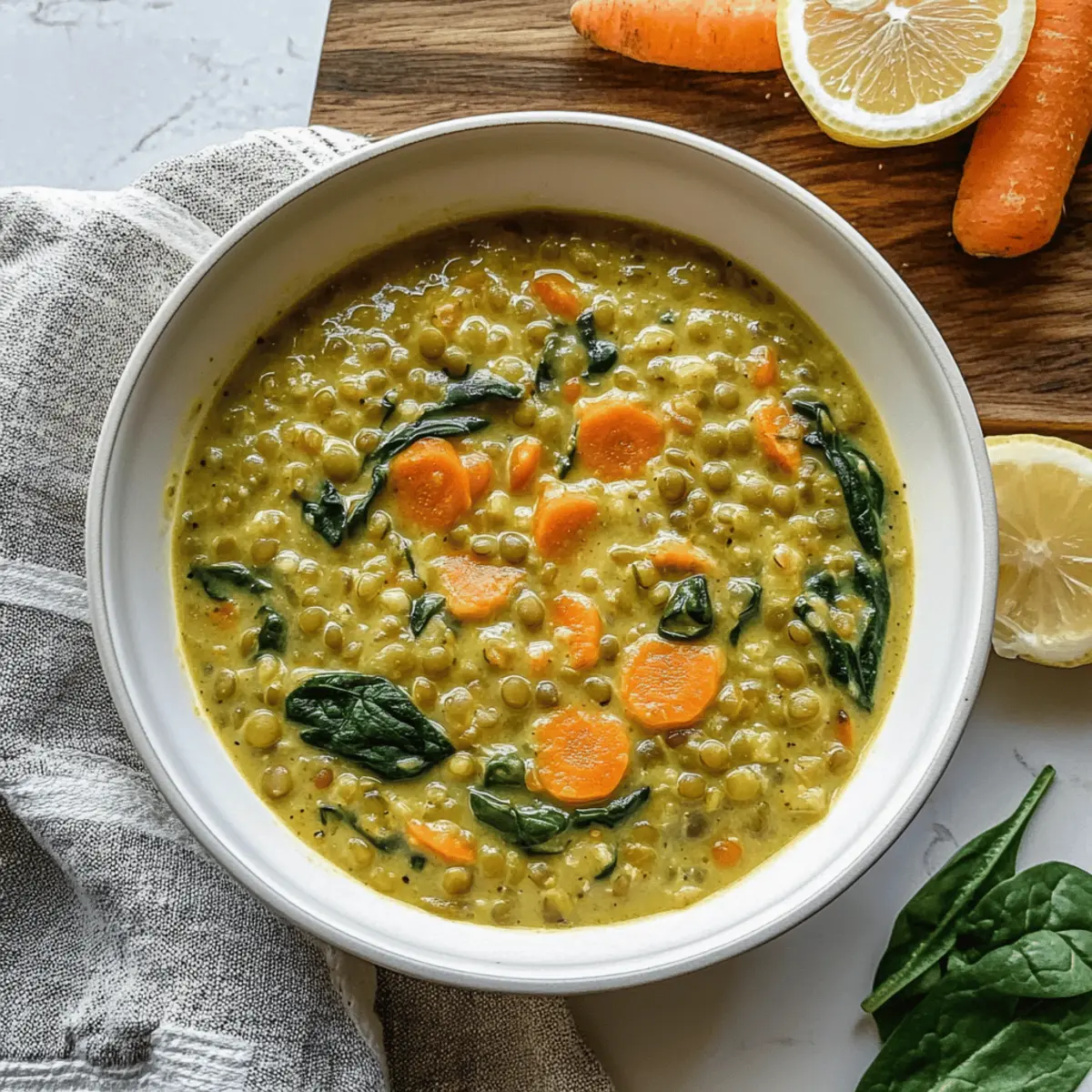 Jump to Recipe Print RecipeThere’s something uniquely soothing about a warm bowl of soup on a chilly day, isn’t there? I used to rely on quick takeout, but ever since I discovered my go-to recipe for Creamy Vegan Lentil Soup with Turmeric, my perspective on comfort food has transformed. Packed with the earthy flavors of ginger and the vibrant spice of turmeric, this nourishing soup not only warms you up but also packs a protein punch, making it perfect for anyone craving a hearty, plant-based meal. Plus, it comes together in a flash—ideal for busy weeknights when you want something nutritious without the hassle. Curious about how to recreate this satisfying dish? Let’s dive in! Why is this soup a must-try? Comforting warmth: Nothing beats a bowl of soup that wraps you in cozy goodness on a cold day. Nutritious & filling: Packed with high-protein lentils and nutrient-rich spinach, this soup fuels your body while delighting your taste buds. Quick to make: Ready in under 30 minutes, it’s perfect for a busy weeknight meal or a lazy weekend brunch. Bursting with flavor: The combination of ginger, turmeric, and fresh lemon juice creates a vibrant taste profile that will have you coming back for seconds. Versatile & customizable: Swap in your favorite veggies or make it spicier with a chili kick—this soup is as flexible as your cravings! Zero oil, pure comfort: Enjoy all the creaminess from cashews without any added oils, making it a guilt-free indulgence. Don’t forget to pair it with some crusty bread or a side salad for an extra satisfying meal! Vegan Lemon Lentil Soup Ingredients Here’s everything you need to create this comforting dish! For the Creamy Base Raw Cashews – Provides a rich creaminess; for a nut-free version, use ½ cup raw unsalted sunflower seeds blended with water. Low-Sodium Veggie Broth – Acts as the flavorful base; choose quality brands for the best taste. For the Aromatics Yellow Onion – Adds sweetness and depth; ensure it’s finely diced for even cooking. Garlic – Enhances flavor with its aromatic goodness; mince for optimal blending. For the Vegetables Carrots – Contributes natural sweetness; slice into ¼ inch pieces for even cooking. Fresh Spinach – Adds nutrients and beautiful color; stir in towards the end to wilt down. For the Lentils Green Lentils – Serves as the main protein source; make sure they are thoroughly rinsed before use. For the Flavor Ground Ginger – Introduces warmth; you can adjust based on your spice preference. Turmeric – Brings a vibrant color and health benefits; use in moderation for a balanced flavor. Garlic Powder – Provides an additional layer of garlic flavor without moisture. Onion Powder – Enhances the overall seasoning profile. For the Sweetness and Brightness Maple Syrup – Adds a touch of sweetness to balance out the flavors; can be substituted with agave syrup. Fresh Lemon Juice – Brightens the soup with acidity; adjust to taste as flavors develop while cooking. This Vegan Lemon Lentil Soup with Turmeric is not only delicious but also a wholesome choice that will have you feeling good inside and out! Step‑by‑Step Instructions for Vegan Lemon Lentil Soup with Turmeric Step 1: Prepare Cashew Cream Begin by soaking ½ cup of raw cashews in water for at least 4 hours or overnight for optimal creaminess. When ready, drain and rinse the cashews, then blend them with 1 cup of fresh water in a high-speed blender until smooth and creamy. This will serve as the luscious base for your Vegan Lemon Lentil Soup. Step 2: Sauté Aromatics In a large pot over medium heat, pour in ½ cup of low-sodium veggie broth. Once hot, add 1 finely diced yellow onion. Sauté for about 5 minutes until the onion is soft and translucent, releasing its sweet aroma. This step sets the flavorful foundation for your soup, enticing your senses with its savory notes. Step 3: Add Vegetables Next, stir in 2 sliced carrots and 2 minced garlic cloves into the pot with the onions. Cook for another 3-5 minutes until the carrots are semi-tender, stirring occasionally. The vibrant colors and fragrant smell will signal that you’re on the right track toward crafting your comforting Vegan Lemon Lentil Soup. Step 4: Combine Spices Sprinkle in 1 teaspoon of garlic powder, 1 teaspoon of onion powder, 1 teaspoon of ground ginger, and ½ teaspoon of turmeric along with salt and black pepper to taste. Stir these spices into the sautéed vegetables for about 30 seconds until they become fragrant. This will ensure that each spoonful of the soup bursts with robust flavors. Step 5: Incorporate Lentils and Broth Add 1 cup of rinsed green lentils to the pot, followed by 4 cups of the remaining vegetable broth and 2 tablespoons of maple syrup for sweetness. Increase the heat and bring the mixture to a rolling boil. The lentils will add heartiness to your Vegan Lemon Lentil Soup, making it not just a dish, but a meal! Step 6: Simmer Once boiling, reduce the heat to low and partially cover the pot. Allow the soup to simmer for about 20 minutes, stirring occasionally, until the lentils are tender and cooked through. The colors will deepen and the soup will thicken slightly, making each ladle a warming, nourishing experience. Step 7: Finish Soup After the lentils are tender, stir in the prepared cashew cream, 2 cups of fresh spinach, and the juice of 1 lemon. Cook for another 5 minutes, allowing the spinach to wilt down and the flavors to meld together beautifully. Your Vegan Lemon Lentil Soup with Turmeric will take on a creamy texture that’s inviting and delightful. Step 8: Adjust Seasoning Finally, taste your soup and adjust the seasoning if necessary, adding more salt or pepper as it suits your preference. The final touch of brightness from the lemon will elevate the dish, creating a harmony of flavors that will make you feel warm and satisfied. Vegan Lemon Lentil Soup Variations Feel free to unleash your creativity and customize this soup to suit