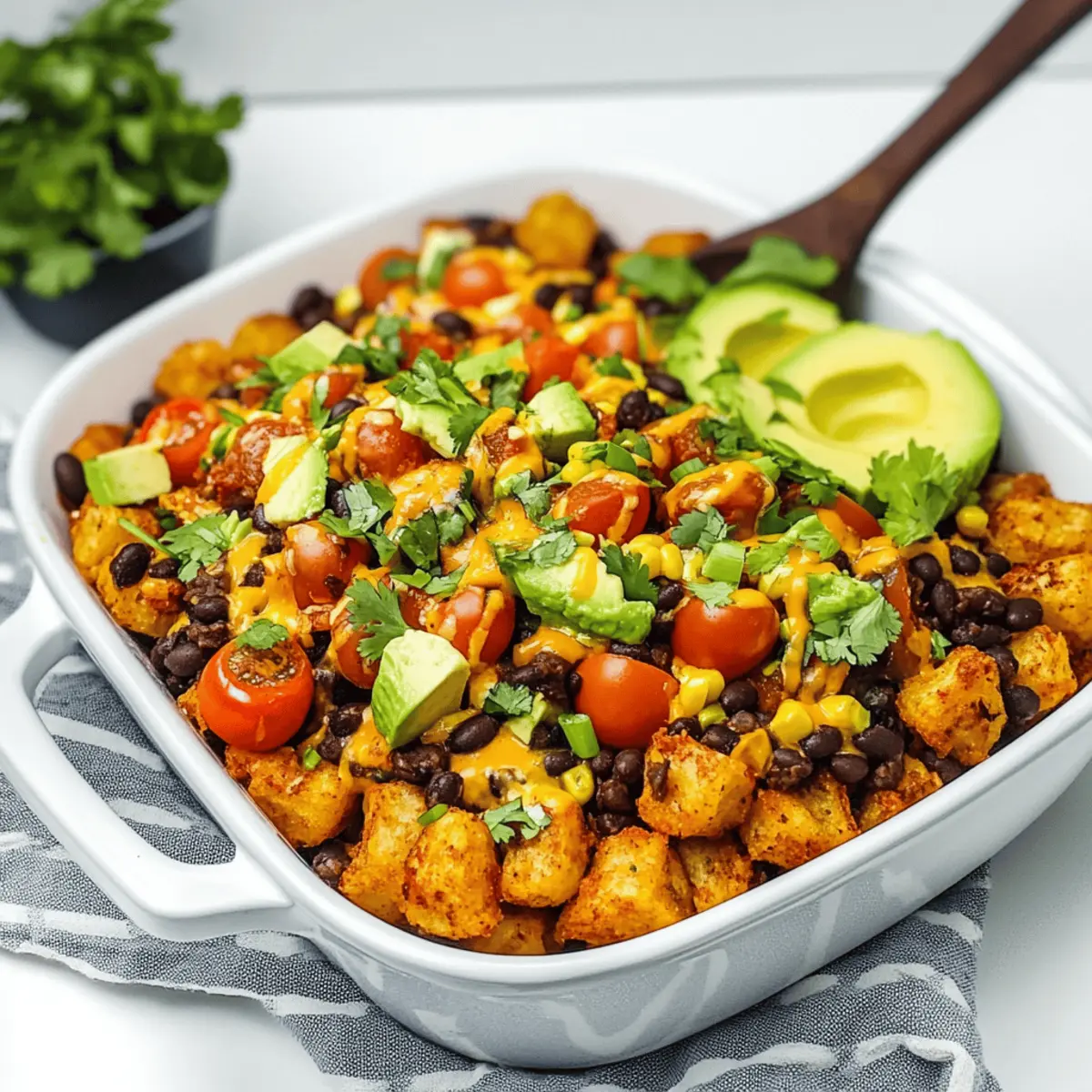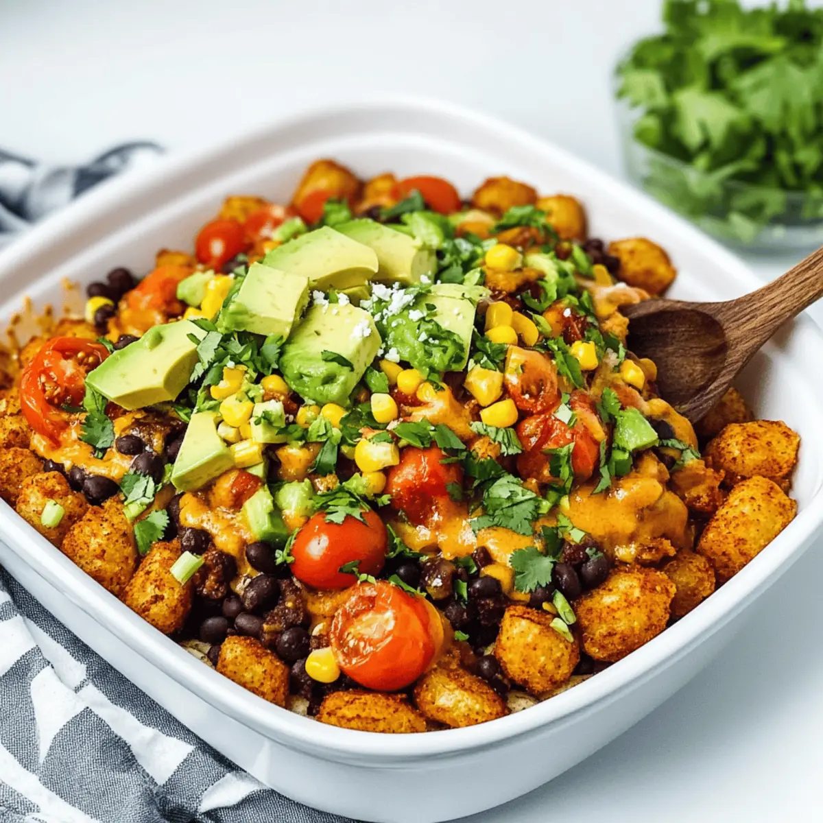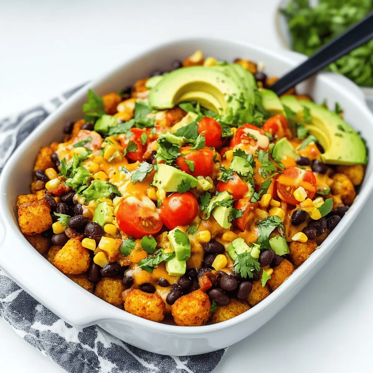 Jump to Recipe Print RecipeThe aroma of crispy tater tots wafts through my kitchen, instantly transporting me to game days filled with laughter and excitement. Today, I’m whipping up a crowd-pleasing favorite: Vegan Totchos—crispy tater tot nachos topped high with flavorful, plant-based ingredients. Perfect for those nights when you need comfort food without any guilt, these delightful bites are not just easy to prepare but also meat-free and dairy-free, making them a go-to for everyone at the table. With a satisfying crunch, vibrant toppings, and a rich vegan cheese sauce, you might just forget they’re made without animal products! Can you resist such a mouthwatering dish? Let’s dive in and create something delicious together! Why Are Vegan Totchos So Irresistible? Crispy, Crunchy Heaven: These Vegan Totchos feature a base of golden tater tots that deliver a satisfying crunch in every bite. Loaded with Flavor: Topped with black beans, fresh tomatoes, and creamy avocado, these nachos erupt with mouthwatering tastes. Perfect for Any Occasion: Whether it’s game day or a cozy movie night, these totchos are your ultimate comfort food solution. Quick and Easy Preparation: With a simple 30-minute bake time, you’ll have a crowd-pleaser ready in no time! Customizable Goodness: Feel free to swap ingredients—try adding Vegan Carrot Lox for a unique twist or even some homemade salsa for an extra flavor kick. Family-Friendly Fun: Everyone will gather around the table for these nacho-inspired bites, making them the perfect addition to your next party! Vegan Totchos Ingredients Get ready to create a scrumptious bowl of Vegan Totchos with this ingredient list! For the Base Frozen Vegan Tater Tots – The star of the dish; ensure they are vegan for a guilt-free delight. For the Toppings Black Beans – Packed with protein and fiber, making them a solid meat replacement. Drain and rinse for the best flavor. Corn – Adds a sweet crunch and colorful pop; it’s optional but highly recommended! Cherry Tomatoes – Fresh and juicy, they brighten up the dish; grape tomatoes work well too as a substitute. Salsa – A must for flavor; use your favorite store-bought version or get creative with homemade. Vegan Cheese Sauce – Drizzle and melt this creamy goodness; consider whipping up a quick homemade batch for extra flavor. Avocado – Divine creaminess with every bite; if you’re in a pinch, guacamole offers a nice alternative. Green Onions – A fresh touch with a mild bite; you can swap them for chives or omit if desired. Cilantro – Provides a burst of herbal freshness; parsley can replace it for a milder flavor option. Step‑by‑Step Instructions for Vegan Totchos Step 1: Preheat the Oven Begin by preheating your oven to 425°F (220°C). This step is crucial to ensure that your frozen vegan tater tots bake evenly and achieve that perfect golden crispness. While the oven heats, gather your baking dish and all toppings to streamline the assembly process. Step 2: Bake the Tater Tots Spread the frozen vegan tater tots evenly in a 9 x 13 baking dish, ensuring they are in a single layer for optimal crispiness. Bake in the preheated oven for 15 minutes, until they are golden brown. Watch for a slight sizzle indicating that they are cooking perfectly. Step 3: Add the Toppings Remove the crispy tater tots from the oven and carefully layer black beans, corn, halved cherry tomatoes, salsa, and 3/4 cup of vegan cheese sauce over the tots. Take care to distribute the toppings evenly for a flavorful bite in every piece. This combination of ingredients will elevate your Vegan Totchos to a whole new level. Step 4: Bake Again Return the loaded dish to the oven and bake for an additional 12-15 minutes. Keep an eye on the tomatoes; they’ll begin to burst, releasing their juicy flavor into the mix. The vegan cheese sauce should melt beautifully, enveloping the toppings in a comforting layer. Step 5: Final Touches Once the baking time is complete, remove the dish from the oven and top your Vegan Totchos with diced avocado, sliced green onions, chopped cilantro, and any remaining cheese sauce. Allow the dish to cool slightly before serving hot, so the toppings meld perfectly without falling off. Expert Tips for Vegan Totchos Crispy Texture: For the best crunch, avoid overcrowding the tater tots on the baking sheet. Leave space between each tot to allow hot air to circulate. Layer Just Before Serving: To prevent sogginess, layer the avocado and other toppings right before serving. If you need to warm them up, do so gently in the oven. Boost the Flavor: Consider using a homemade vegan cheese sauce for a richer taste. Store-bought options are convenient but can lack the depth of flavor. Add Varieties: Experiment with different toppings like jalapenos or spicy salsa. These extras can enhance your Vegan Totchos and cater to diverse taste preferences. Make-ahead Tips: Prepare the toppings ahead of time and store them in the fridge. This way, assembling your Vegan Totchos becomes a breeze when hunger strikes. Vegan Totchos: Flavorful Customizations Feel free to get creative with these fantastic vegan totchos—there’s so much you can do to make them your own! Bean Swap: Replace black beans with pinto beans or lentils for a wholesome twist. These alternatives still pack a punch of protein and taste. Spicy Kick: Add sliced jalapenos or a drizzle of hot sauce for extra heat. This fiery twist elevates the flavors for those who enjoy a little spice in their snacks. Salsa Variation: Whip up a batch of homemade salsa tatemada for a delicious smoky and spicy flavor change. The additional depth will take your totchos to new heights! Sweet Potato Twist: Substitute traditional tater tots with sweet potato ones for a touch of sweetness. This swap not only adds a different flavor profile but also brings extra nutrients. Creamy Enhancer: Try using guacamole instead of avocado for an even richer topping. The creaminess of gua