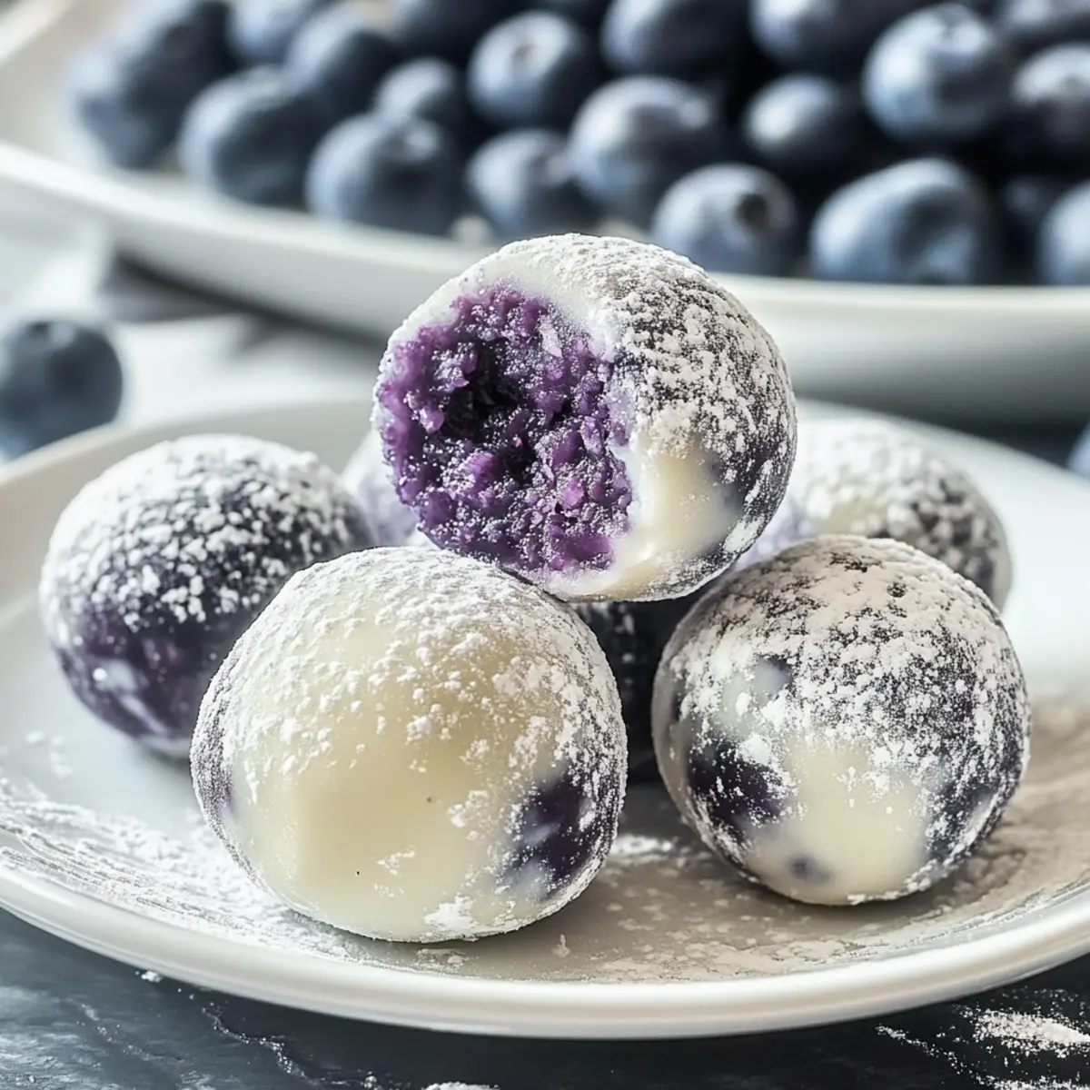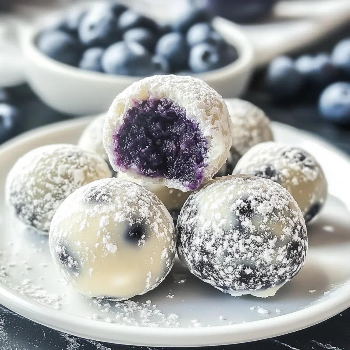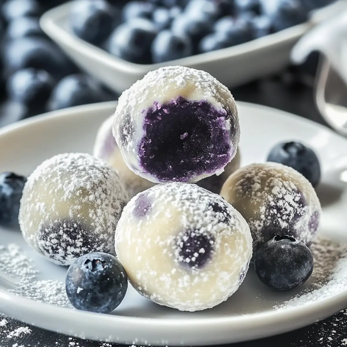 Jump to Recipe Print RecipeAs I stirred the creamy white chocolate, the sweet-tart aroma of blueberries filled my kitchen, instantly transporting me to a sun-kissed summer afternoon. These White Chocolate Blueberry Truffles are more than just a dessert; they’re a celebration of flavor that’s surprisingly easy to create—and they’re gluten-free! With a simple process that even beginner bakers can master, you’ll be able to impress guests or treat yourself in just a few steps. Not only do they make for a gorgeous gift, but their elegant presentation and delicious taste truly elevate any gathering. Curious how to whip up these delightful homemade treats? Let’s dive in! What Makes These Truffles Irresistible? Simplicity at Its Best: This recipe is incredibly easy to follow, allowing anyone, even novice bakers, to create gourmet treats at home. Gourmet Flavors: The perfect harmony of creamy white chocolate and tart blueberries makes every bite a delightful experience that’s sure to impress. Versatile Ingredients: Whether you use fresh blueberries or blueberry powder, this recipe adapts beautifully, making it suitable for various occasions. Elegant Presentation: Coated in a delicate layer of powdered sugar, these truffles look as stunning as they taste, perfect for gifting or special events. Quick to Make: Whip up a batch in a flash, offering a delicious dessert option without spending hours in the kitchen—ideal for spontaneous gatherings! Get ready to enchant your guests and elevate your dessert game with these delightful White Chocolate Blueberry Truffles that are simpler and tastier than you might think! White Chocolate Blueberry Truffles Ingredients • Here’s what you’ll need to create these delightful treats: For the Truffle Mixture White Chocolate Chips – The main ingredient providing creaminess and sweetness; substitute with white chocolate bars if preferred. Unsalted Butter – Adds richness and smoothness; use salted butter for a lovely savory twist. Full-Fat Cream – Ensures a luscious ganache texture; coconut cream is a great dairy-free alternative. Blueberries (or Blueberry Powder) – Delivers fruity flavor and natural sweetness; frozen blueberries work just as well if fresh are unavailable. For the Coating Powdered Sugar – Coats the truffles for a sweet finish; you can use cocoa powder for a different coating flavor that adds depth. Now that you’re equipped with the ingredients, you’re just a few steps away from making your own mouthwatering White Chocolate Blueberry Truffles! Step‑by‑Step Instructions for White Chocolate Blueberry Truffles Step 1: Prepare Blueberry Mixture In a medium saucepan, combine fresh blueberries with full-fat cream and unsalted butter over medium heat. Gently simmer for about 2 minutes until the berries soften and release their juices. If using blueberry powder, warm the cream first, then add butter followed by the powder, stirring until mixed and simmering for 2 minutes. Step 2: Blend Mixture Using an immersion blender, puree the heated blueberry mixture until smooth and creamy, ensuring there are no lumps remaining. This silky puree will be combined with the melted white chocolate, creating the wonderful filling for your White Chocolate Blueberry Truffles. Step 3: Check Temperatures Before combining the mixtures, ensure both the blueberry puree and melted white chocolate are at similar warm temperatures—ideally around 100°F (38°C). This warmth helps them blend smoothly and prevents the chocolate from seizing when mixed with the blueberry puree. Step 4: Melt White Chocolate In a double boiler, melt the white chocolate chips gently, stirring continuously. Monitor the temperature carefully, ensuring it doesn’t exceed 105°F (40°C) to maintain its texture and avoid separation. Remove from heat once fully melted, glossy, and smooth. Step 5: Combine Mixtures Gradually pour the blueberry puree into the melted white chocolate, using a spatula to stir gently but thoroughly until the two mixtures are completely blended and homogenous. The color should be a gorgeous lavender hue, combining the rich creaminess of chocolate with fruity undertones. Step 6: Chill Mixture Transfer the combined mixture into a sealed container and refrigerate for 2–3 hours, or overnight for best results. Stir occasionally as it thickens to ensure an even texture, making it easier to scoop and shape the truffles later. Step 7: Form Truffles Once chilled and firm, scoop out tablespoons of the mixture and roll them into 1-inch balls using your hands. Try using a small cookie scoop for uniform size which will help your White Chocolate Blueberry Truffles look professional and uniform. Step 8: Coat Truffles Spread powdered sugar on a plate and roll each truffle ball in it, ensuring an even coating. This sweet finish adds a lovely contrast to the rich creamy interior and enhances the overall presentation of your delightful treats. Step 9: Storage Place the powdered sugar-coated truffles in an airtight container in the refrigerator for safe keeping. They can be enjoyed fresh for up to a week or frozen for longer storage—just remember to thaw for a short time before savoring these scrumptious White Chocolate Blueberry Truffles! White Chocolate Blueberry Truffles Variations Customize your truffles to create a delightful experience that’s uniquely yours! Fruit Swap: Substitute blueberries with raspberries, strawberries, or even mango for exciting flavor twists that brighten each bite. Cocoa Coating: Instead of powdered sugar, roll the truffles in cocoa powder for a richer, semi-sweet finish that beautifully contrasts with the creamy interior. Nutty Delight: Add some chopped nuts like almonds or hazelnuts into the truffle mixture for added crunch and flavor depth. They’ll provide a delightful texture surprise with every bite! Zesty Citrus: Incorporate a splash of lemon or orange zest into the mixture for a refreshing citrus twist that enhances the flav