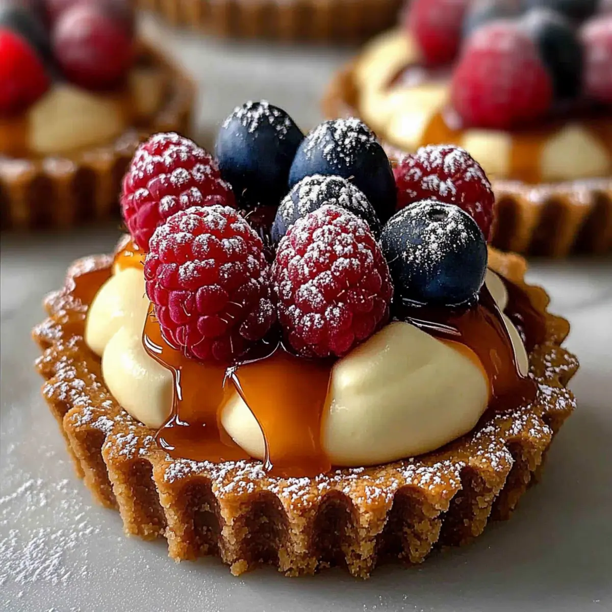 Before serving, take the tartlets out of the fridge and decorate them with fresh raspberries for a vibrant pop of color. Drizzle caramel sauce over the top for added sweetness and shine. If desired, add edible flowers to enhance the presentation, making your elegant dessert truly irresistible!