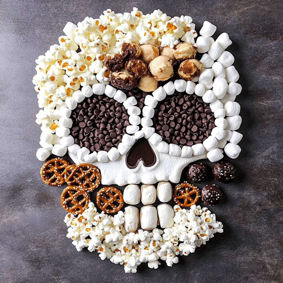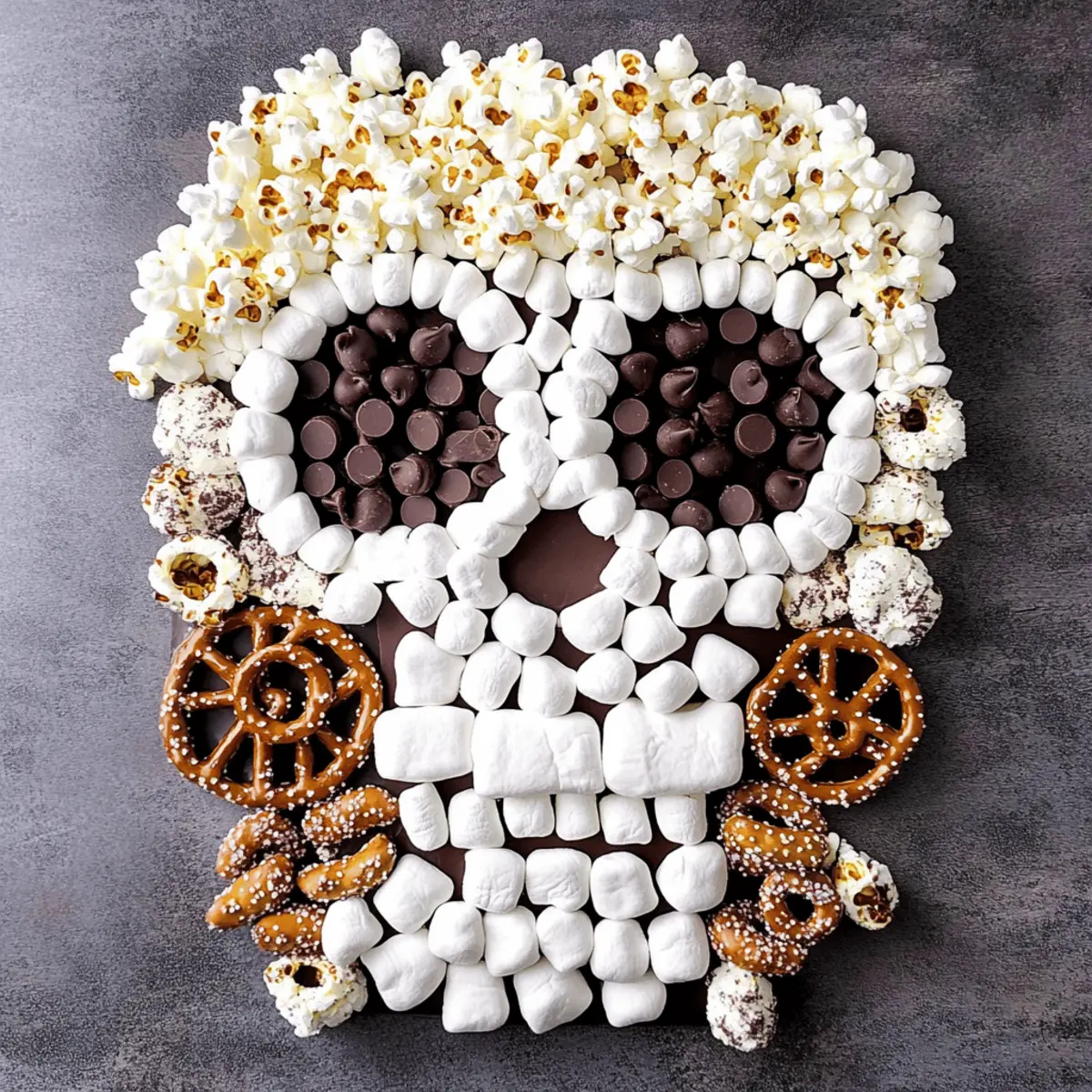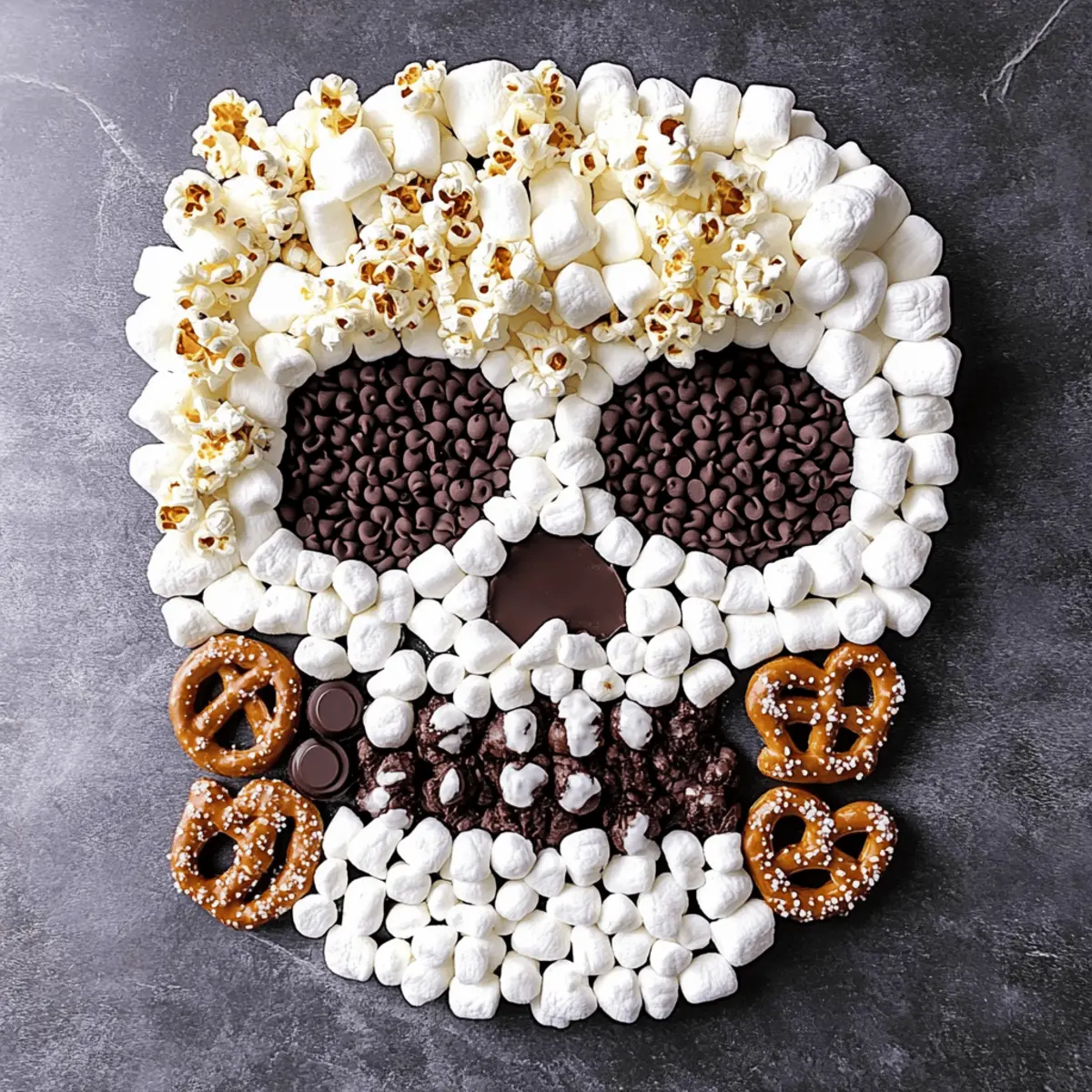 Assemble a delightful White Skull Snack Board in just 10 minutes for an eye-catching Halloween treat that combines sweet and salty flavors.